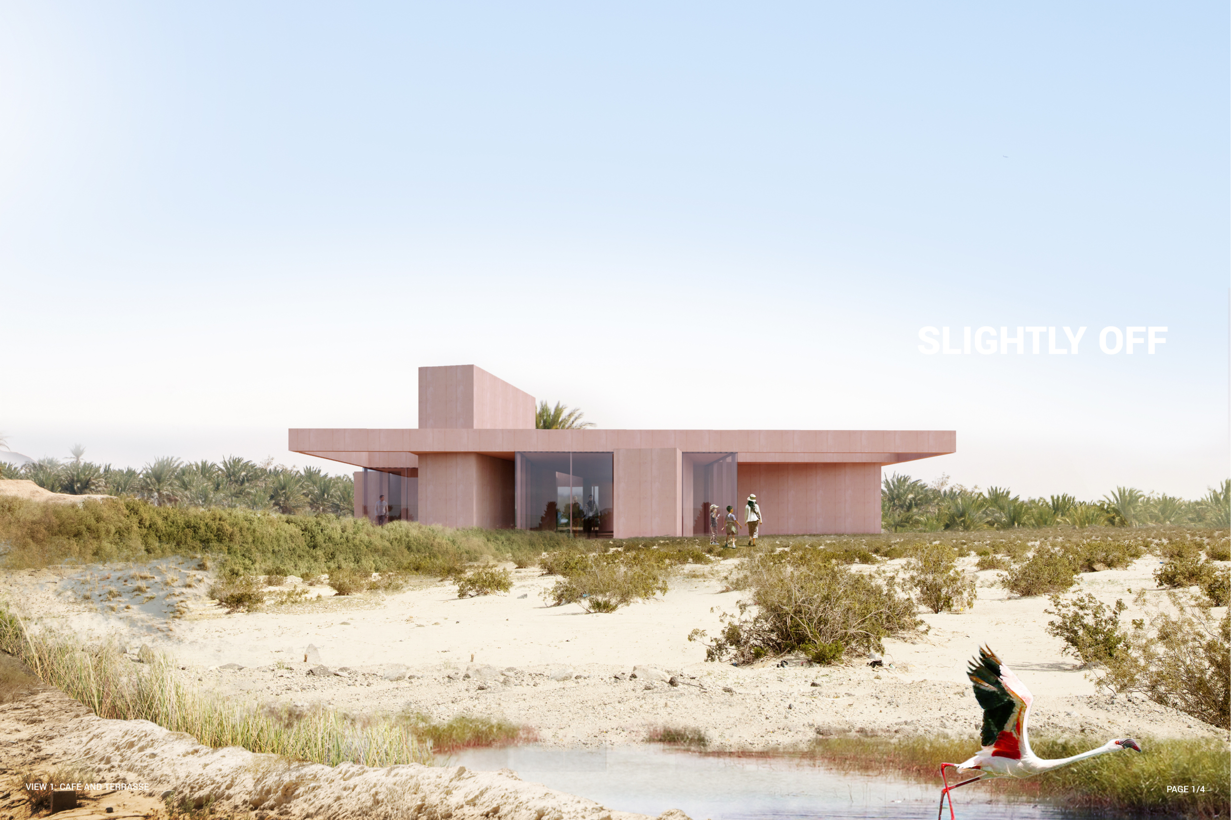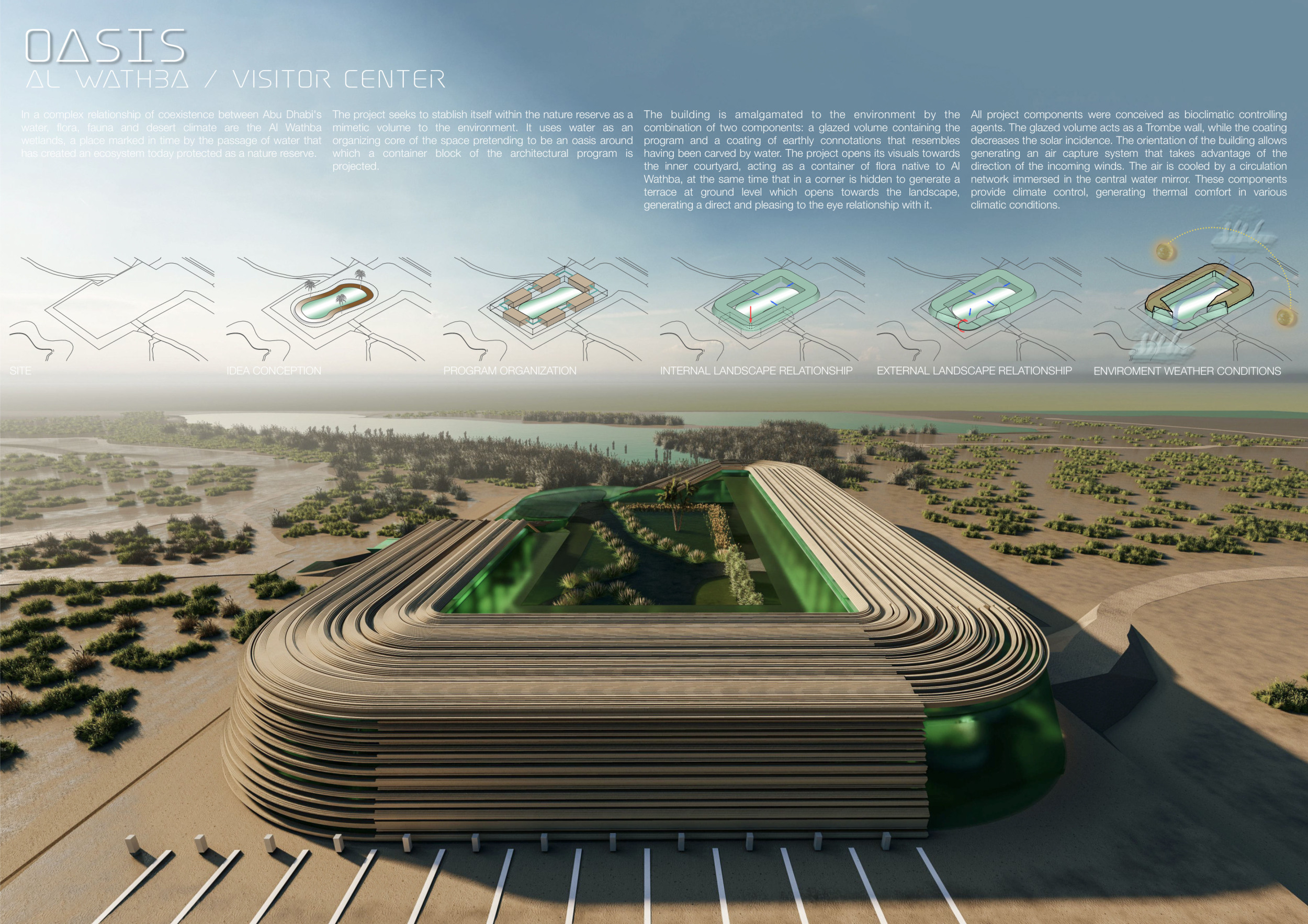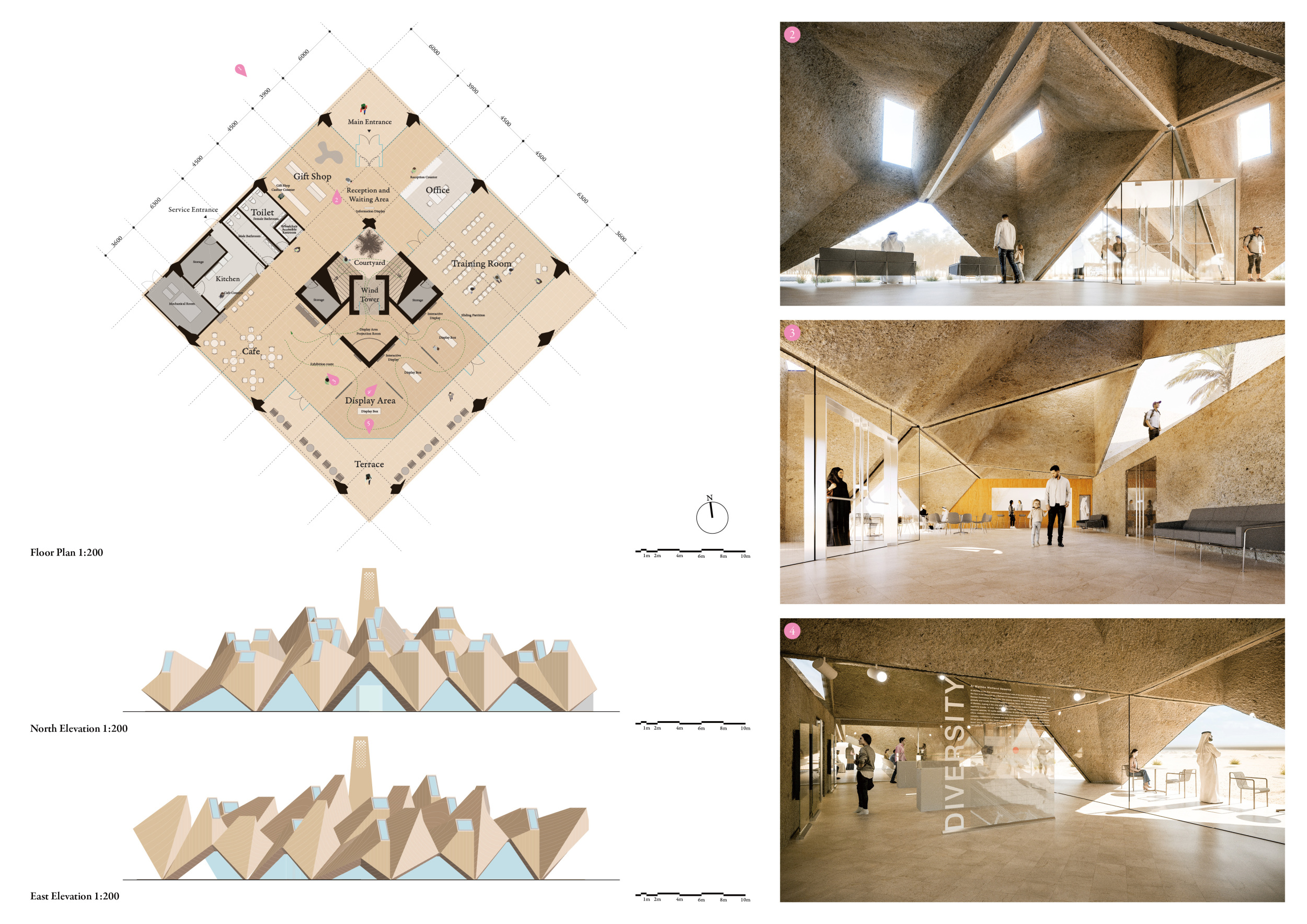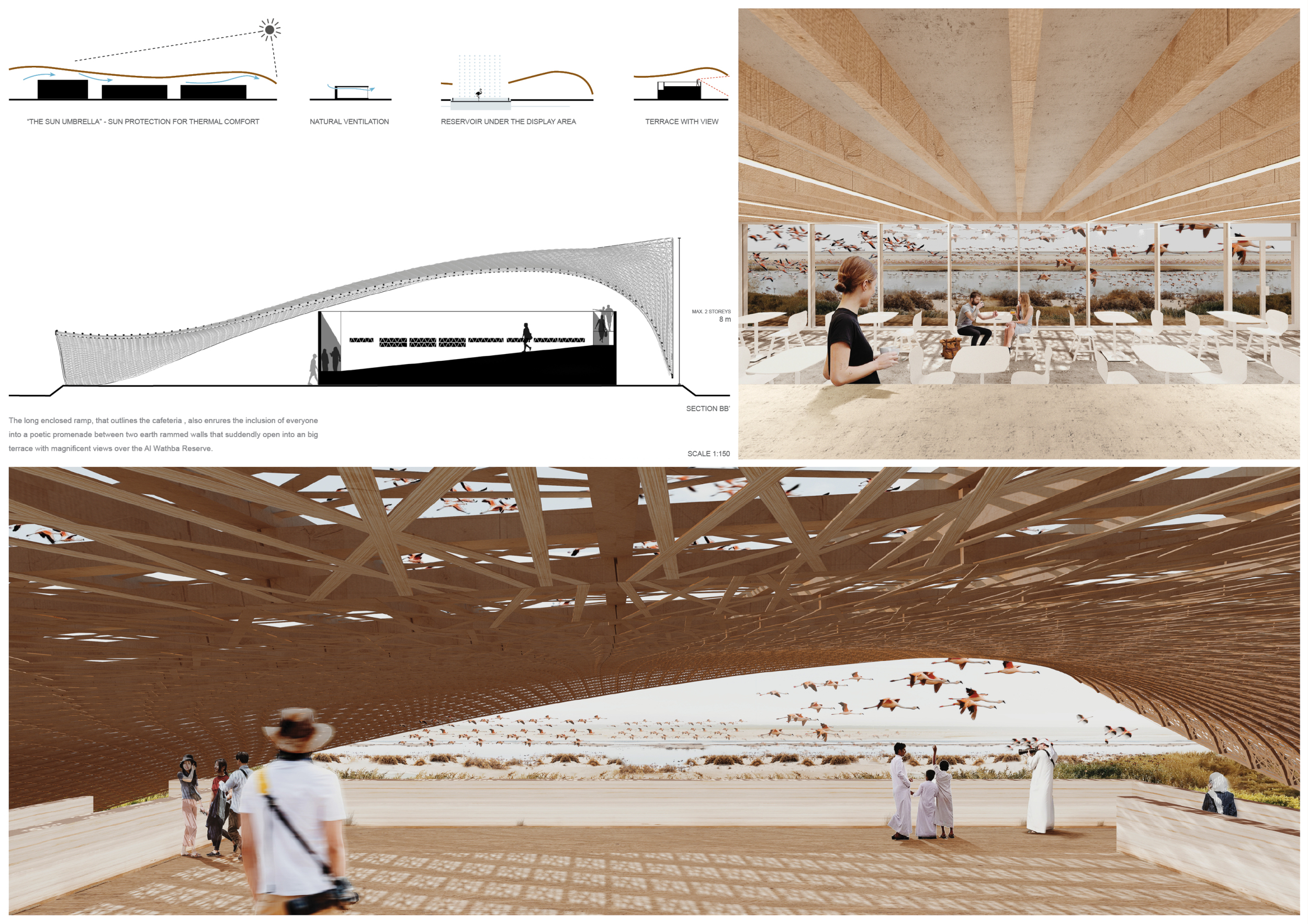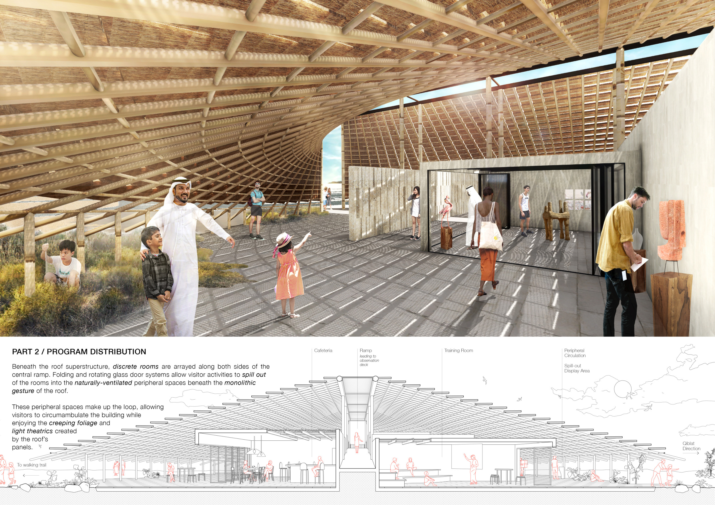 Competition participants were tasked with submitting concepts for a new visitor center, designed in balance with Al Wathba’s unique natural environment. The visitor center is to be programmed with facilities including an information center, cafe, terrace, souvenir shop, display area for specimens, training center, toilets, and a car park.