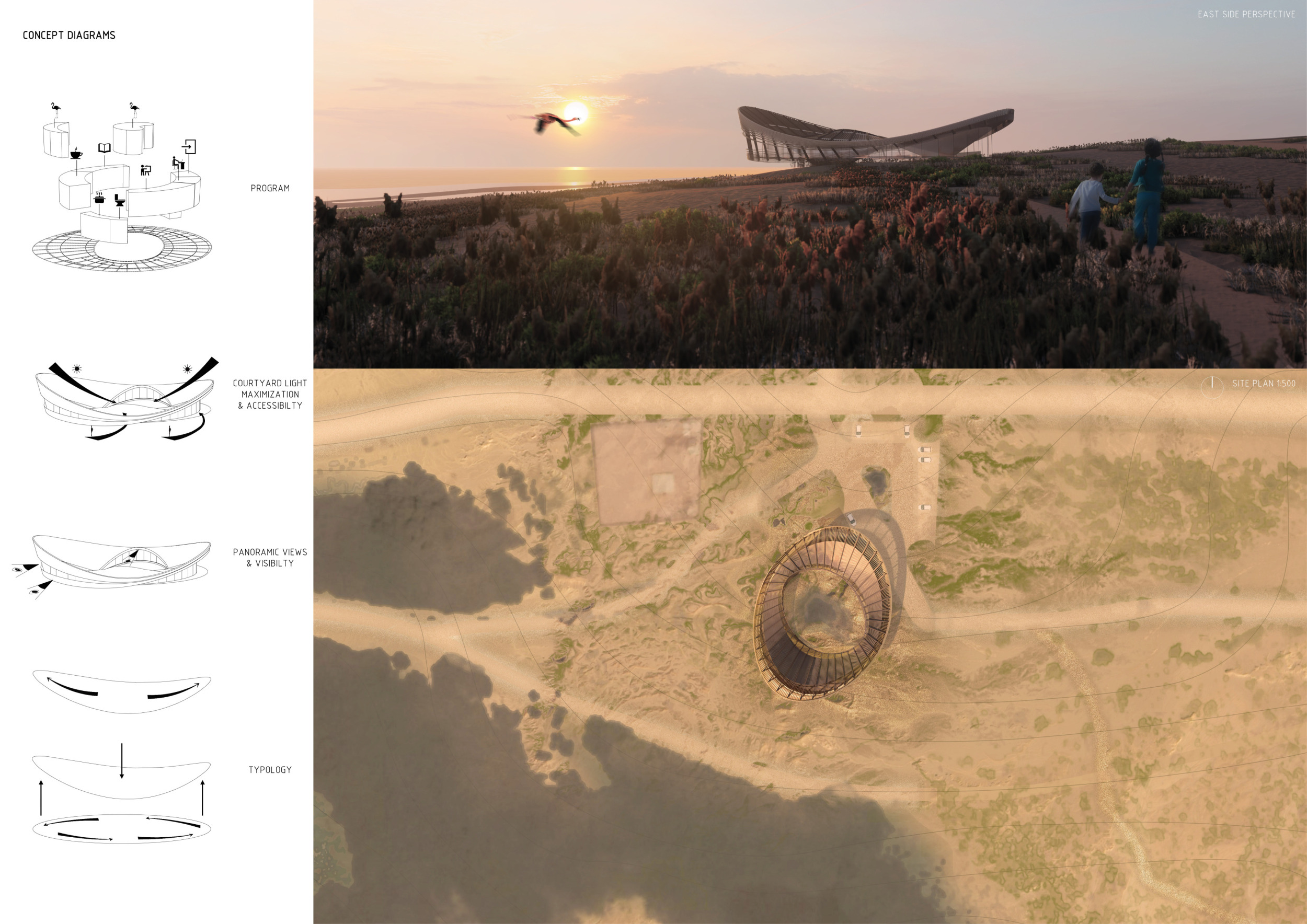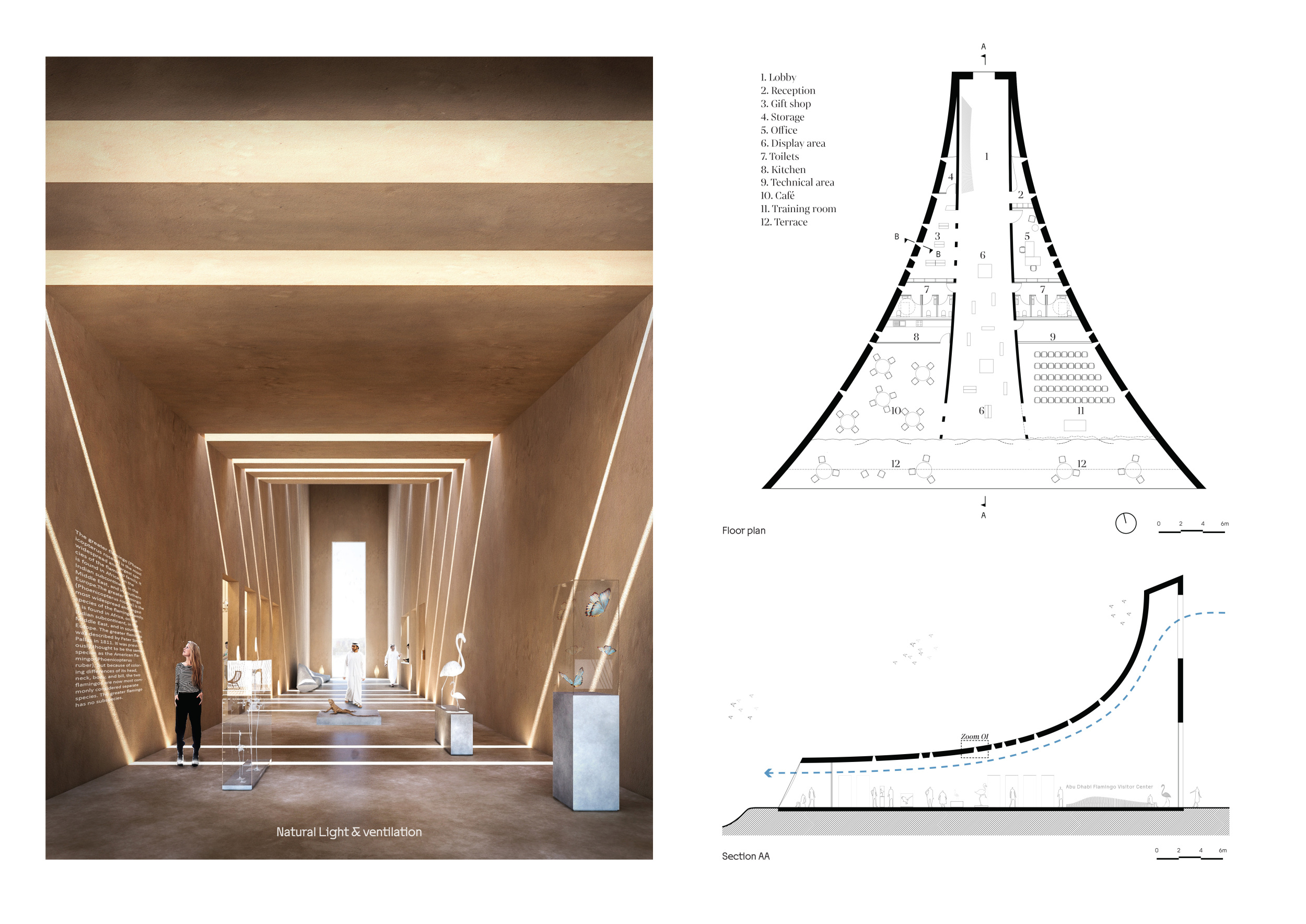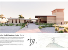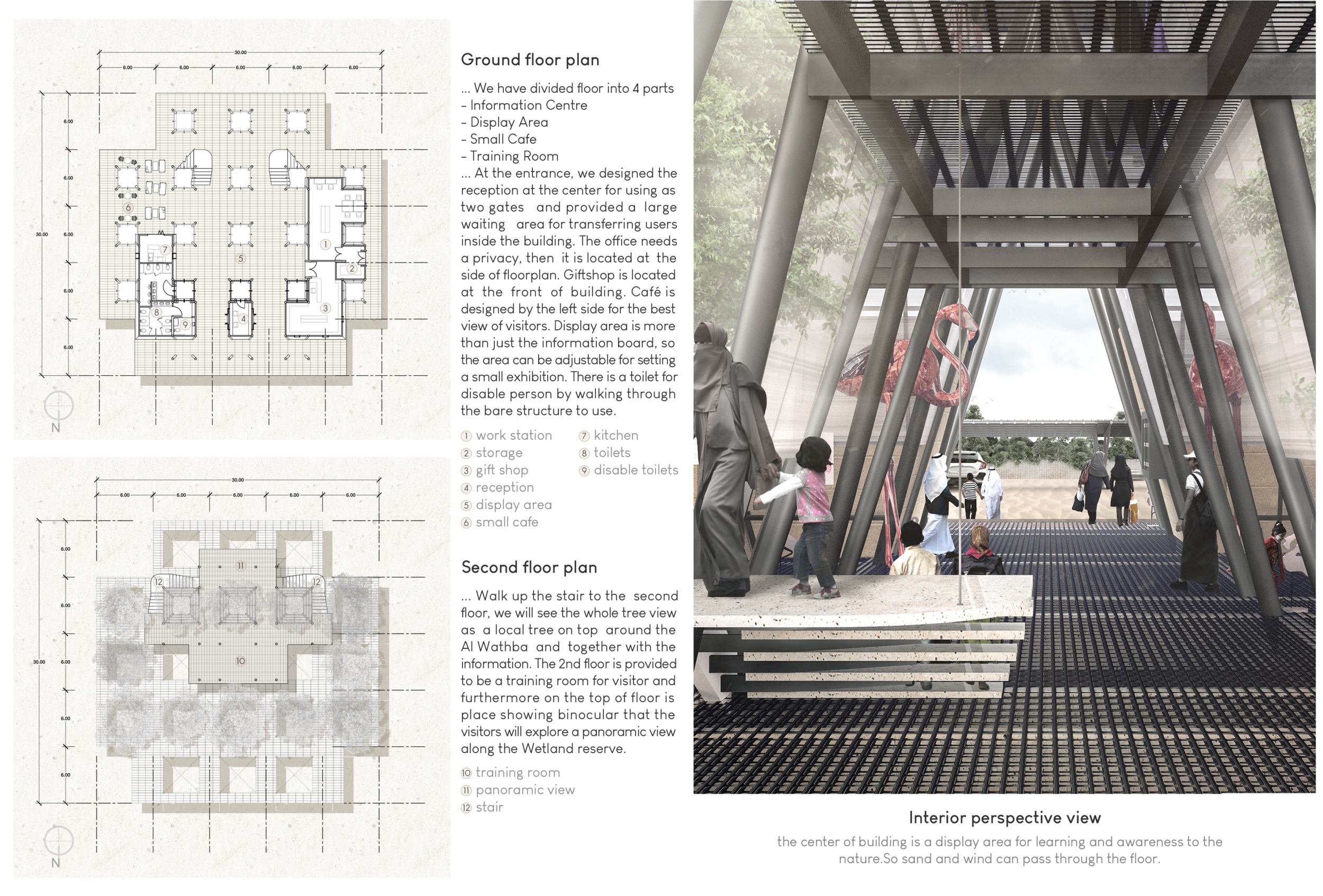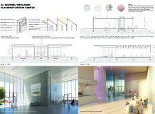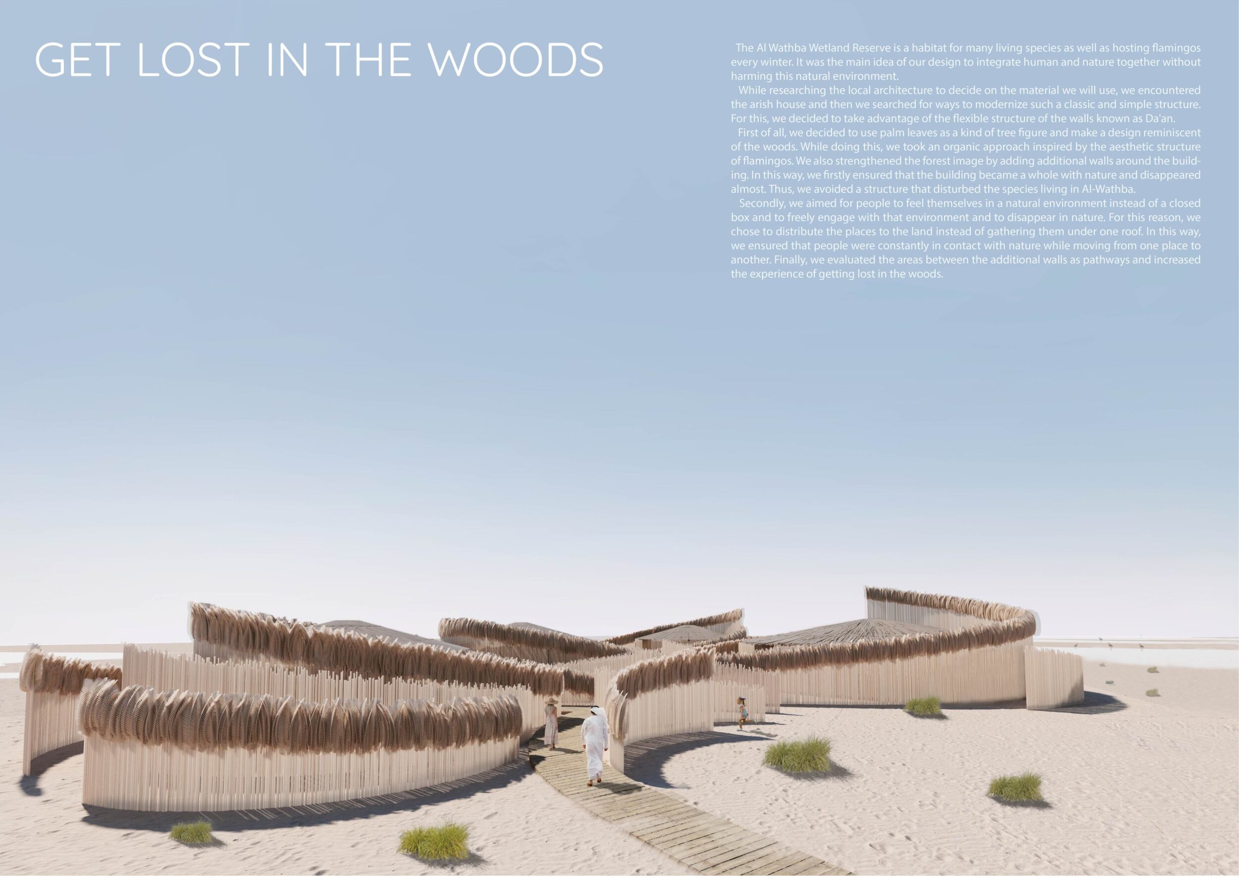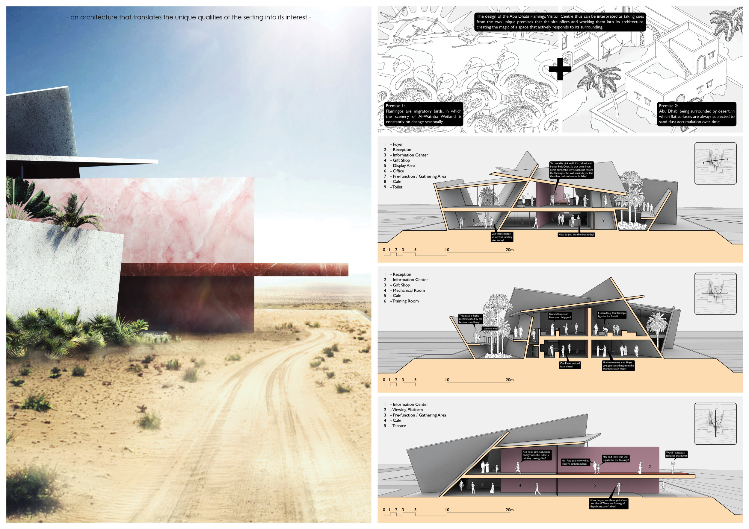 Competition participants were tasked with submitting concepts for a new visitor center, designed in balance with Al Wathba’s unique natural environment. The visitor center is to be programmed with facilities including an information center, cafe, terrace, souvenir shop, display area for specimens, training center, toilets, and a car park.