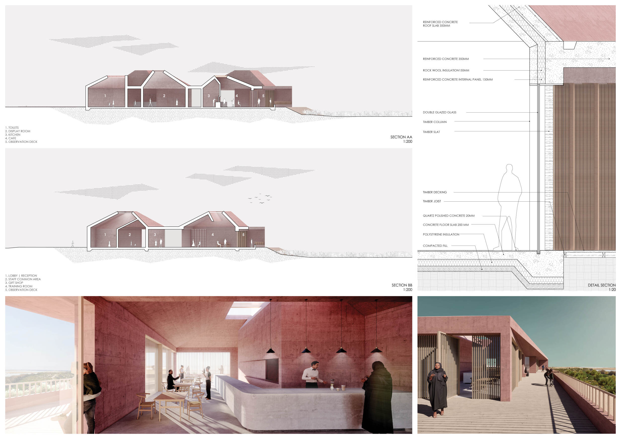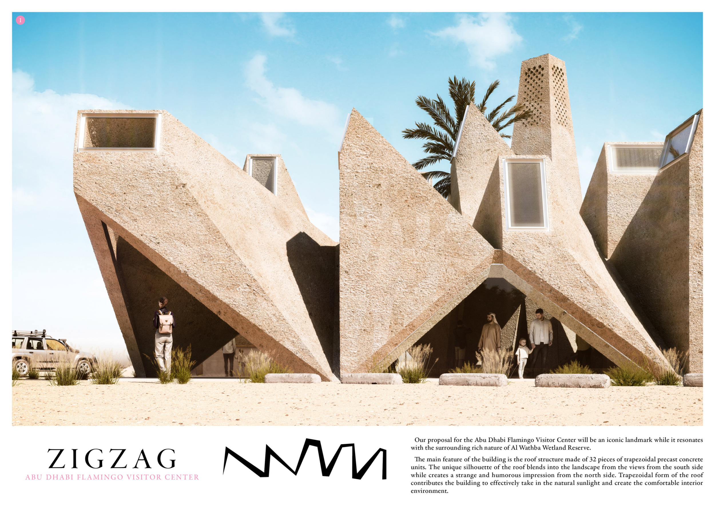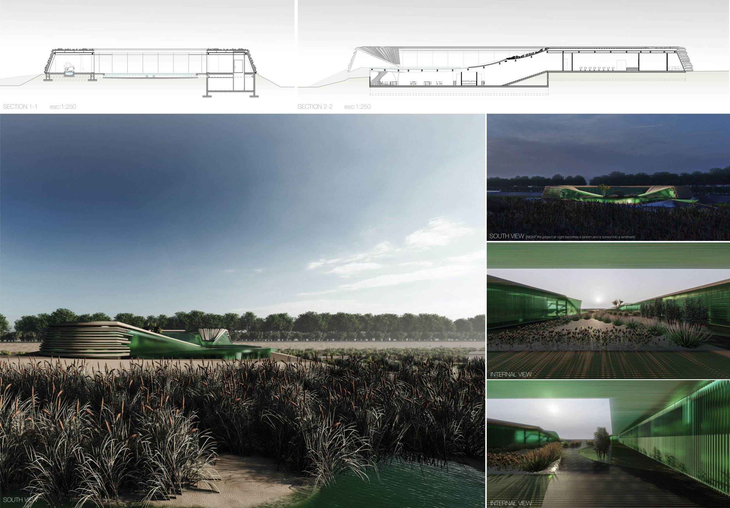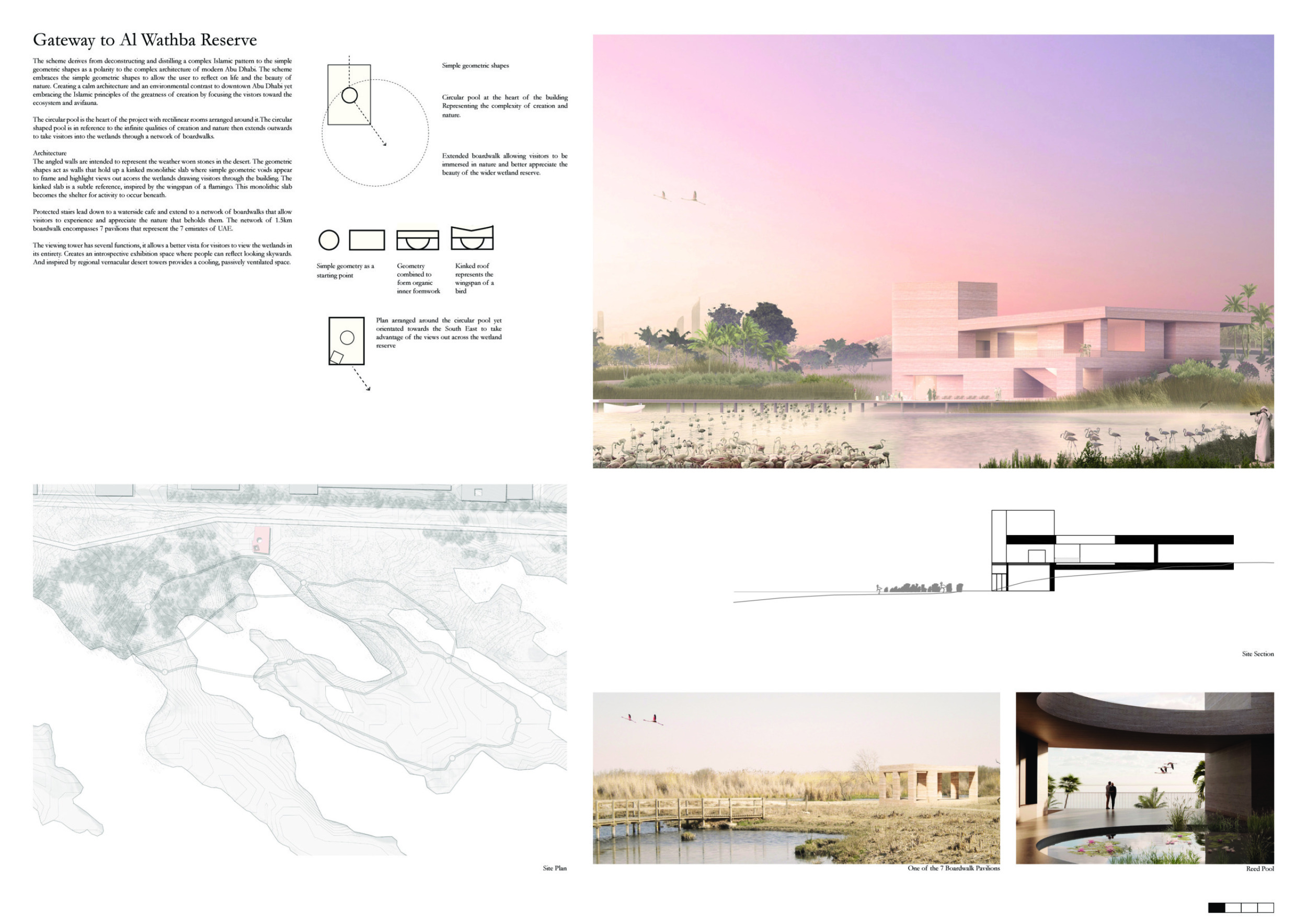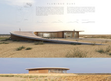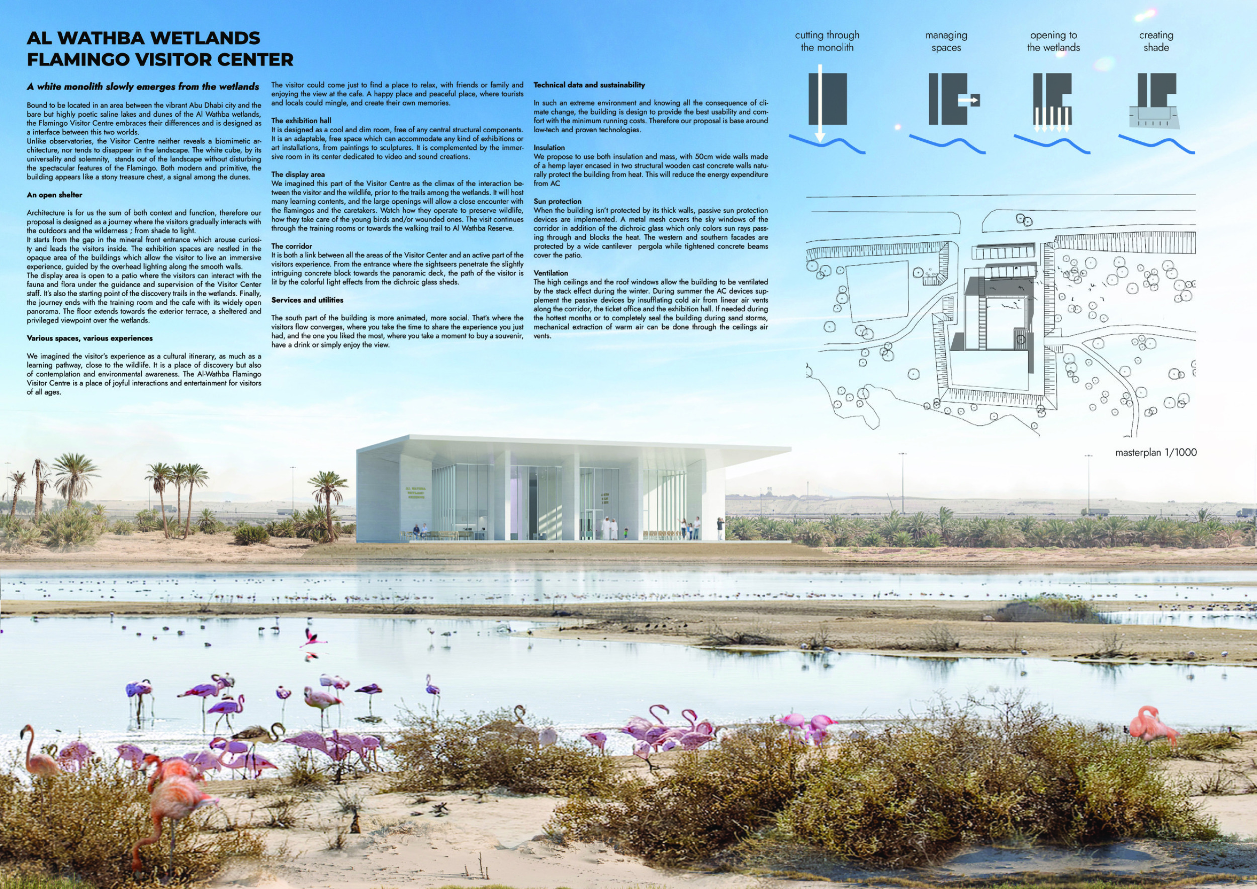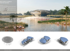 Competition participants were tasked with submitting concepts for a new visitor center, designed in balance with Al Wathba’s unique natural environment. The visitor center is to be programmed with facilities including an information center, cafe, terrace, souvenir shop, display area for specimens, training center, toilets, and a car park.