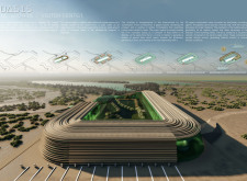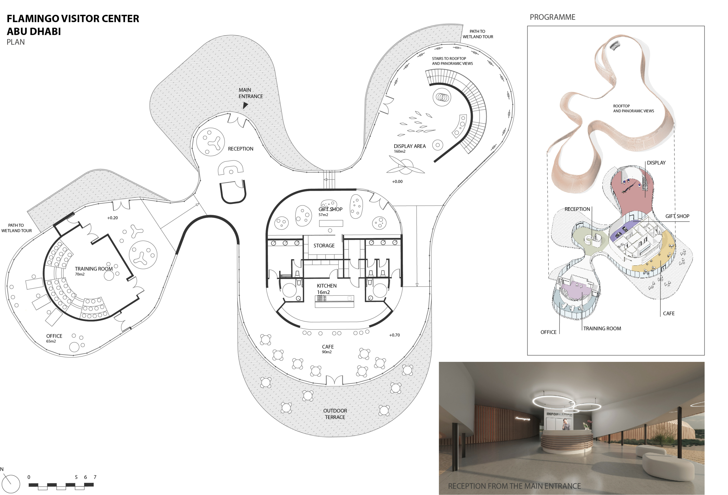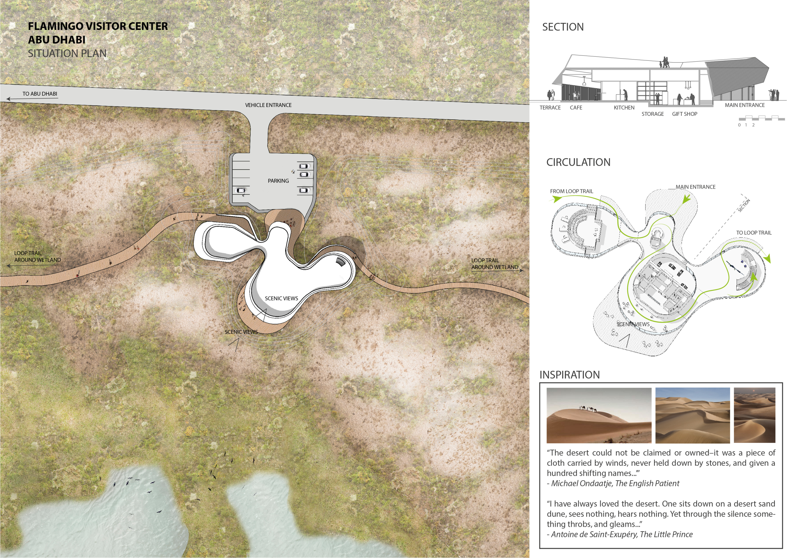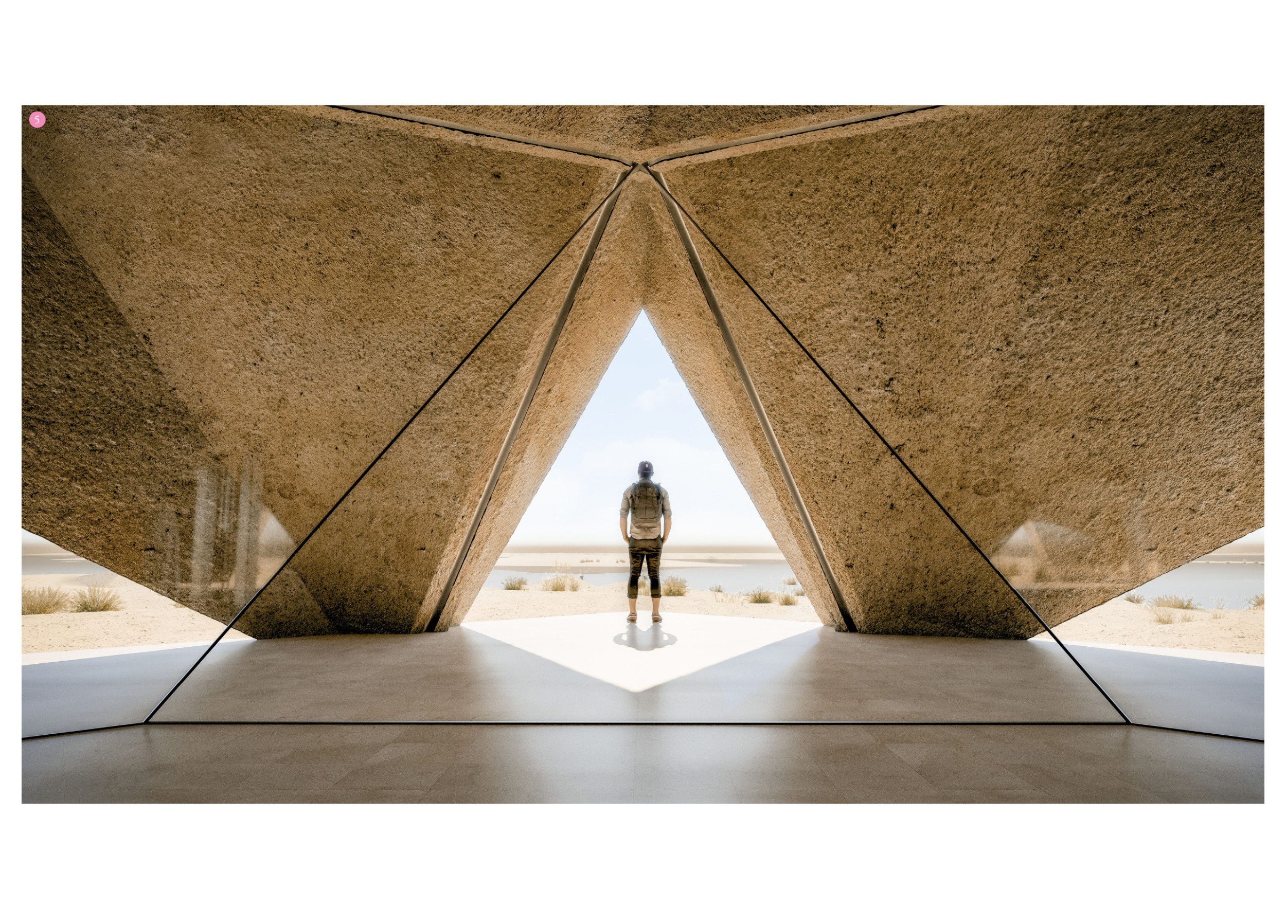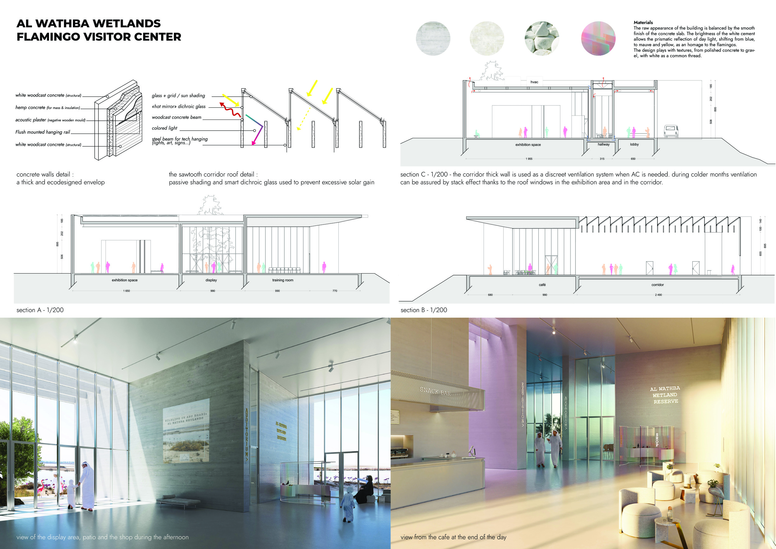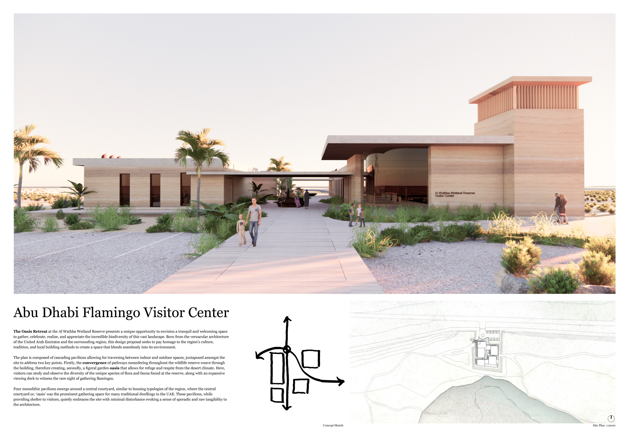 Competition participants were tasked with submitting concepts for a new visitor center, designed in balance with Al Wathba’s unique natural environment. The visitor center is to be programmed with facilities including an information center, cafe, terrace, souvenir shop, display area for specimens, training center, toilets, and a car park.