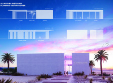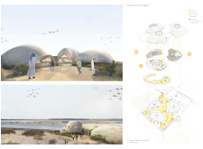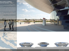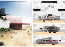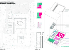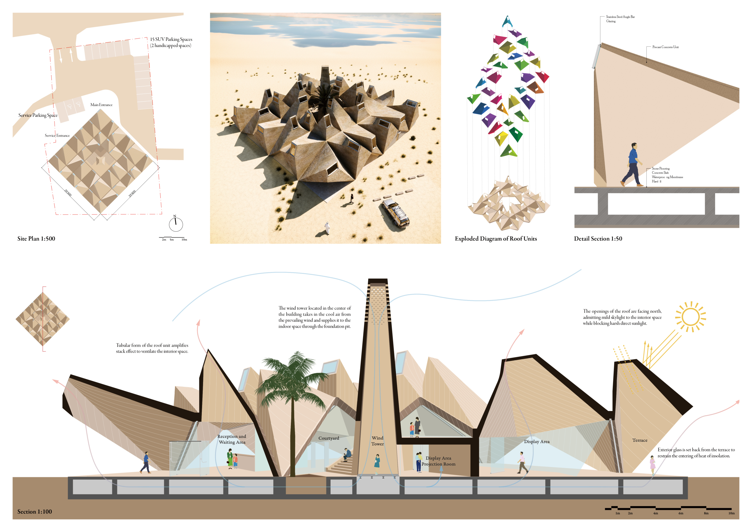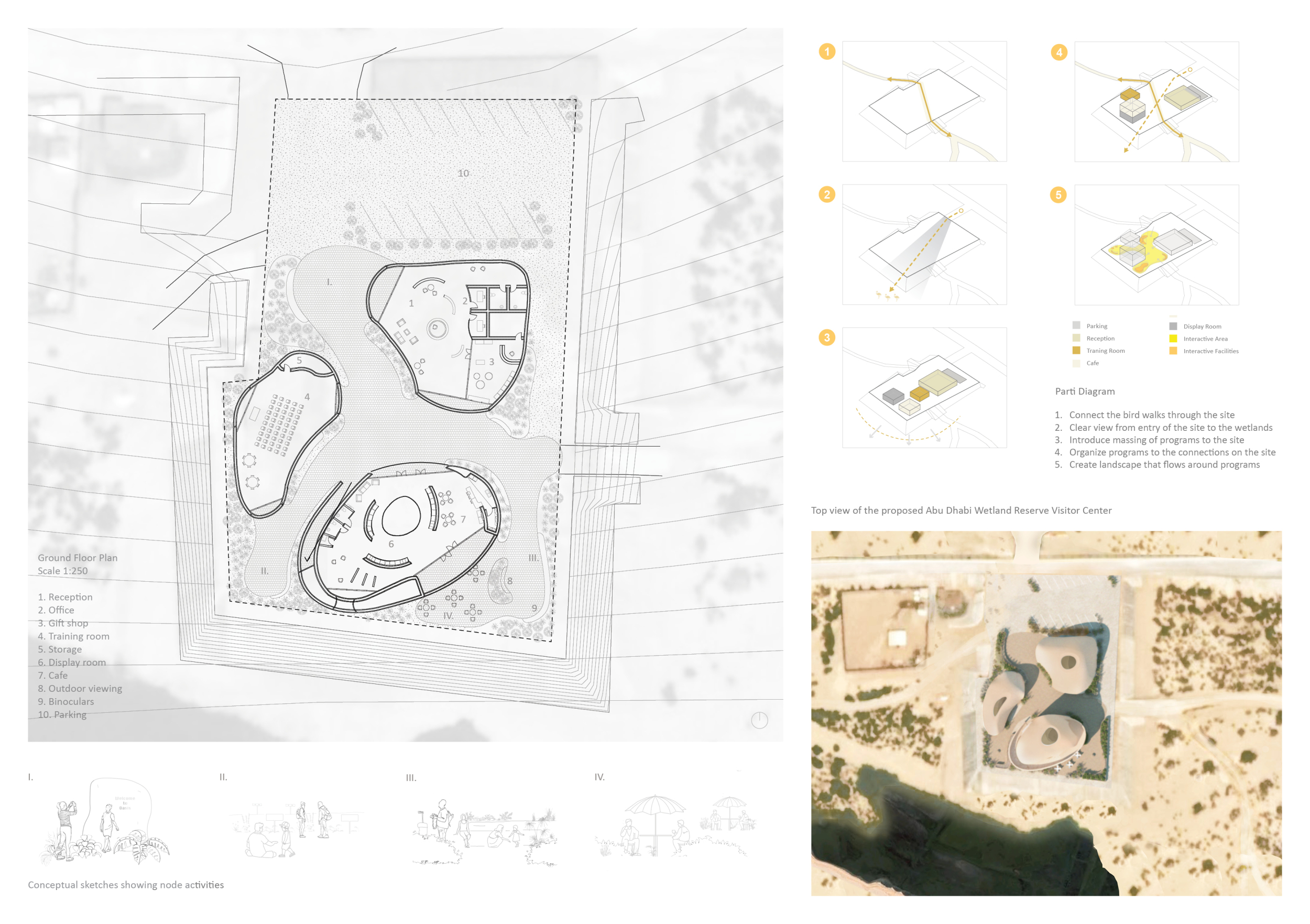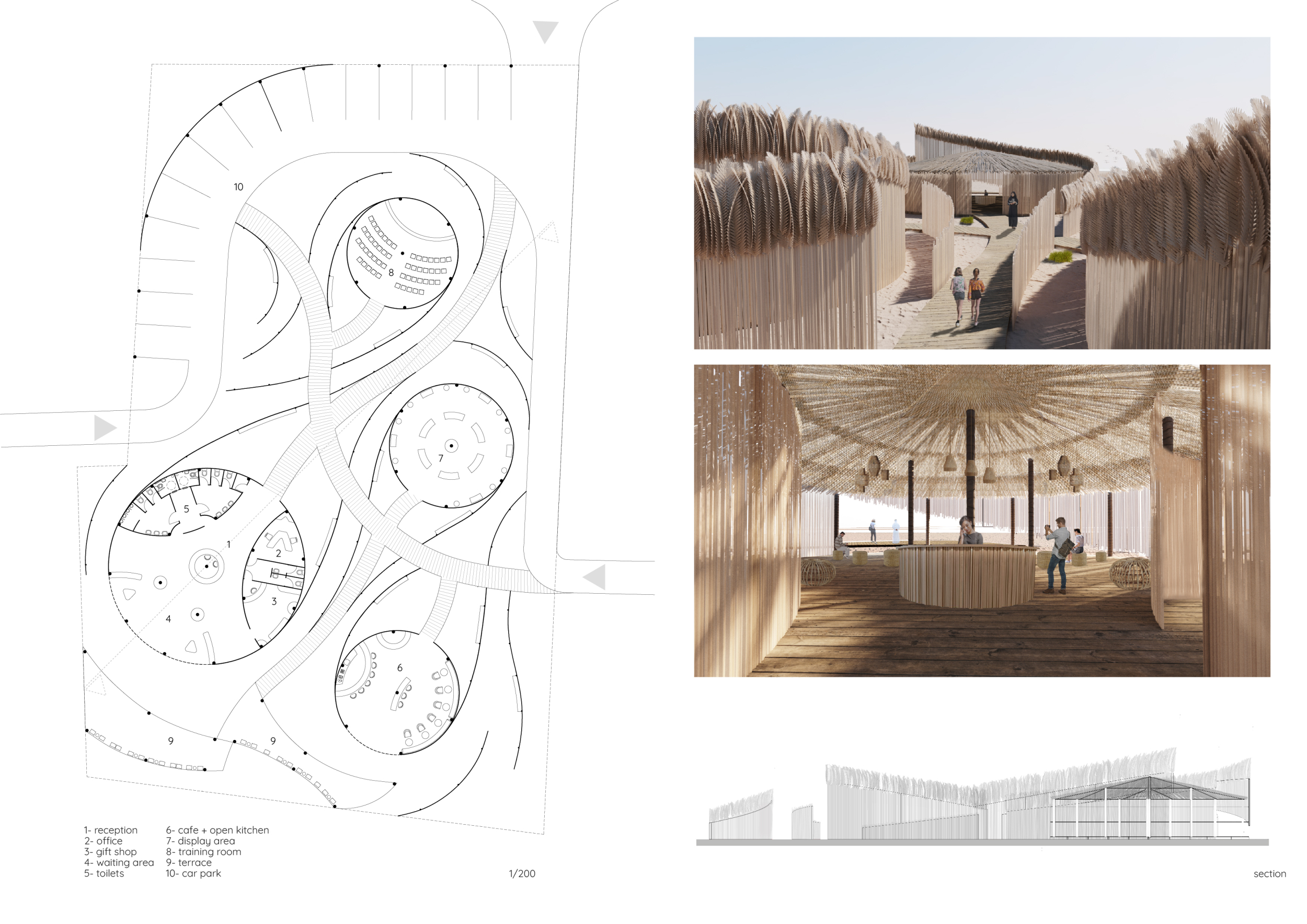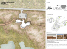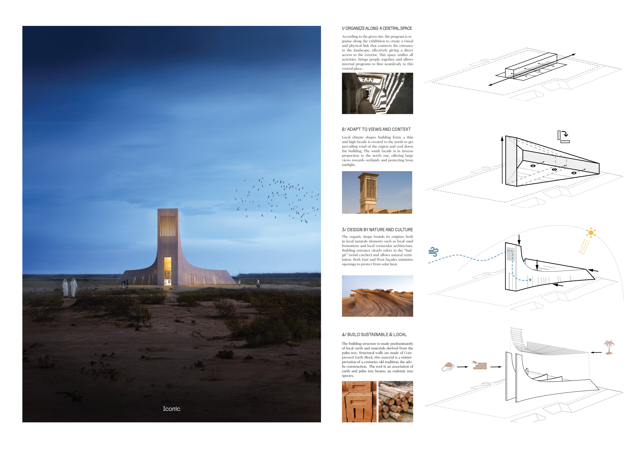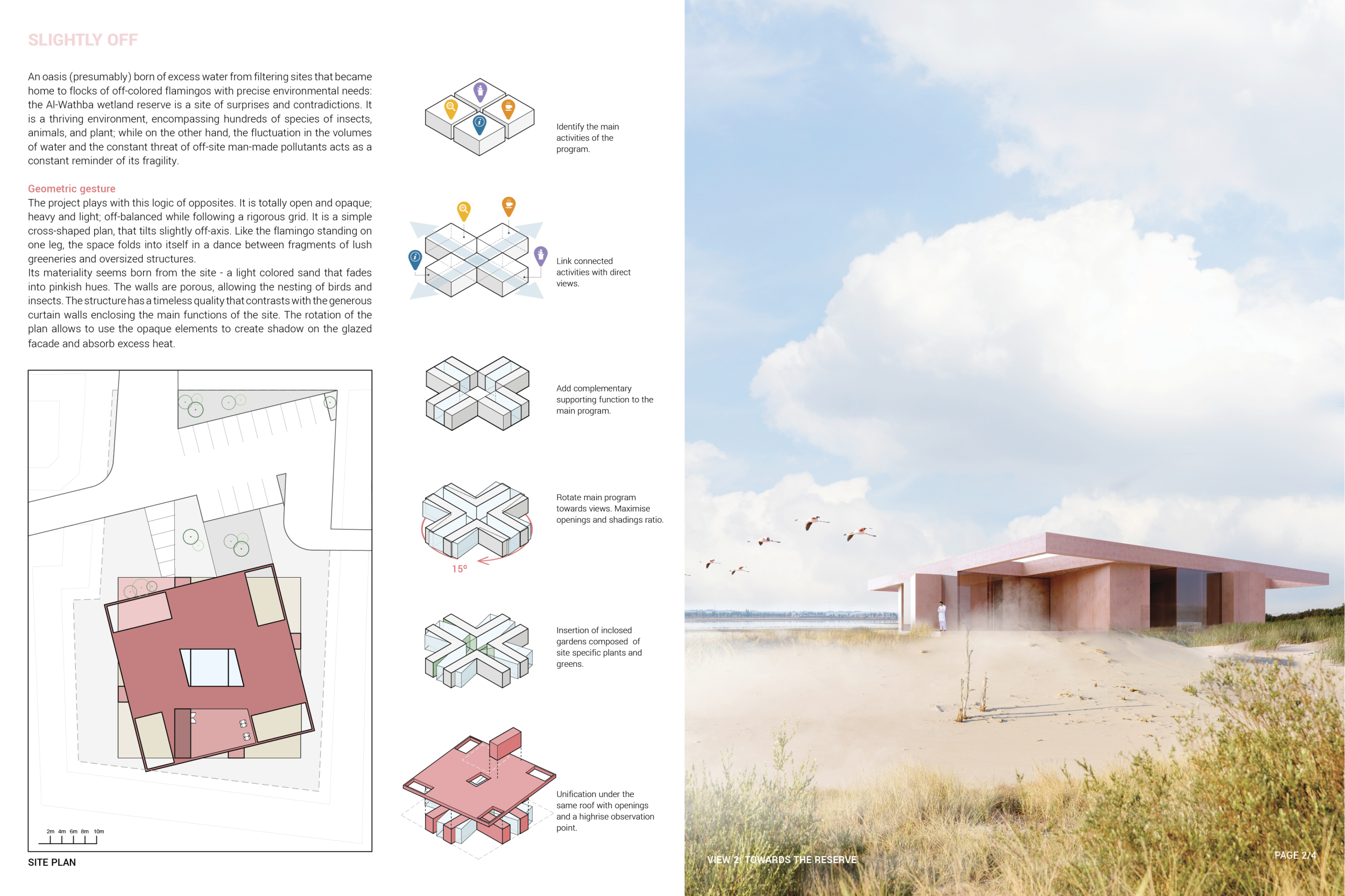 Competition participants were tasked with submitting concepts for a new visitor center, designed in balance with Al Wathba’s unique natural environment. The visitor center is to be programmed with facilities including an information center, cafe, terrace, souvenir shop, display area for specimens, training center, toilets, and a car park.