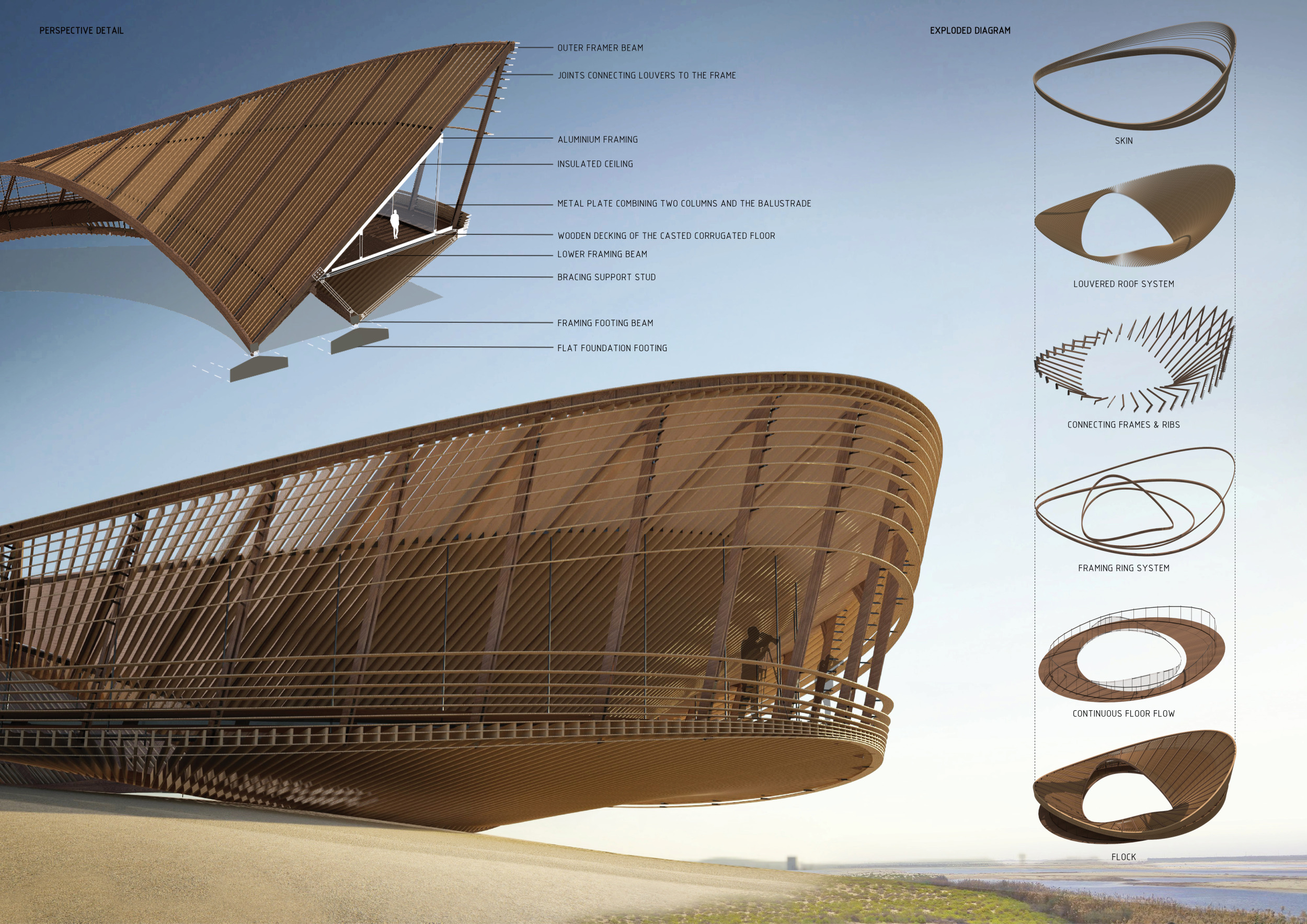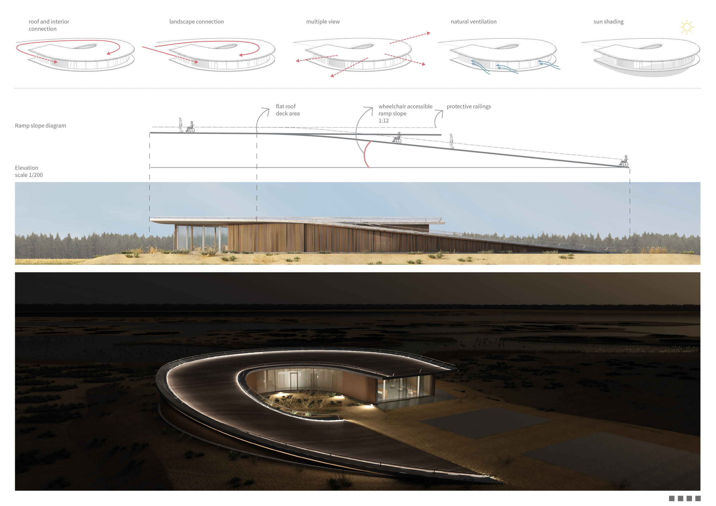 According to the jury, “The project's conceptual framework of "seeing while not being seen" is remarkable. The proposed structure behaves as part of a living habitat rather than a building.” The project achieves the status of being an icon in a subtle manner that blends in with the landscape. The structure does not dominate its surroundings.