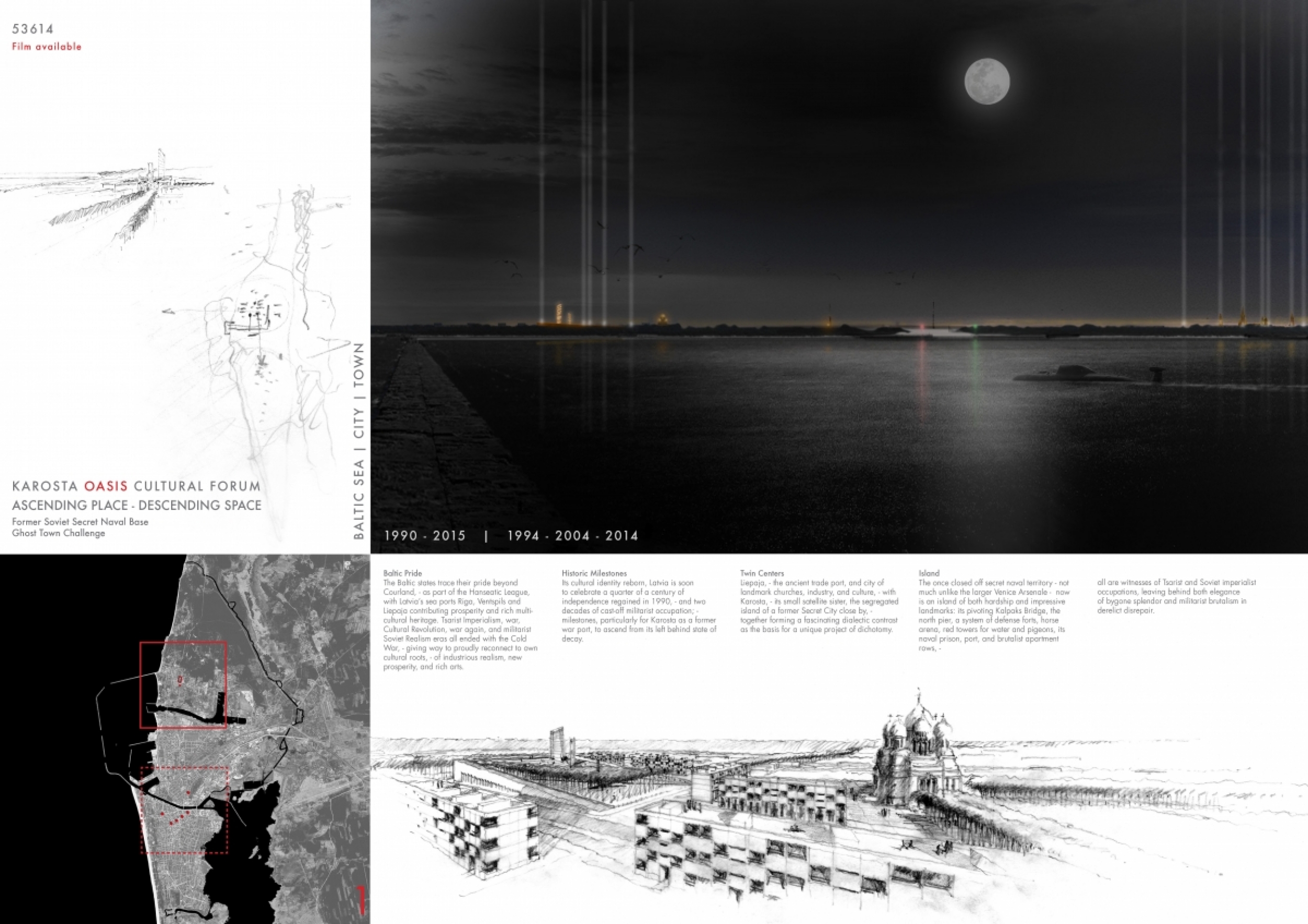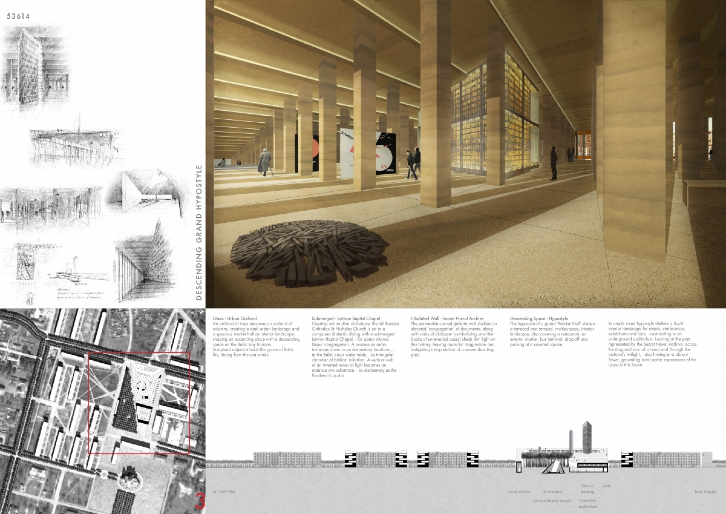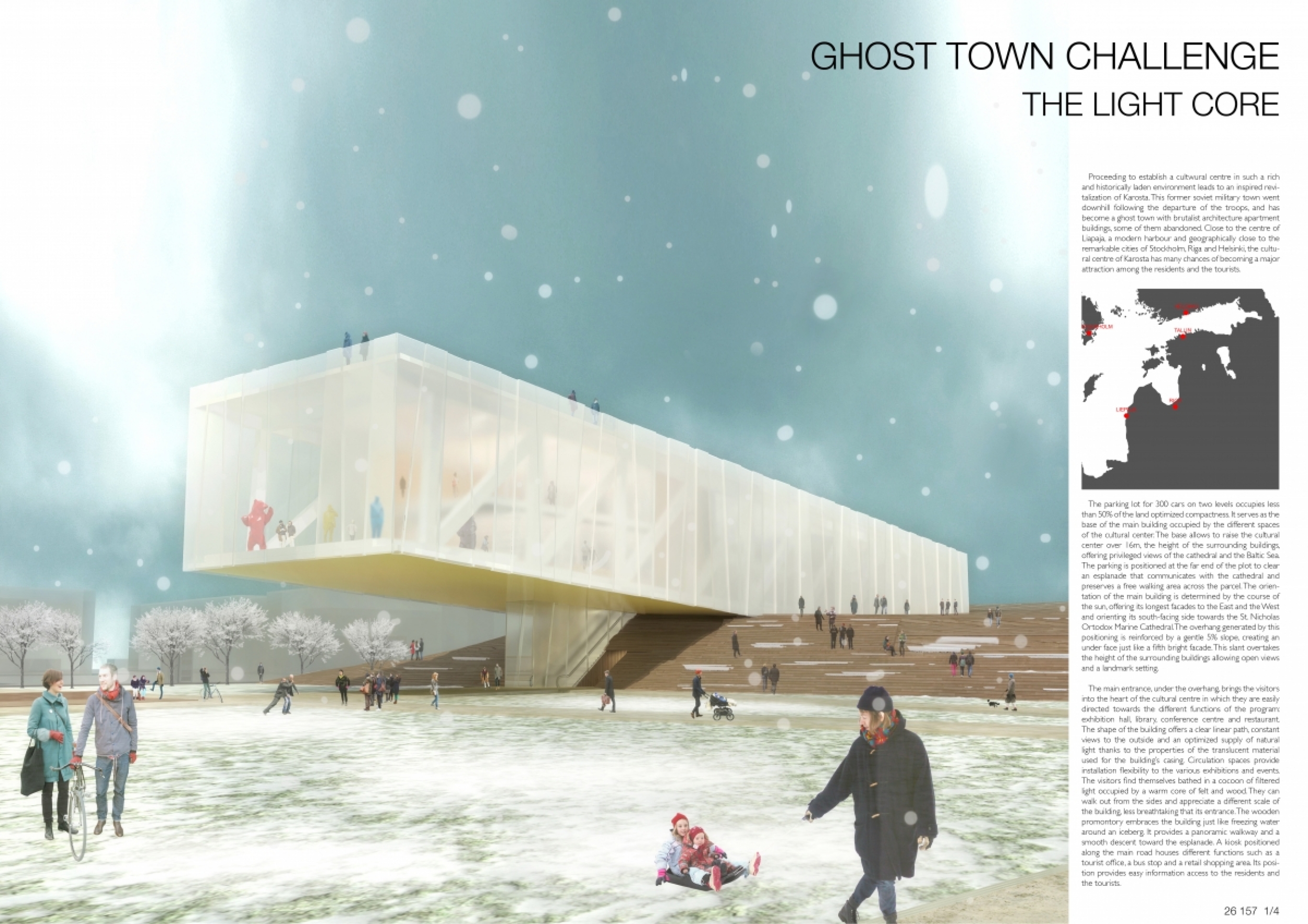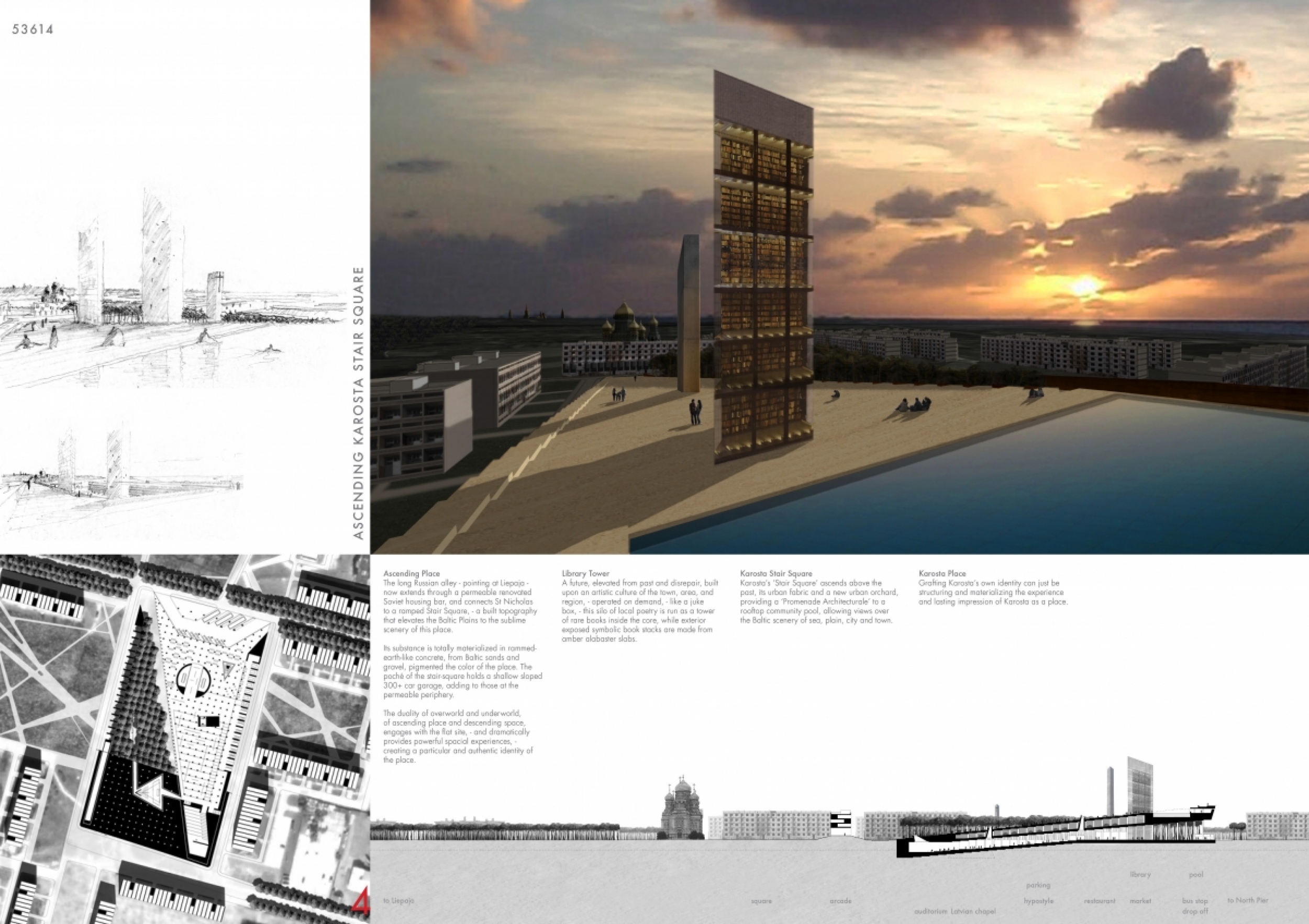 Over 160 submissions were received offering ideas for a multi-purpose cultural complex at the heart of Karosta, with the potential to generate increasing population and further tourism for this town of about 6,000 inhabitants situated 10 kilometres north of Liepaja. The requested program includes an exhibition hall, a library, conference centre, recreational areas, and spaces for retail and restaurants. Designers could choose to respect the City Council site requirements, but were also given the opportunity to present visionary ideas that worked outside of these requirements. An international jury has chosen, after much deliberation, three winning submissions to be awarded a total of US $10,000.