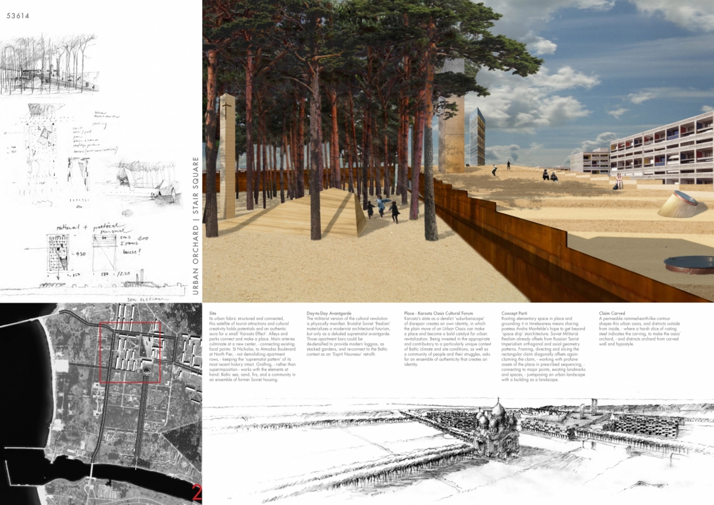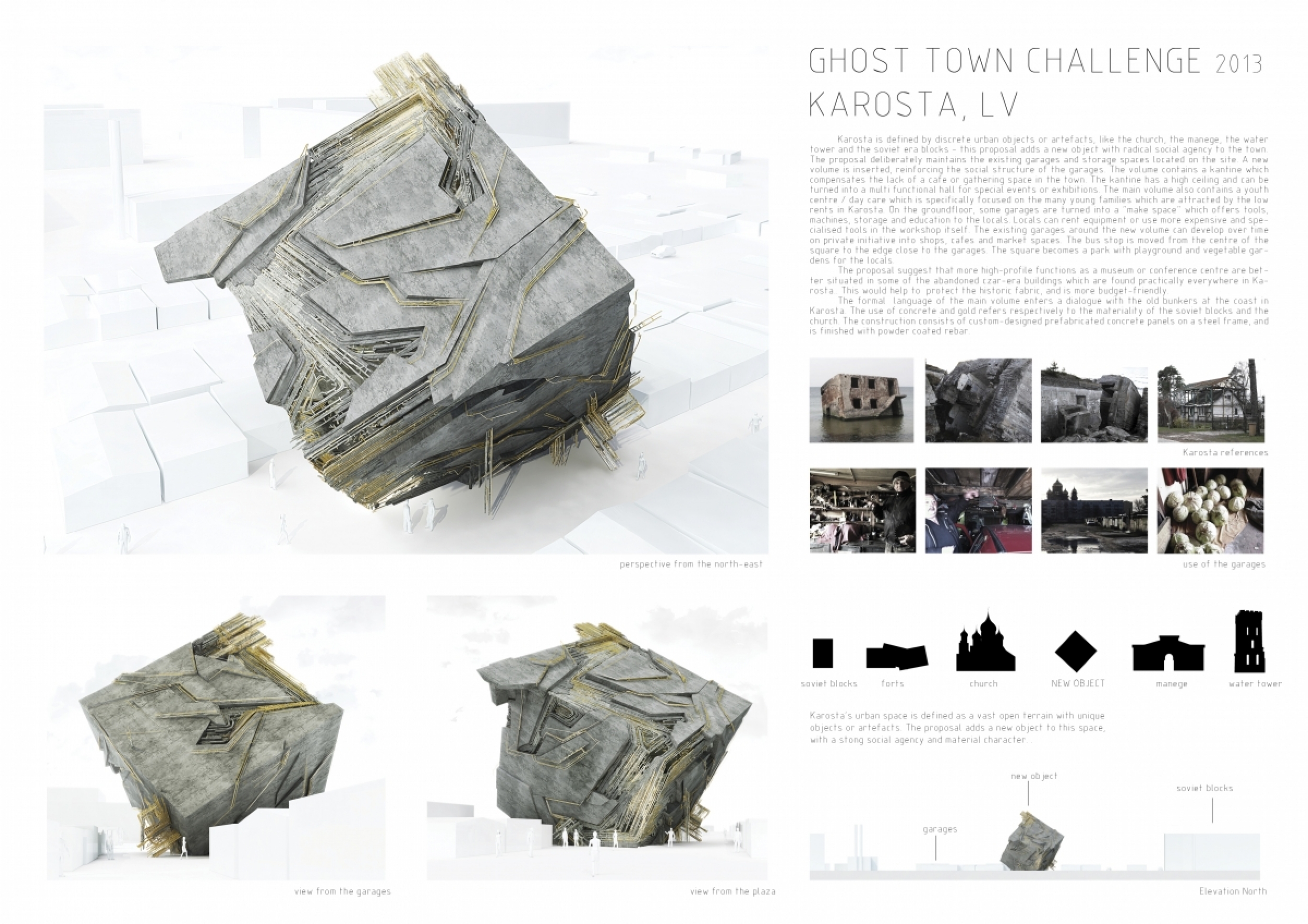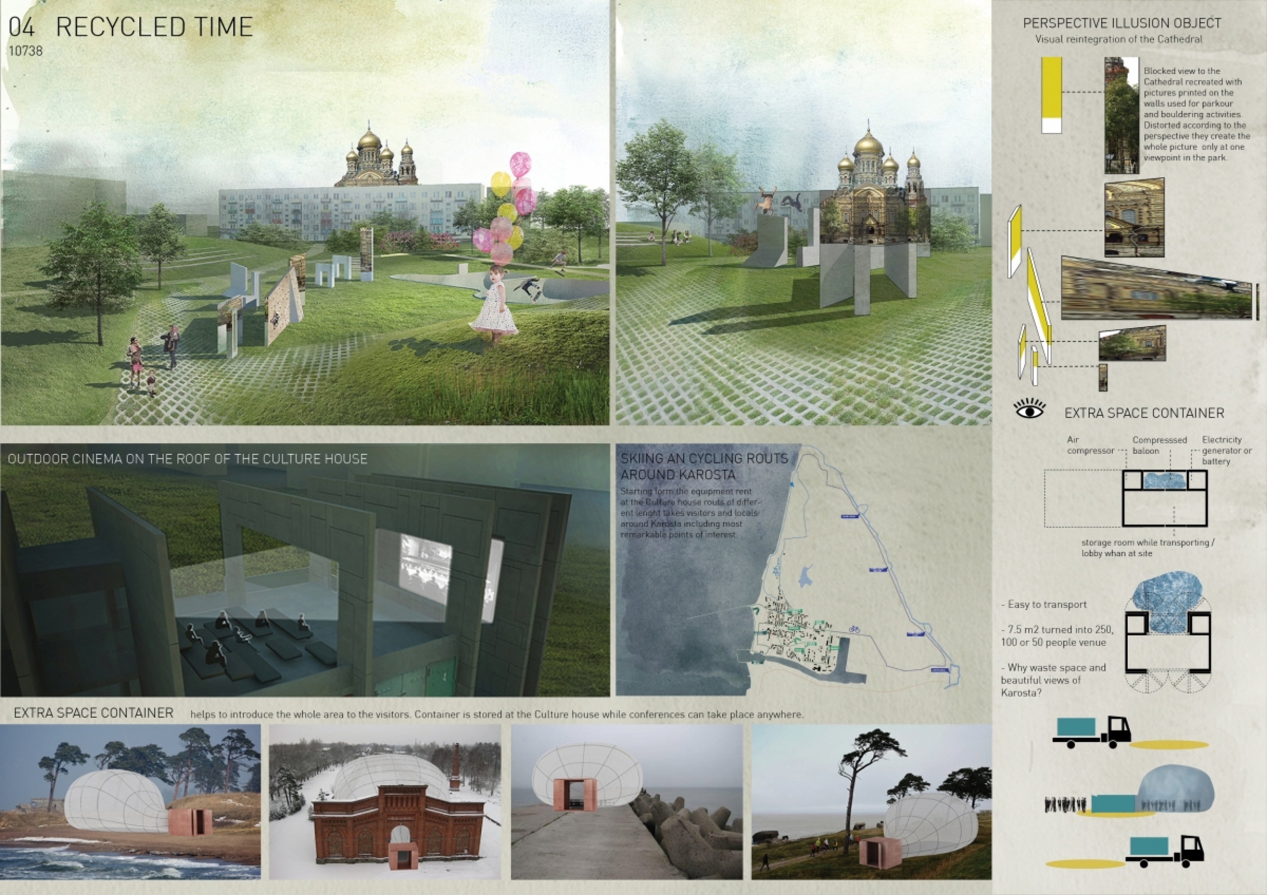 Over 160 submissions were received offering ideas for a multi-purpose cultural complex at the heart of Karosta, with the potential to generate increasing population and further tourism for this town of about 6,000 inhabitants situated 10 kilometres north of Liepaja. The requested program includes an exhibition hall, a library, conference centre, recreational areas, and spaces for retail and restaurants. Designers could choose to respect the City Council site requirements, but were also given the opportunity to present visionary ideas that worked outside of these requirements. An international jury has chosen, after much deliberation, three winning submissions to be awarded a total of US $10,000.