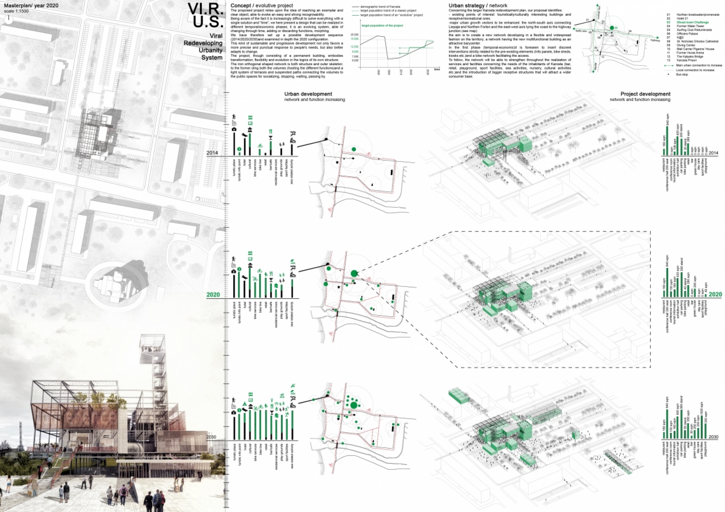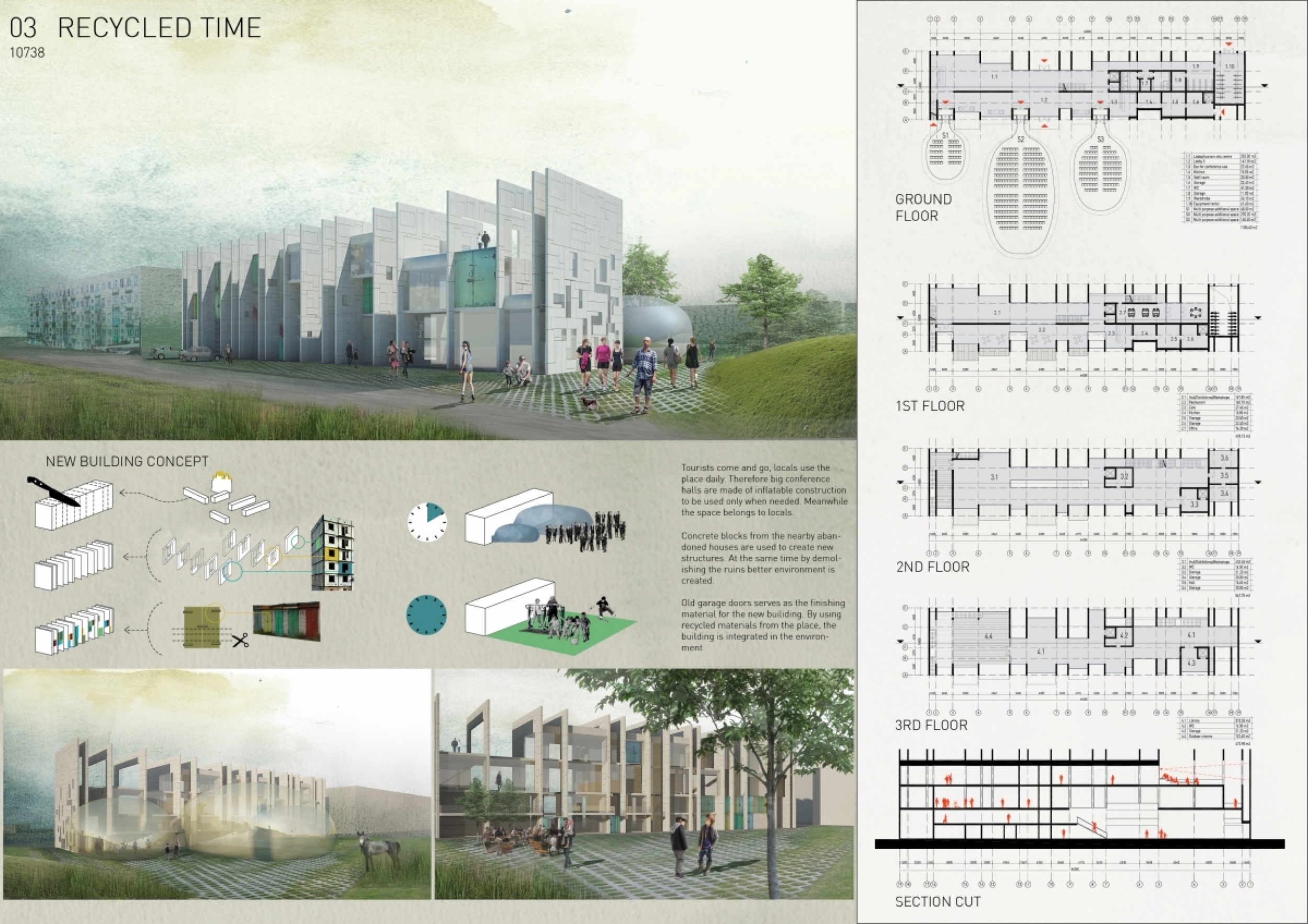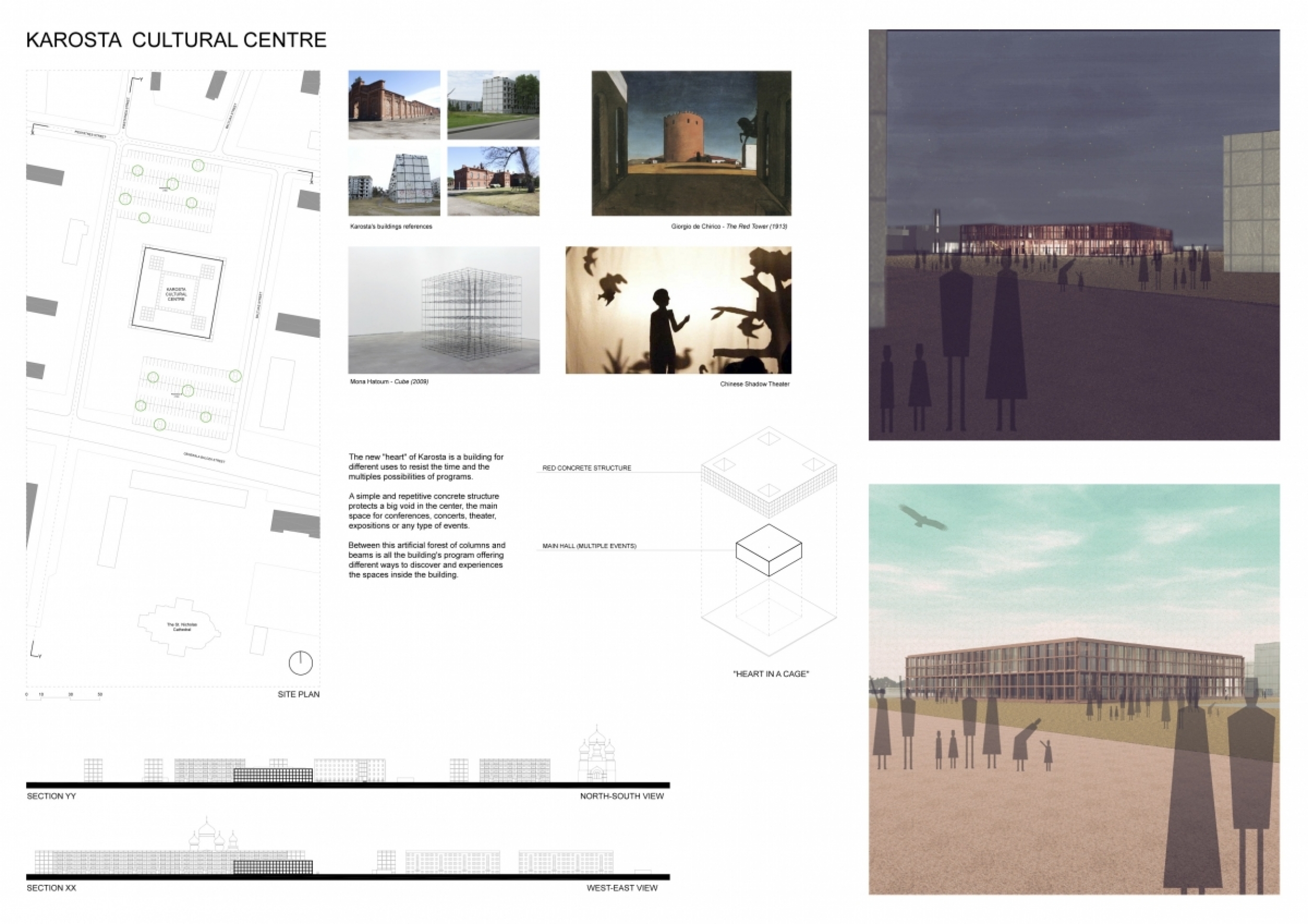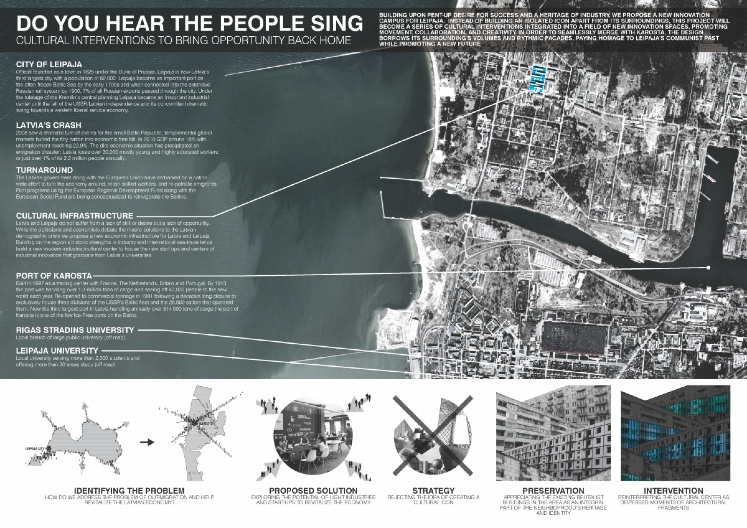 Over 160 submissions were received offering ideas for a multi-purpose cultural complex at the heart of Karosta, with the potential to generate increasing population and further tourism for this town of about 6,000 inhabitants situated 10 kilometres north of Liepaja. The requested program includes an exhibition hall, a library, conference centre, recreational areas, and spaces for retail and restaurants. Designers could choose to respect the City Council site requirements, but were also given the opportunity to present visionary ideas that worked outside of these requirements. An international jury has chosen, after much deliberation, three winning submissions to be awarded a total of US $10,000.