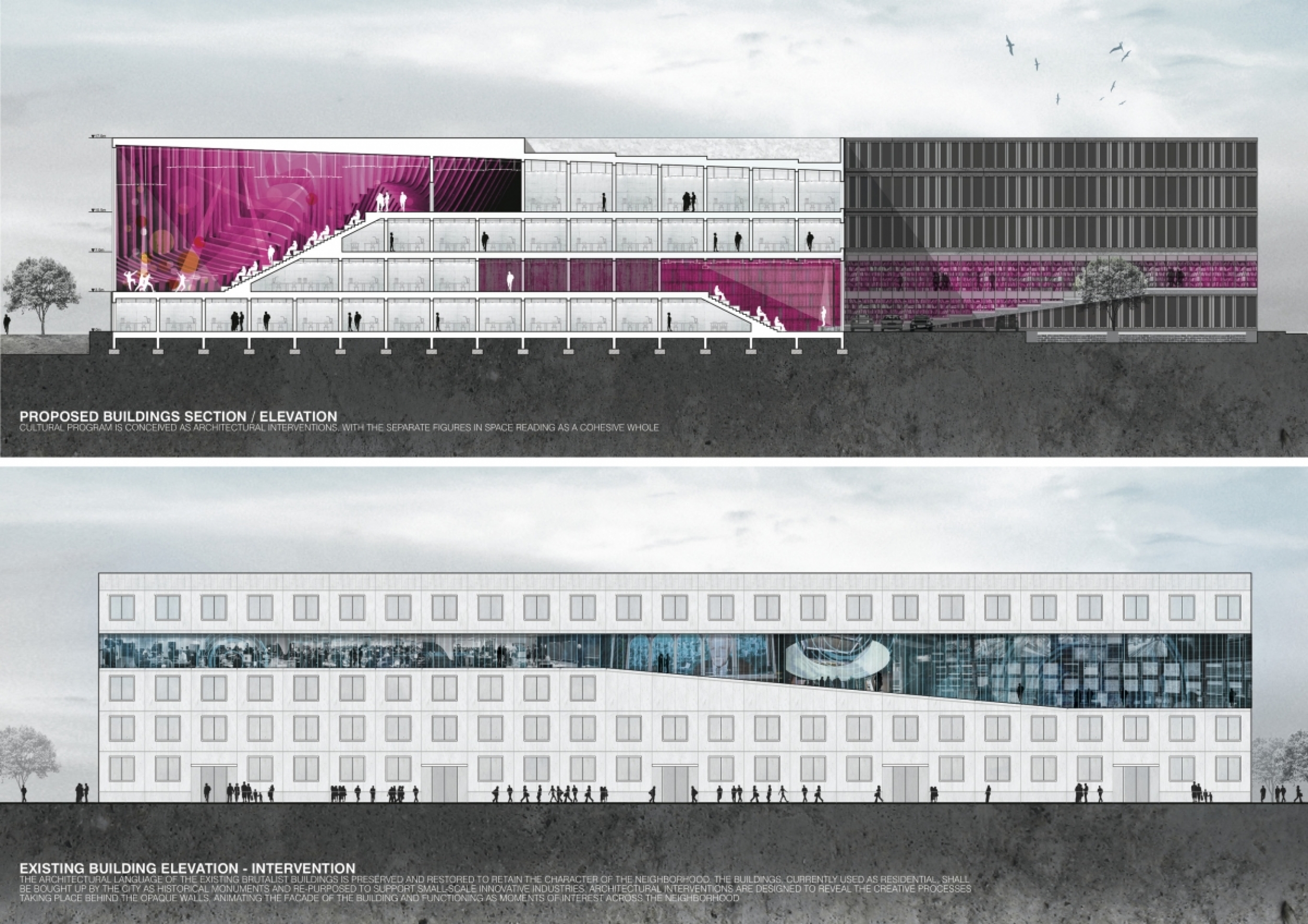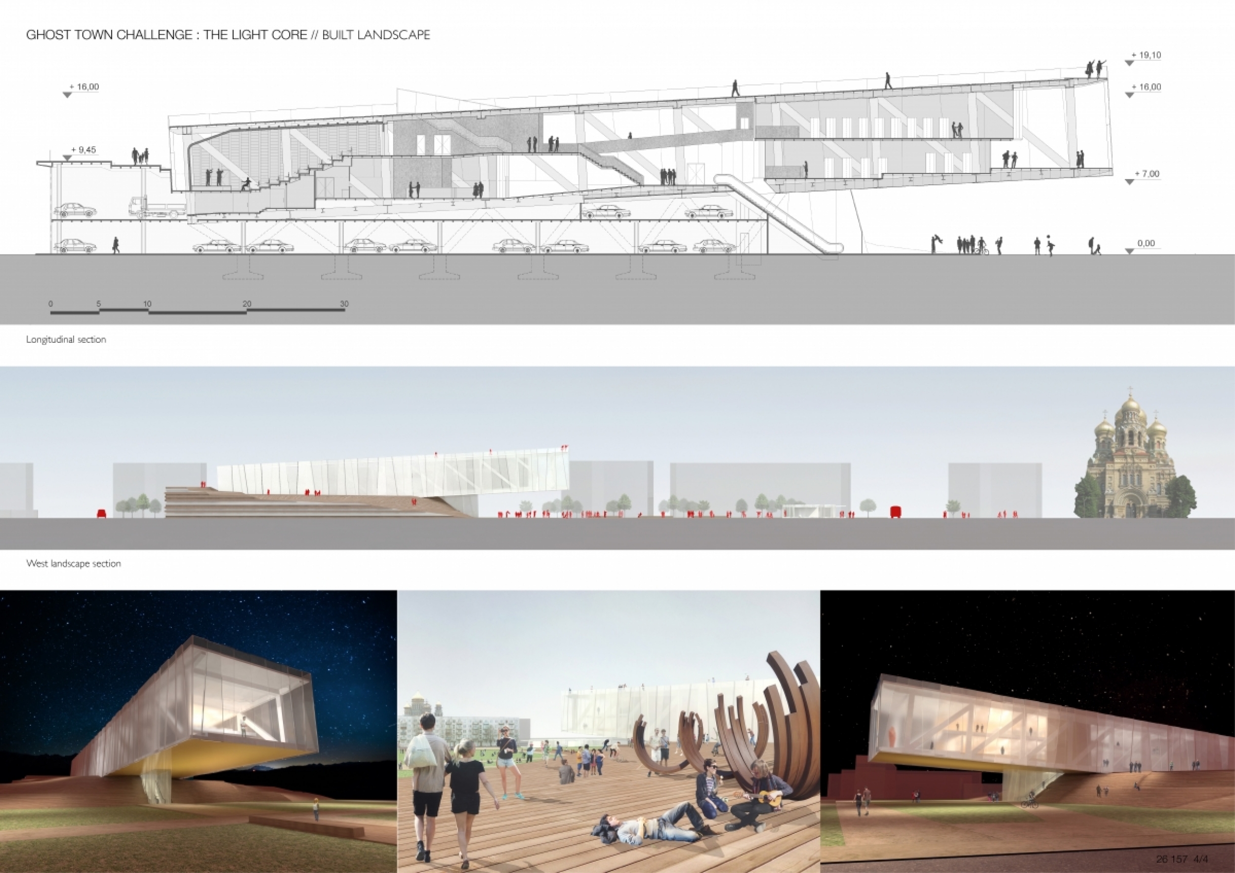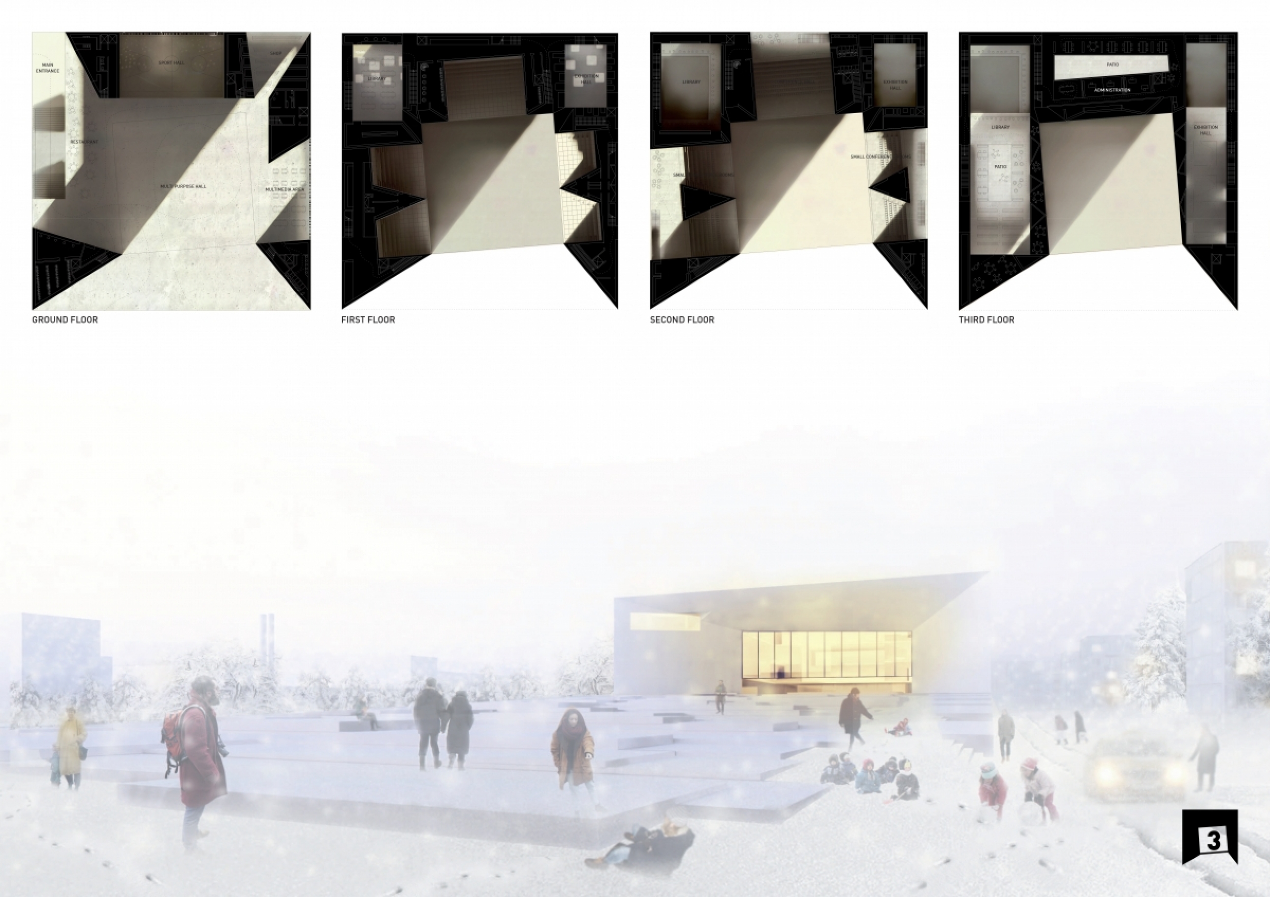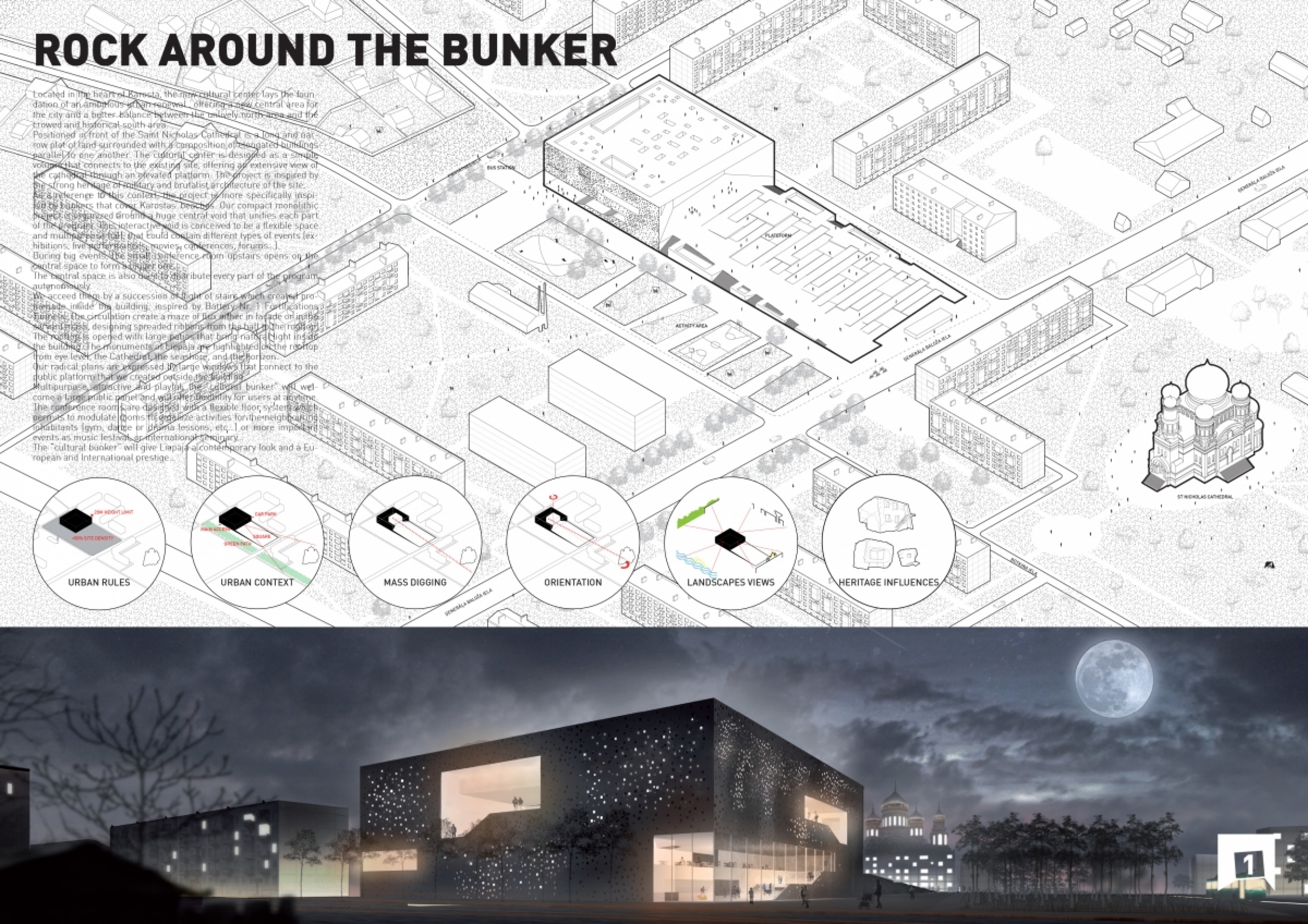 Taking cues from former Soviet bunker design, the proposal reinterprets the heavy and closed concrete form as an open centre for civic activity, elegantly incorporating light, landscape and public space at a variety of scales. The jury was impressed with the submission’s professionalism, and the clarity and refinement of its diagrams.