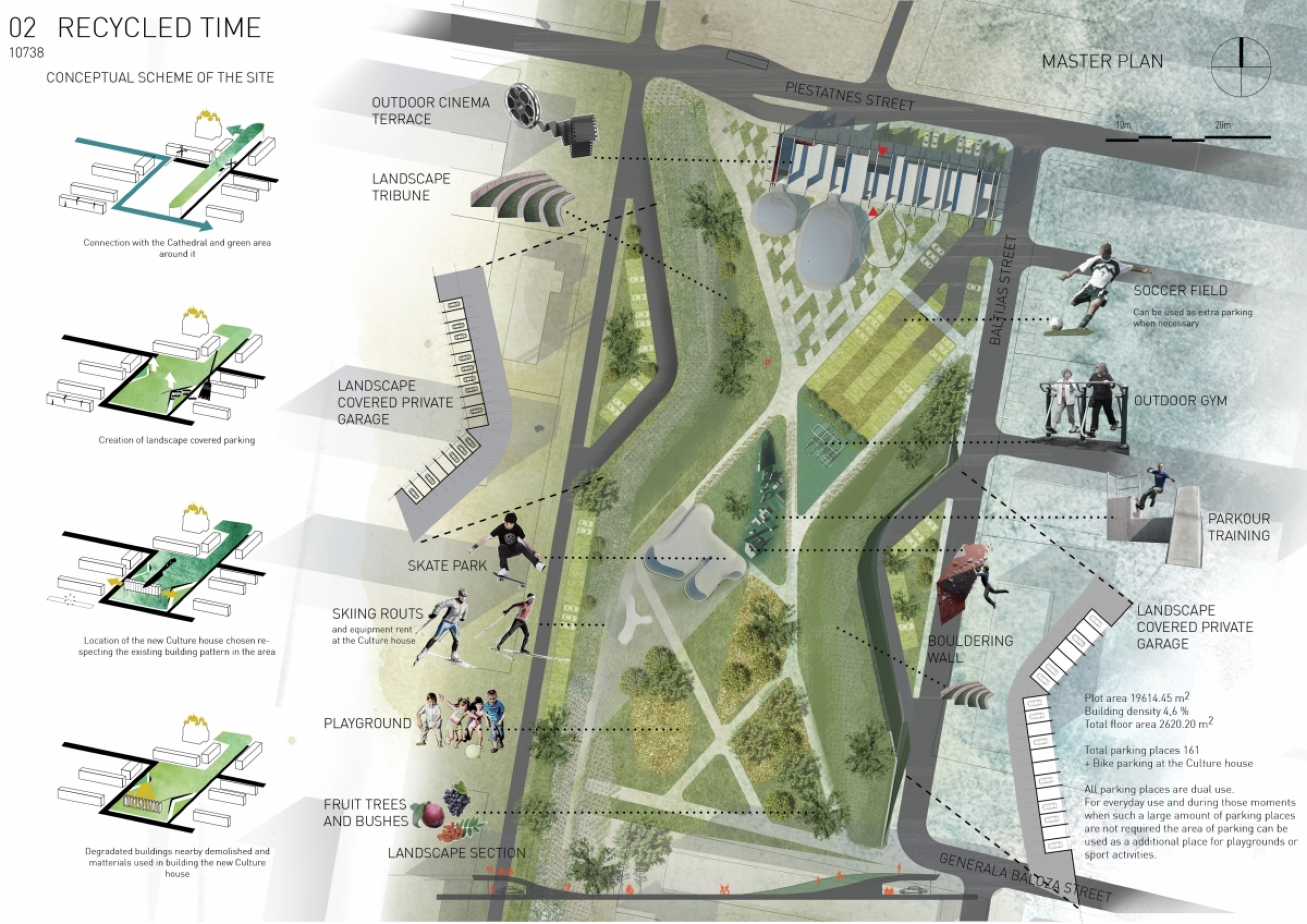 A truly realisable proposal, the ‘Light Core’ engages its surroundings quietly and respectfully. The design in plan and section clearly pays homage to the cathedral towards its south, while utilising sun orientation to offer a string of naturally lit interior spaces that starkly differentiates the new cultural centre from Karosta’s solid concrete constructions. The jury valued the articulate presentation of this submission and the clarity of its design.