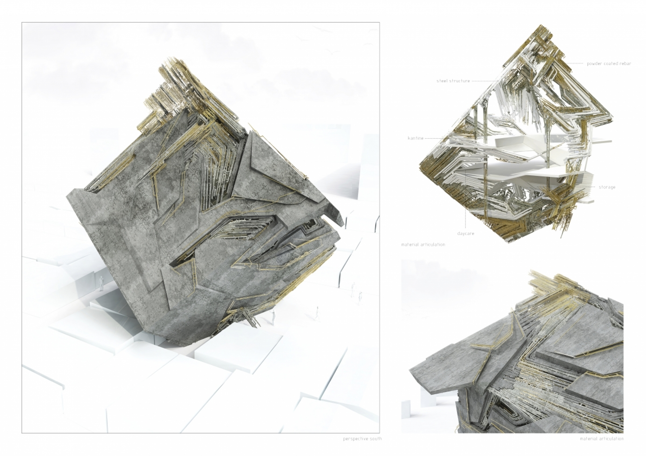 Both the architectural expression and the programming of this proposal made it stand out as an especially creative and rooted response. Its function is paradoxical to its form: a radical, symbolic monument that re-imagines the coastal concrete bunker; yet programmed with civic commonplace amenities including a canteen, a daycare center, and a workshop.