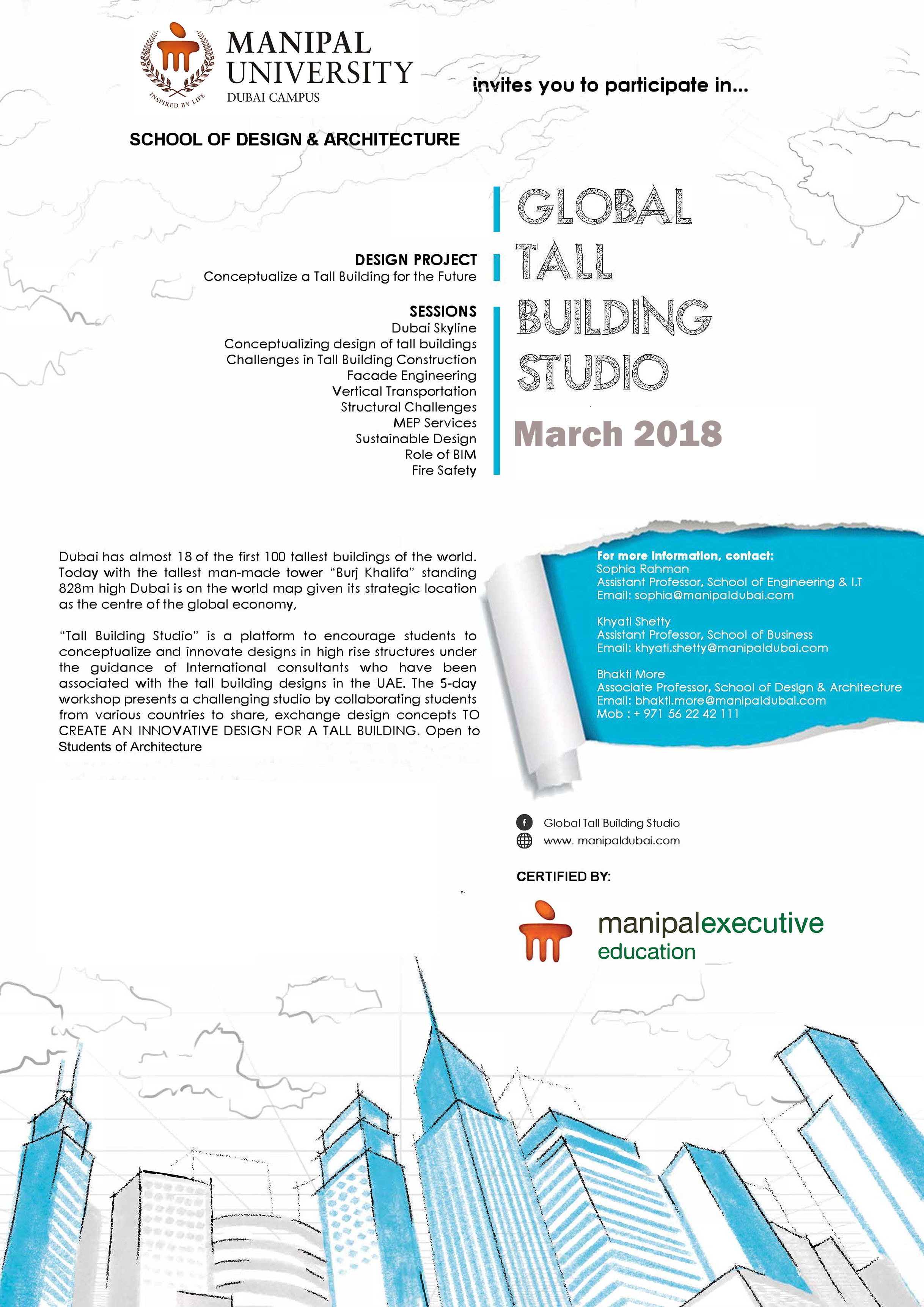 Manipal University Dubai School of Design & Architecture is the host of the annual Global Tall Building Studio, a five-day workshop held on their campuses in Dubai, UAE. Manipal Executive Education (MEE) conducts this workshop as way to engage students and encourage them to create innovative designs for high rise structures. Students worked under the guidance of international consultants from the region who are experts in their fields.