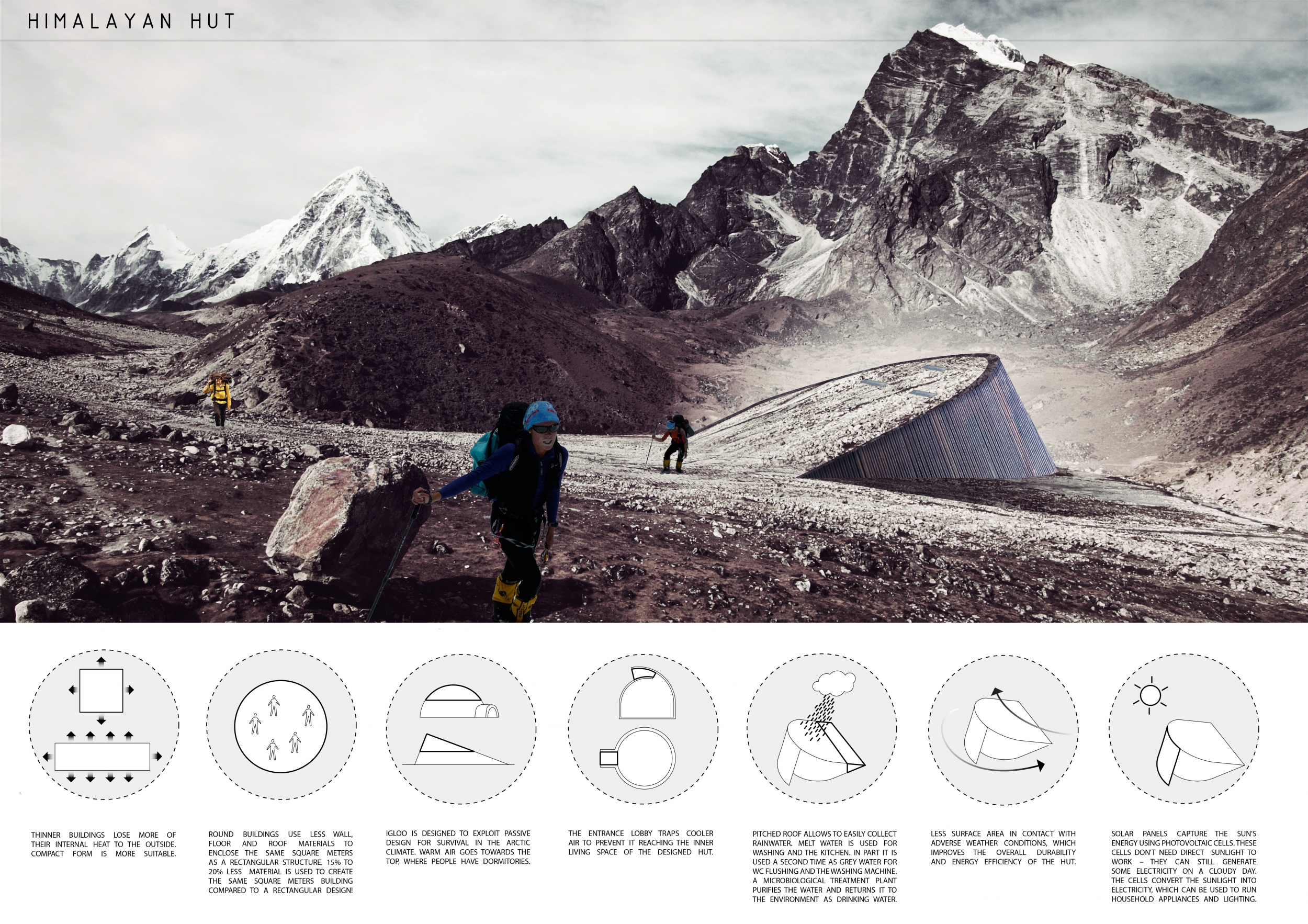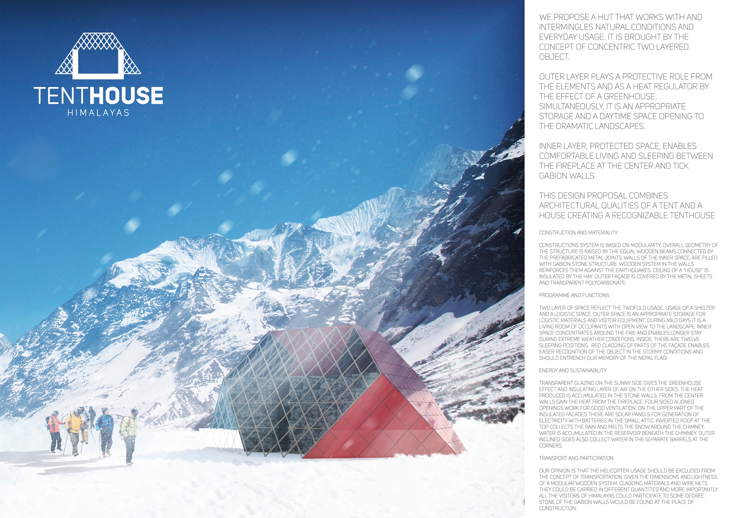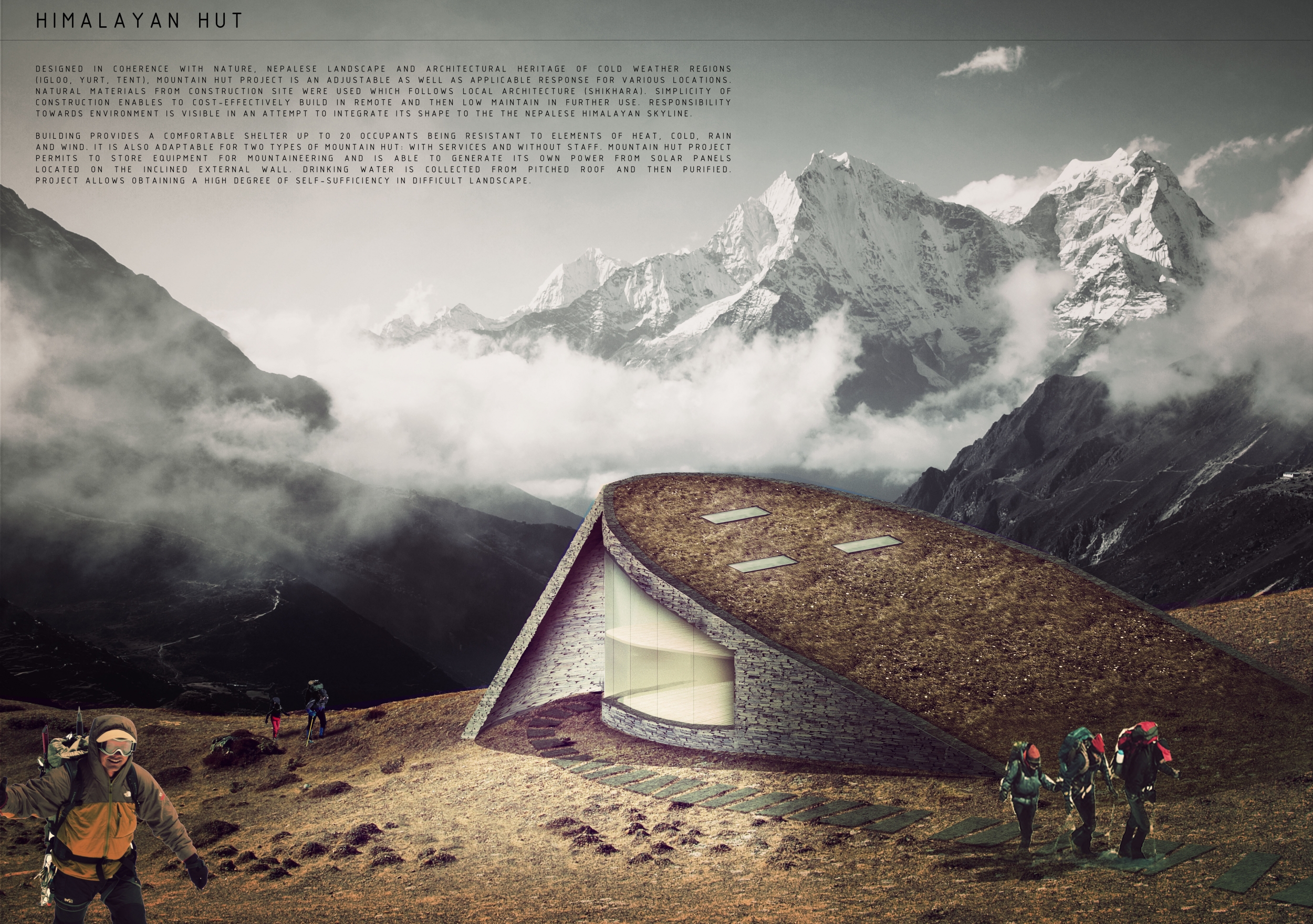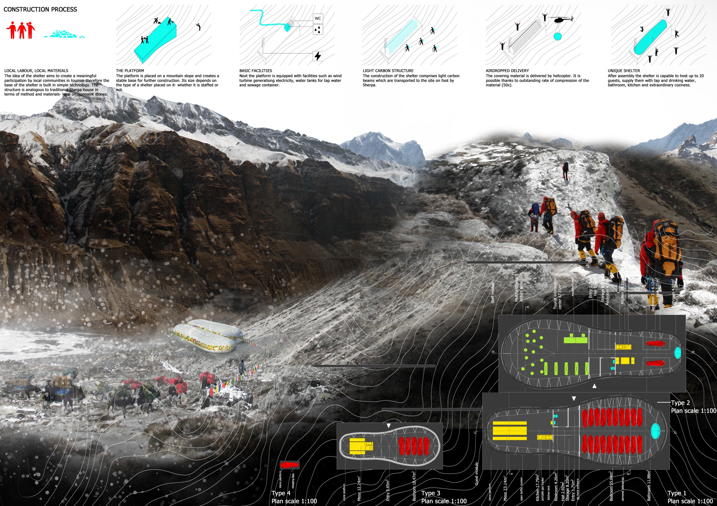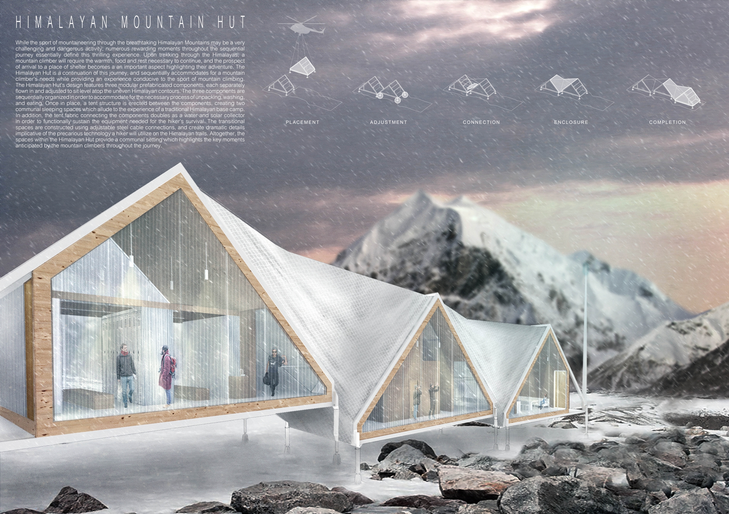 Each entry was evaluated on a number of criteria, including but not limited to: strength and clarity of concept, originality, quality of presentation, appropriateness to context, and most importantly, its constructability and efficiency at a remote site with an extreme climate. Although a Himalayan Mountain Hut is primarily for shelter during long treks, the judges placed additional focus on the hut's ability to serve the culture and community of mountaineering. Successful proposals were not only buildable, affordable, efficient with systems, and efficient with transport, but they also incorporated comfortable sleeping arrangements and a potential gathering space to replace and/or supplement the traditional camp fire, around which stories are shared and bonds are made. While isolated in extreme climates, one's humanity becomes an important component in surviving nature's perils, and successful entries embraced the idea of gathering for weary trekkers.