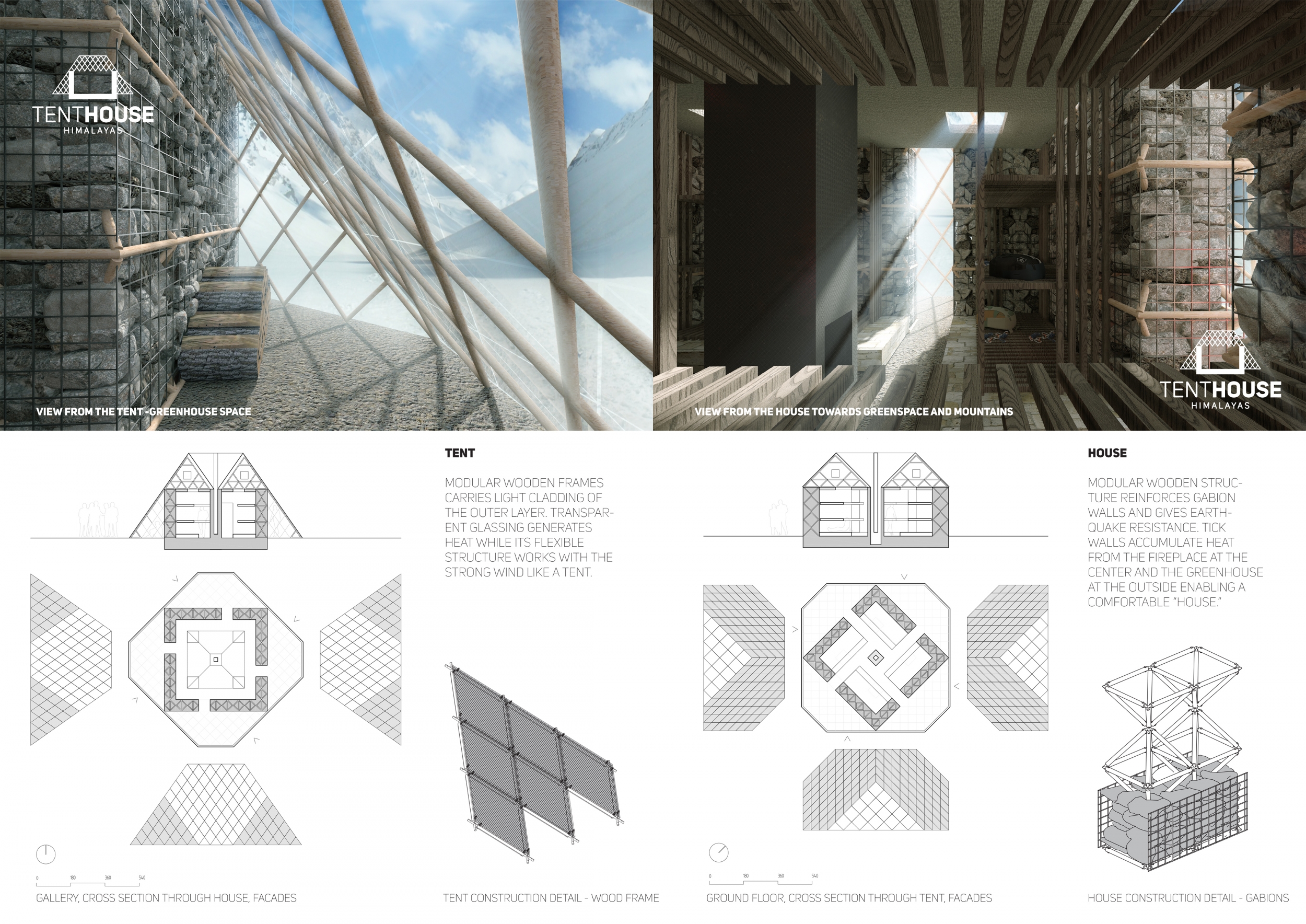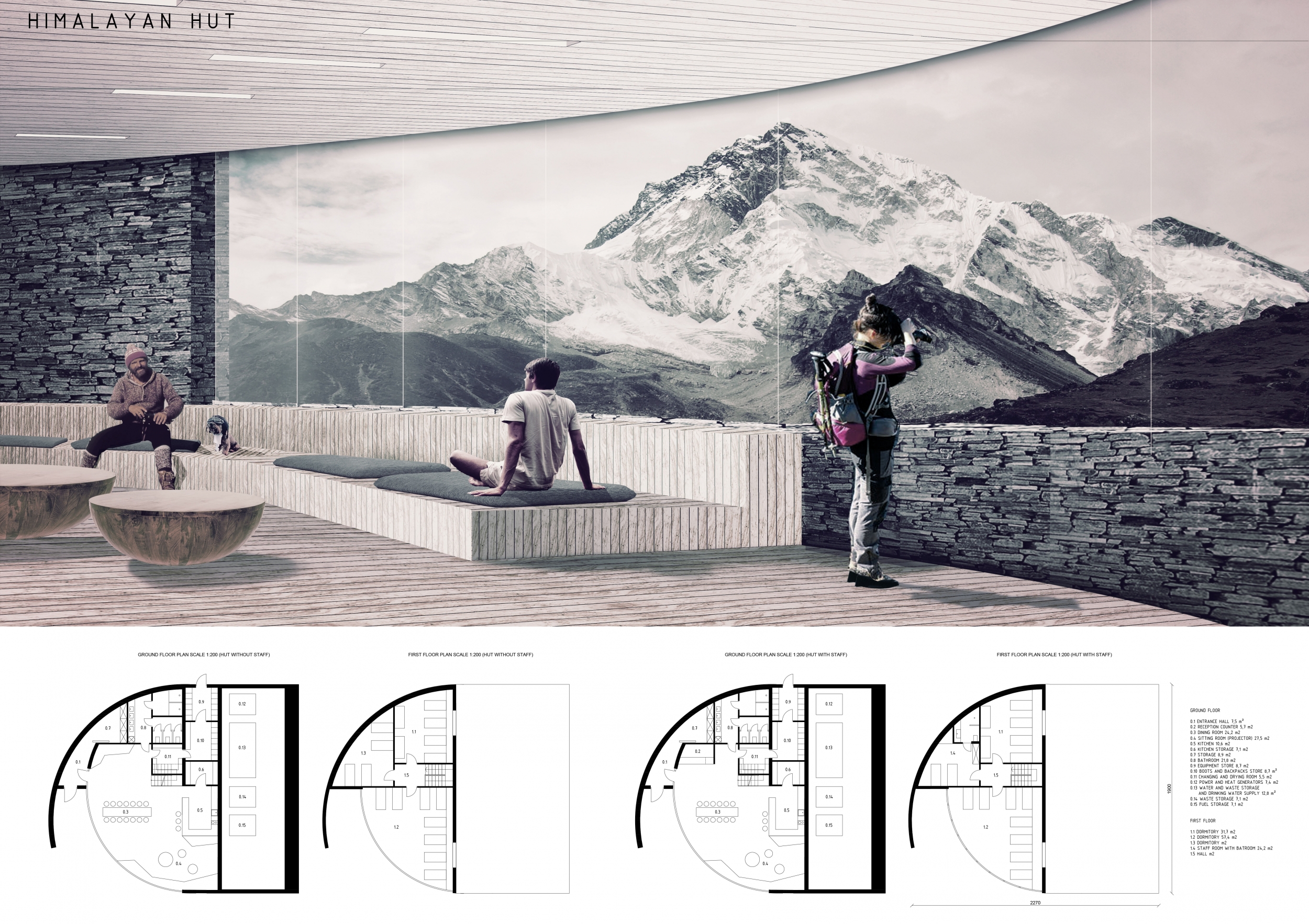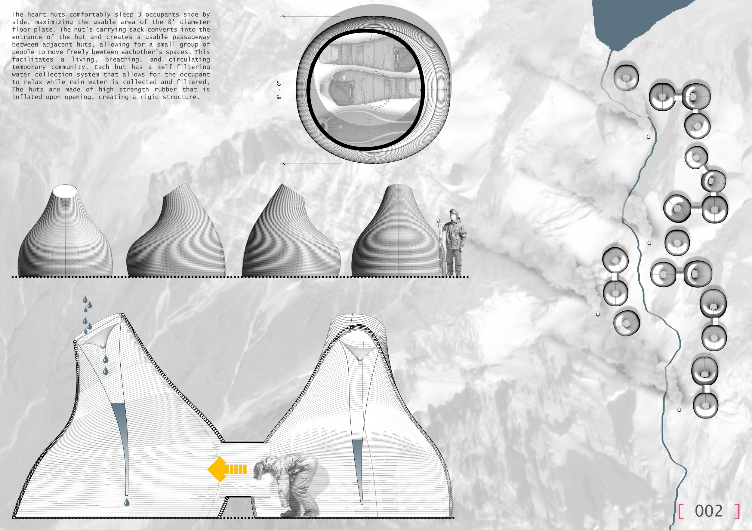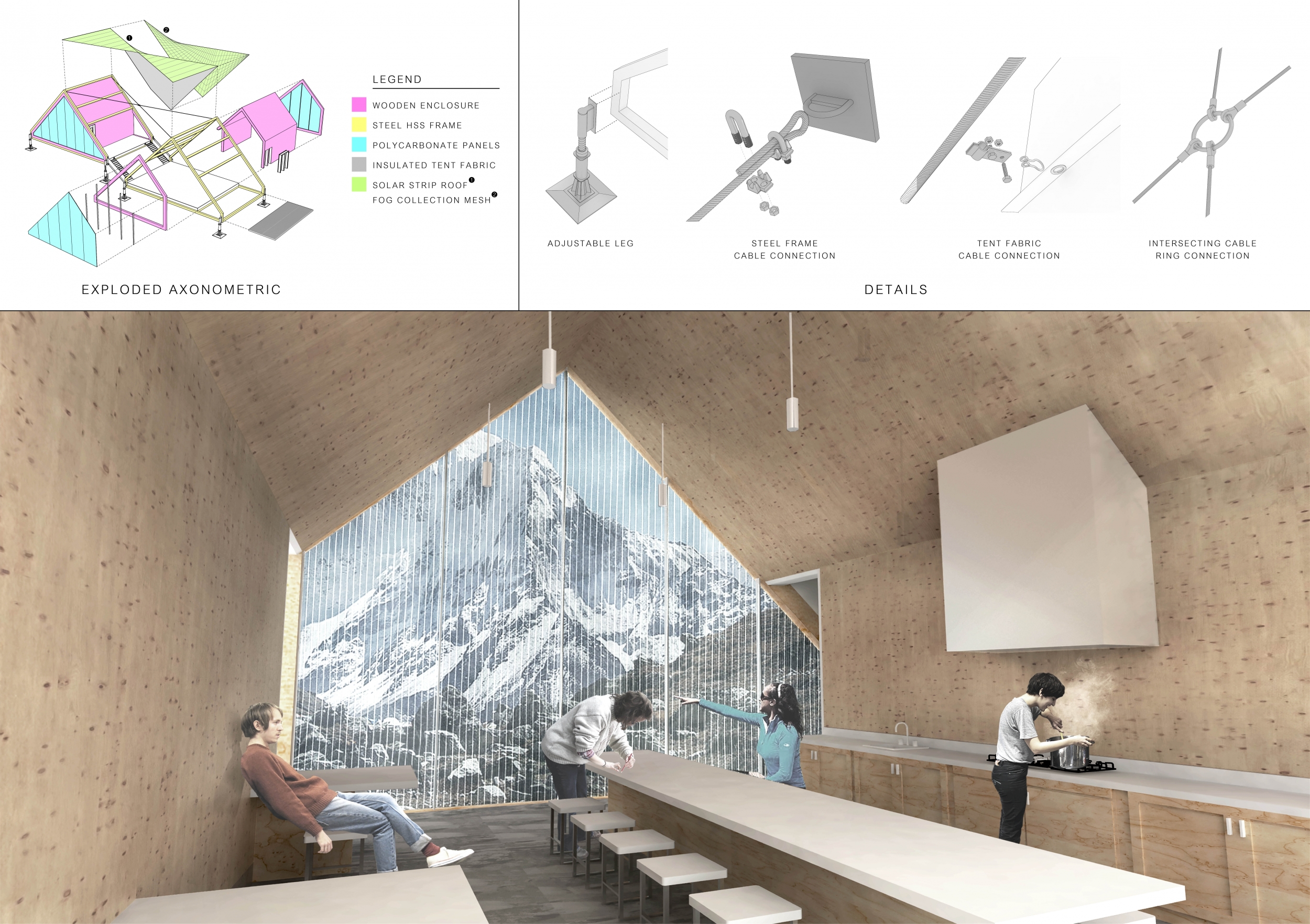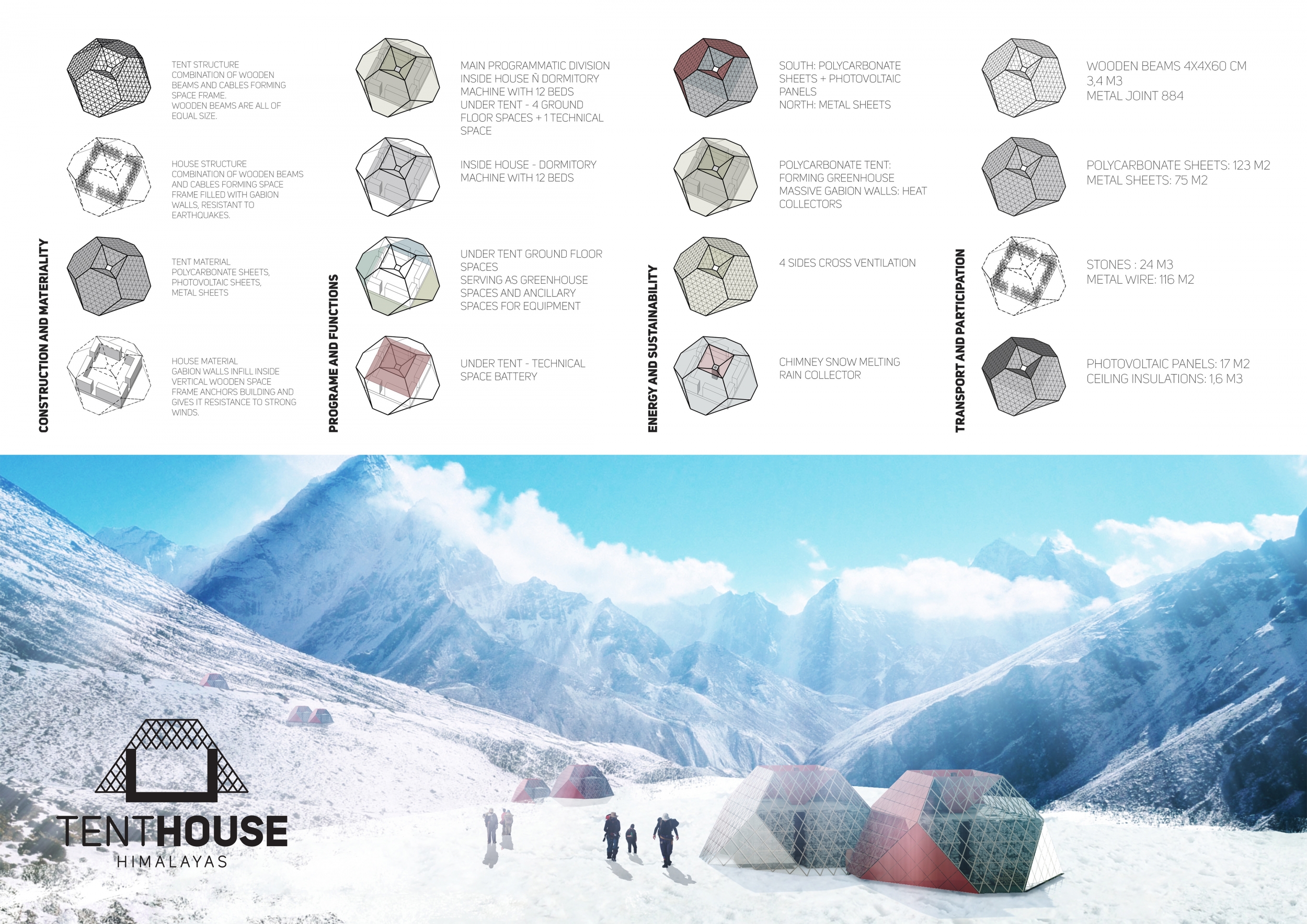 Each entry was evaluated on a number of criteria, including but not limited to: strength and clarity of concept, originality, quality of presentation, appropriateness to context, and most importantly, its constructability and efficiency at a remote site with an extreme climate. Although a Himalayan Mountain Hut is primarily for shelter during long treks, the judges placed additional focus on the hut's ability to serve the culture and community of mountaineering. Successful proposals were not only buildable, affordable, efficient with systems, and efficient with transport, but they also incorporated comfortable sleeping arrangements and a potential gathering space to replace and/or supplement the traditional camp fire, around which stories are shared and bonds are made. While isolated in extreme climates, one's humanity becomes an important component in surviving nature's perils, and successful entries embraced the idea of gathering for weary trekkers.