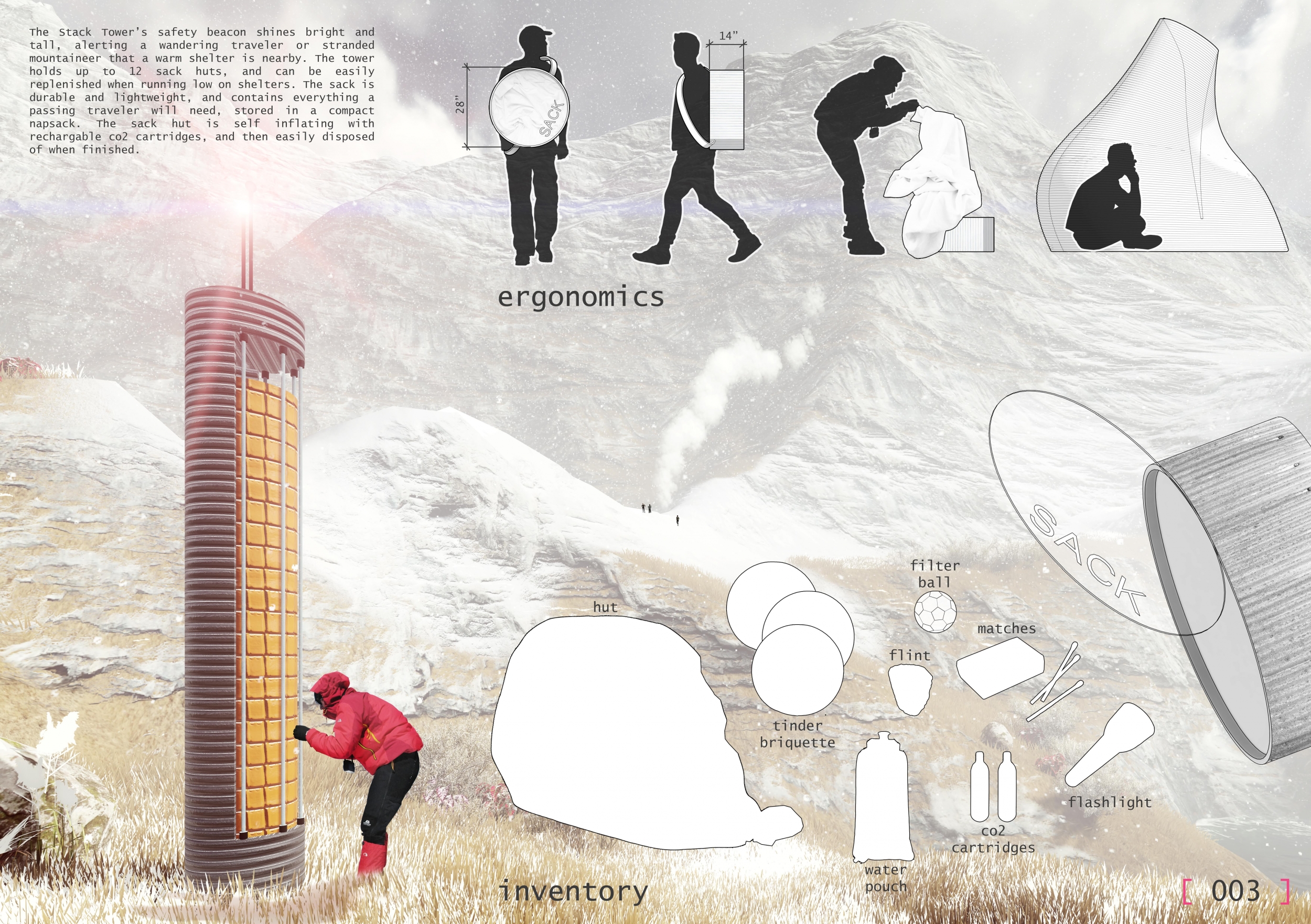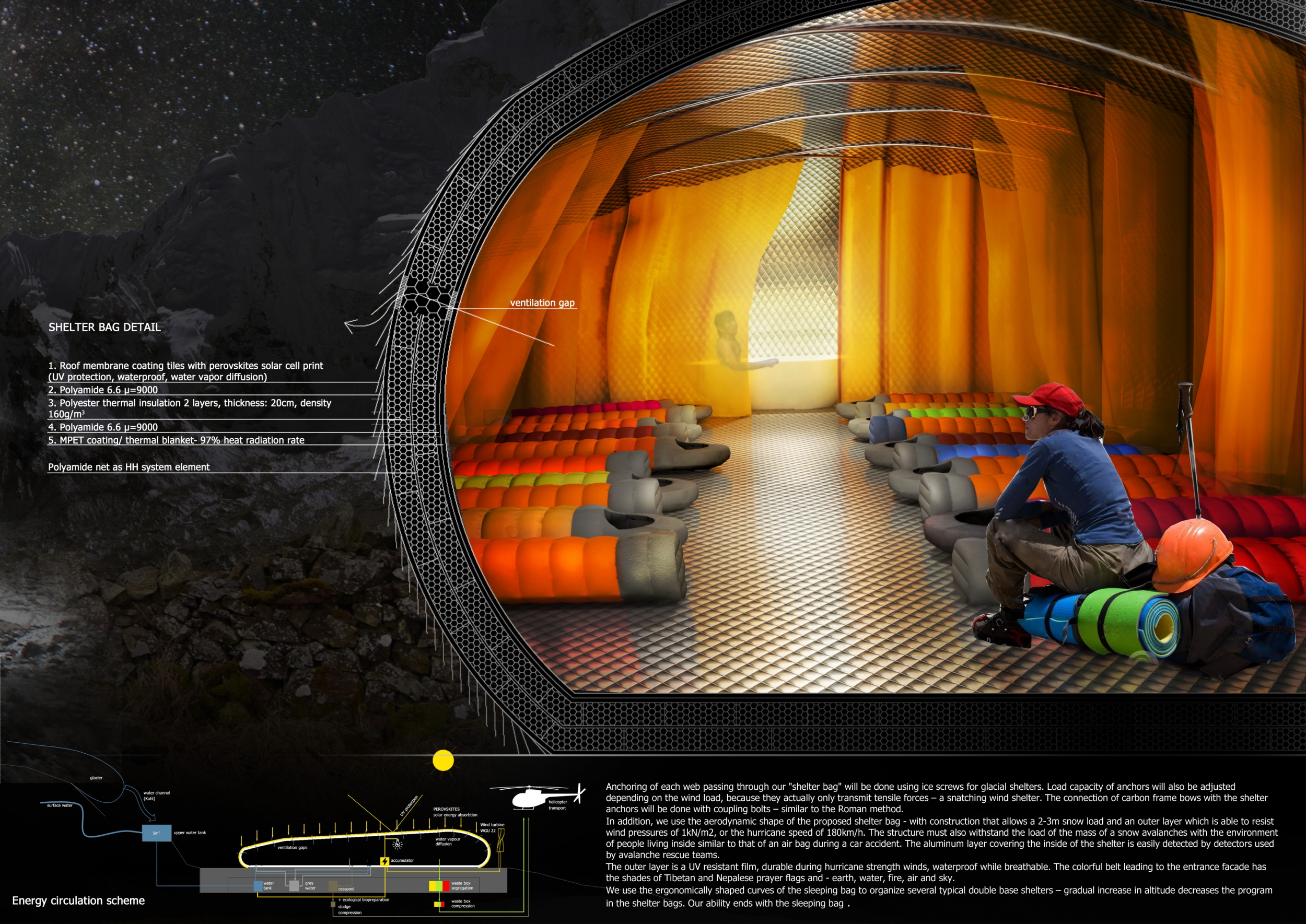 This project is provocative in incorporating the unexpected yet highly relevant mountaineering typologies of the tent and sleeping bag. These two key shelters are a must for any expedition, and as such are a relevant base point for a project with these requirements. The structure successfully blends the two typologies by using the light carbon poles of a tent covered by the thermally-insulating shell of a sleeping bag.