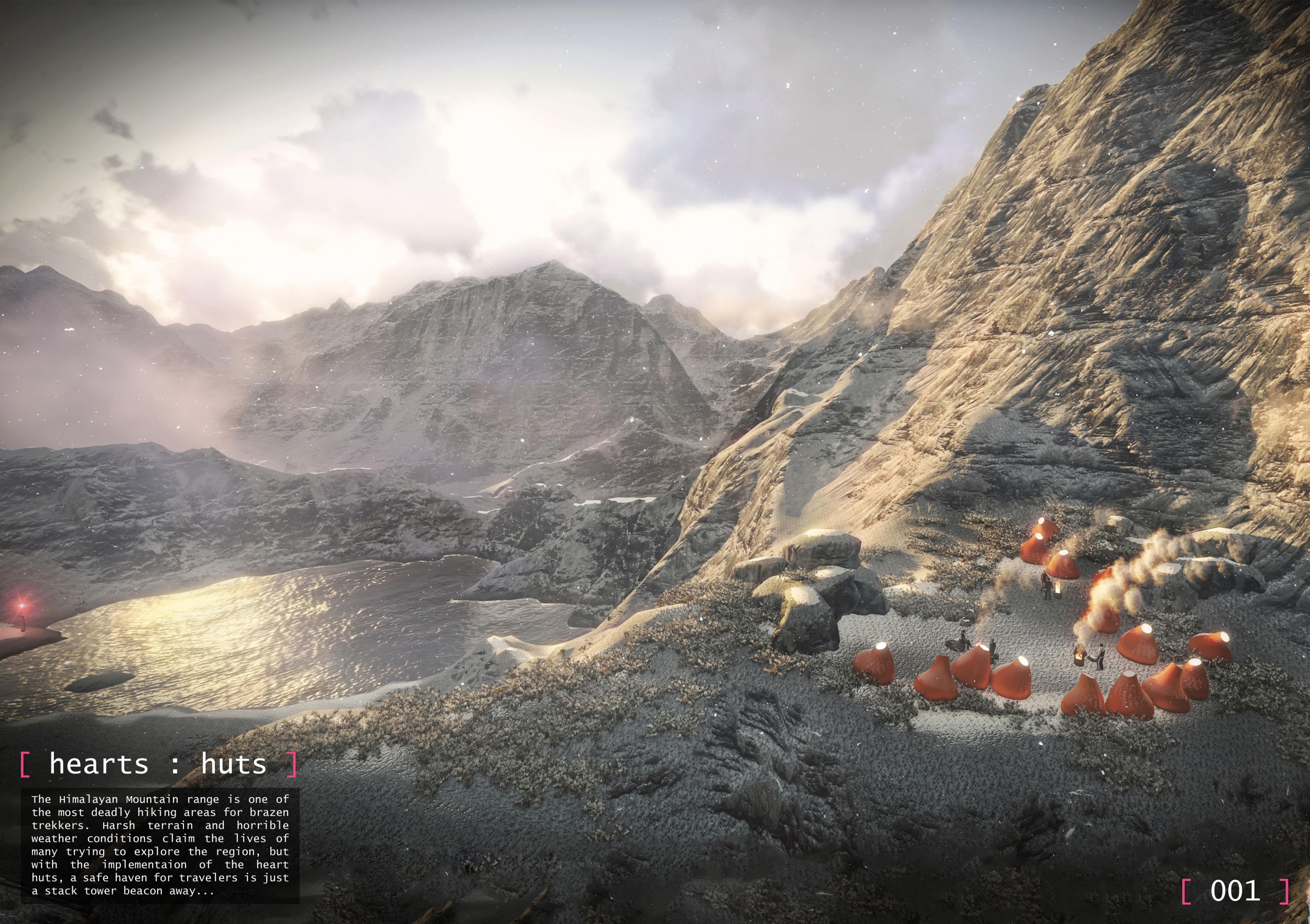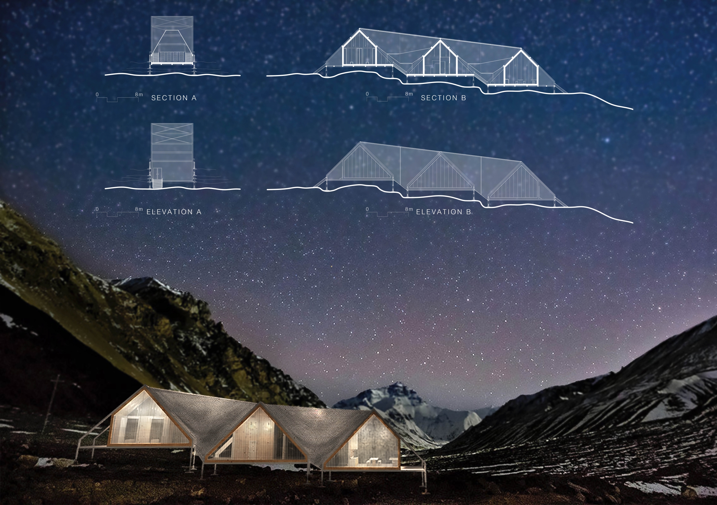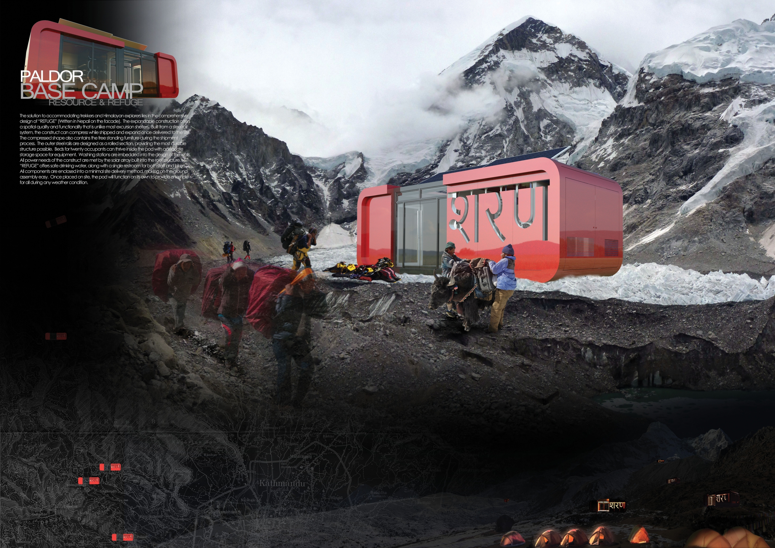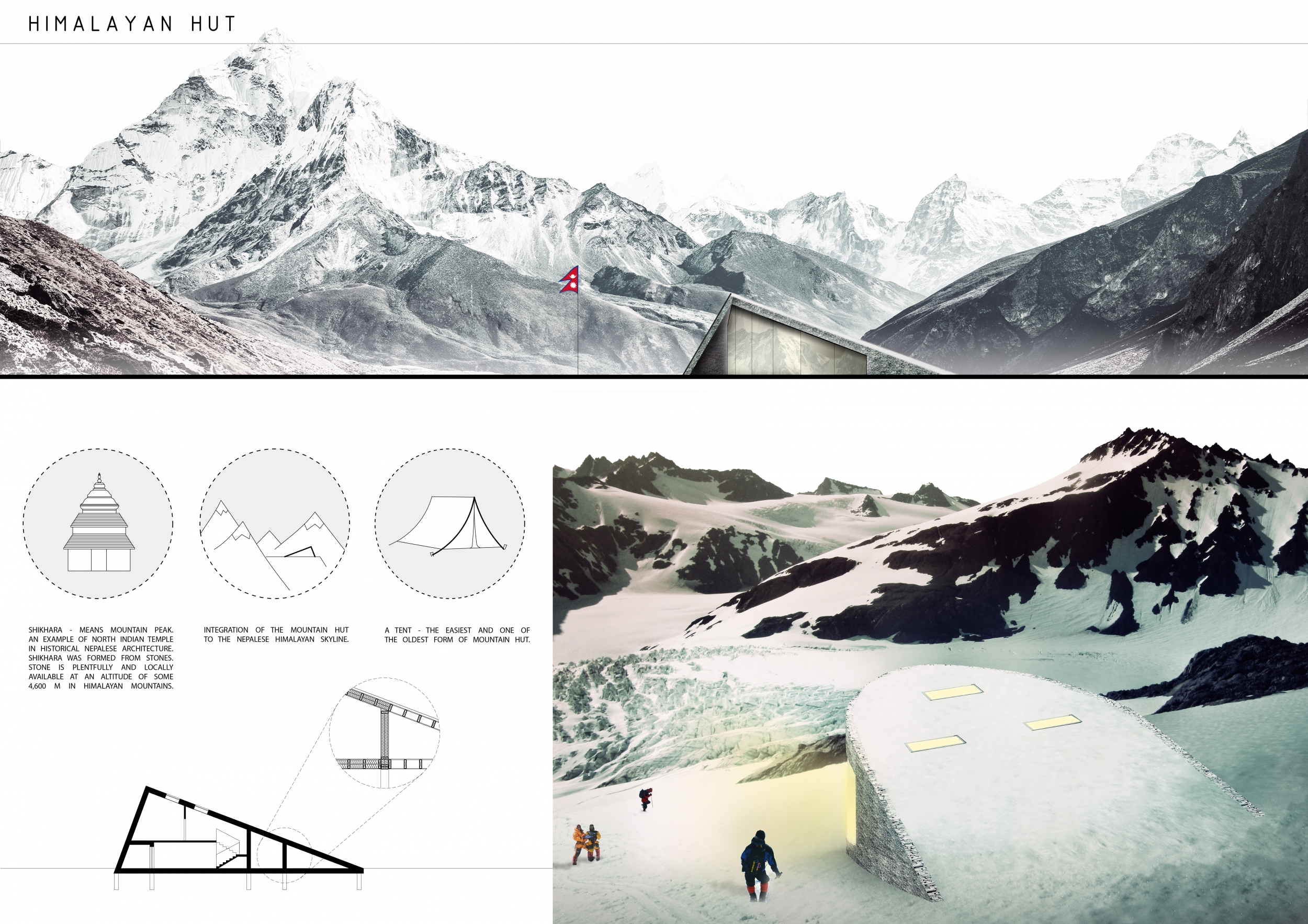 Rising from the basic human need for shelter in an unforgiving climate, the Himalayan Mountain Hut carries the potential to house mountaineering expeditions throughout the trails of Nepal. The quality of submissions for the competition was quite high, and the judges were presented with a wide variety of solutions, ranging from simple tent communes to vast multi-level hospitality structures.