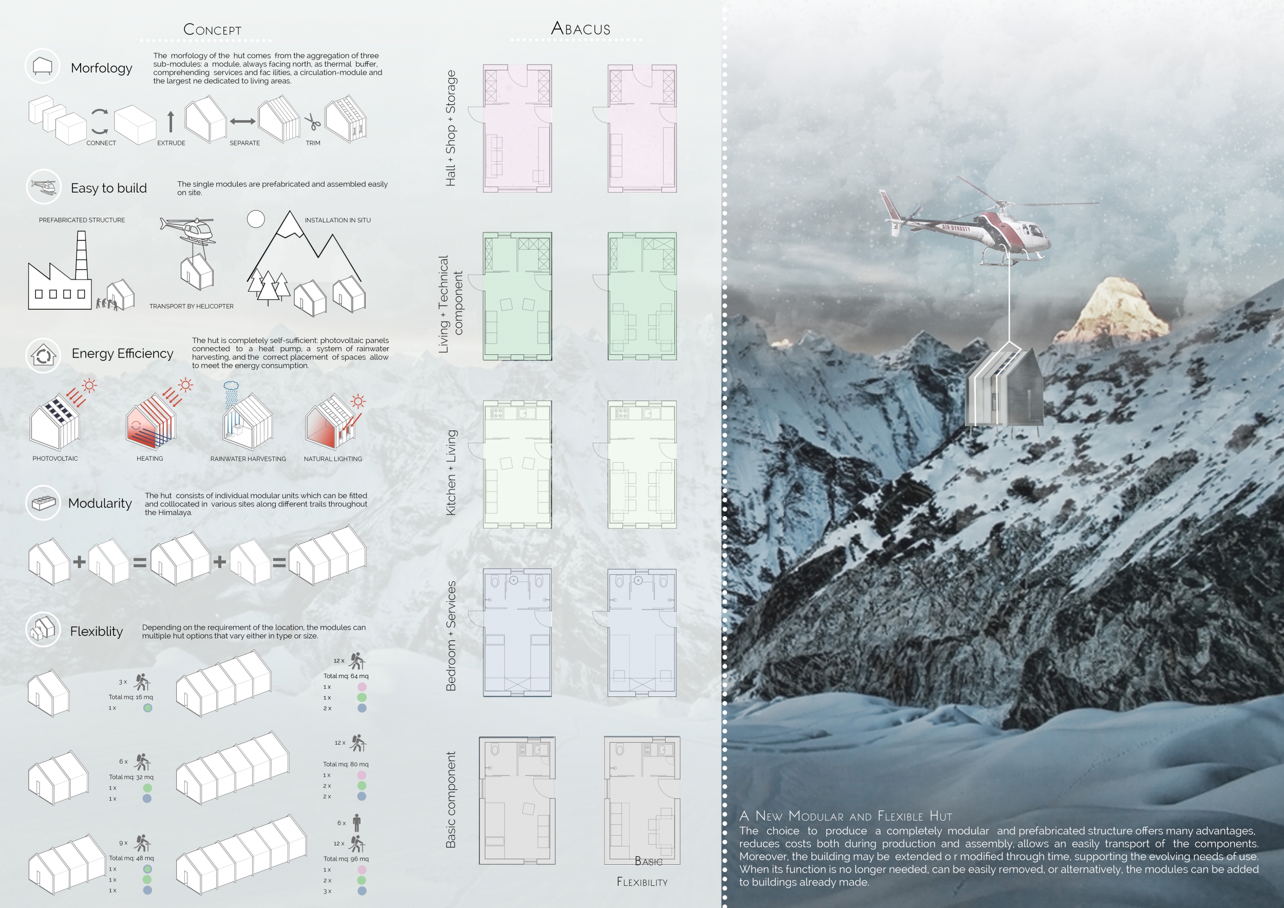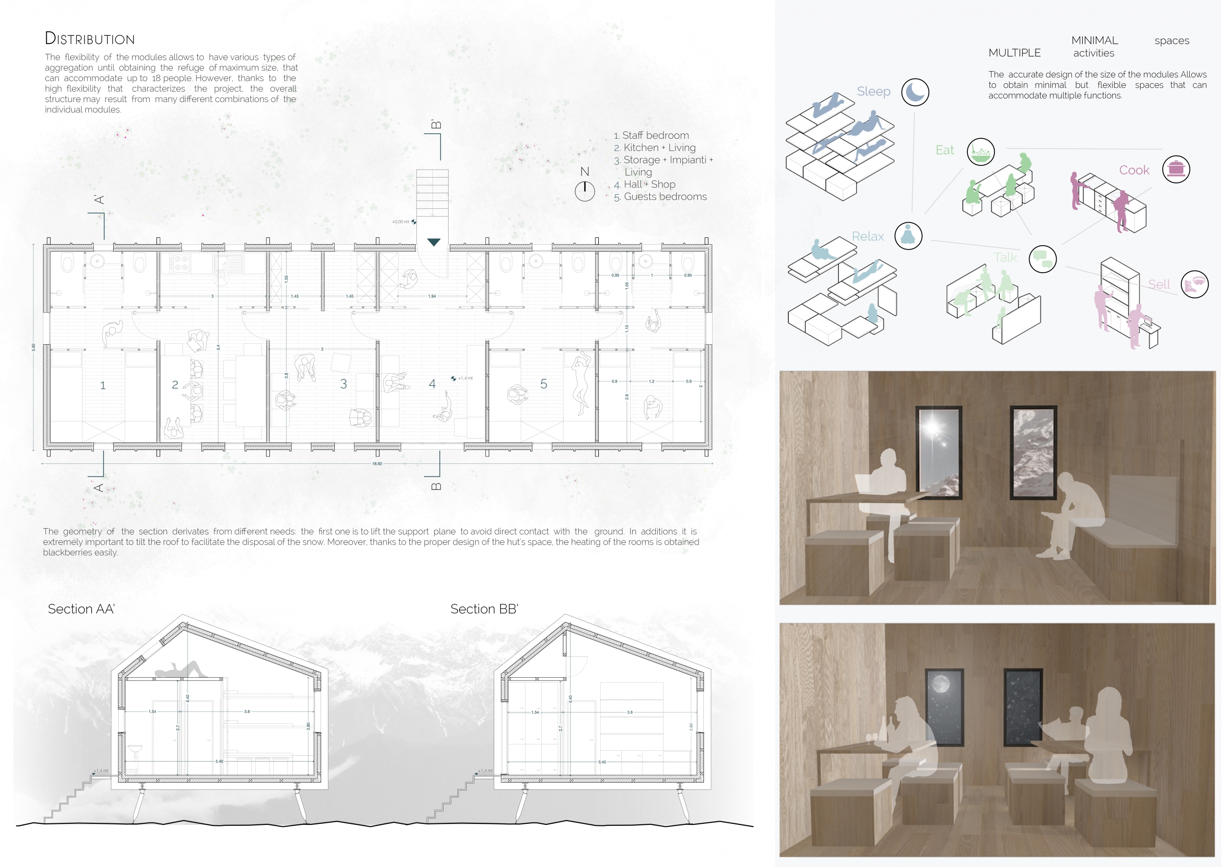 The chosen winner successfully integrated the project’s unique program and constraints into an affordable and elegant solution fitting to the site. As called for in the competition guidelines, this solution is extremely adaptable, and may be easily adjusted for variable sites, altitudes, and number of occupants. It employs a modular system that can be clipped together, comprised of a series of pre-fabricated module ‘types’ such as living, sleeping, service, etc.
