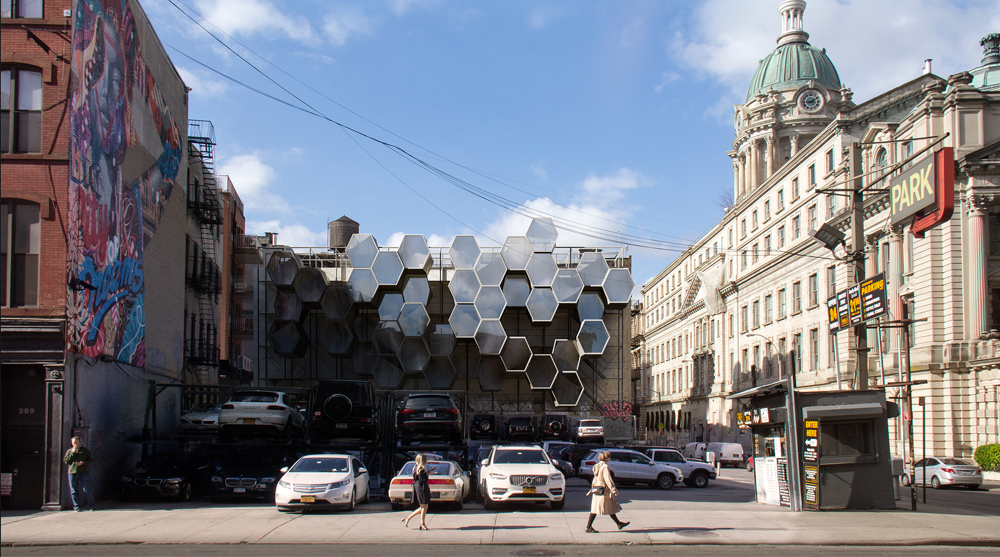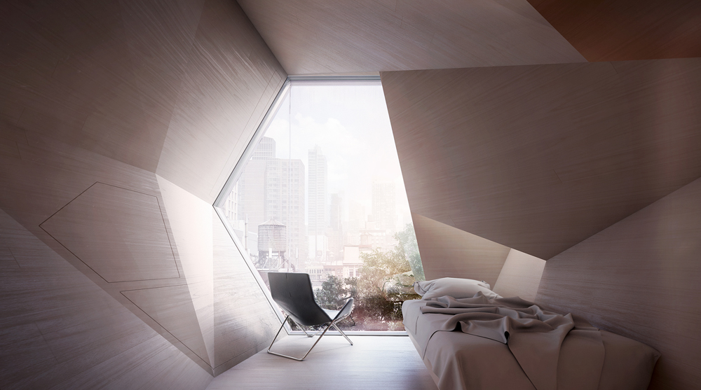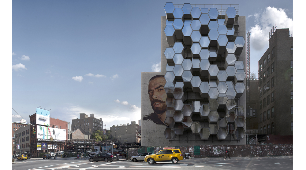 Tjeldflaat founded Framlab, an Oslo- and New York City-based creative agency, to explore the intersection of product design and architecture. ‘Homed’ is the name given to a proposal by Framlab seeking to capitalize on the exterior windowless walls found on buildings around NYC. The prefabricated system combines a framework of scaffolding with vertical circulation and densely packed hexagonal housing modules.