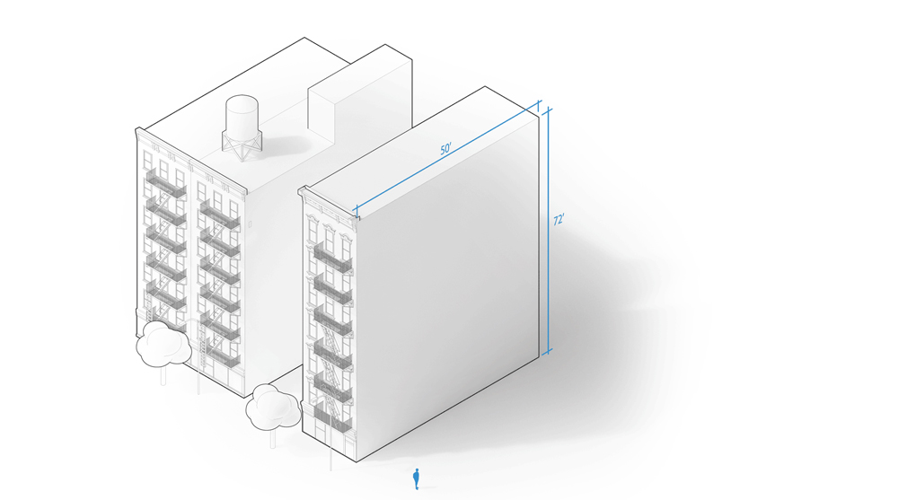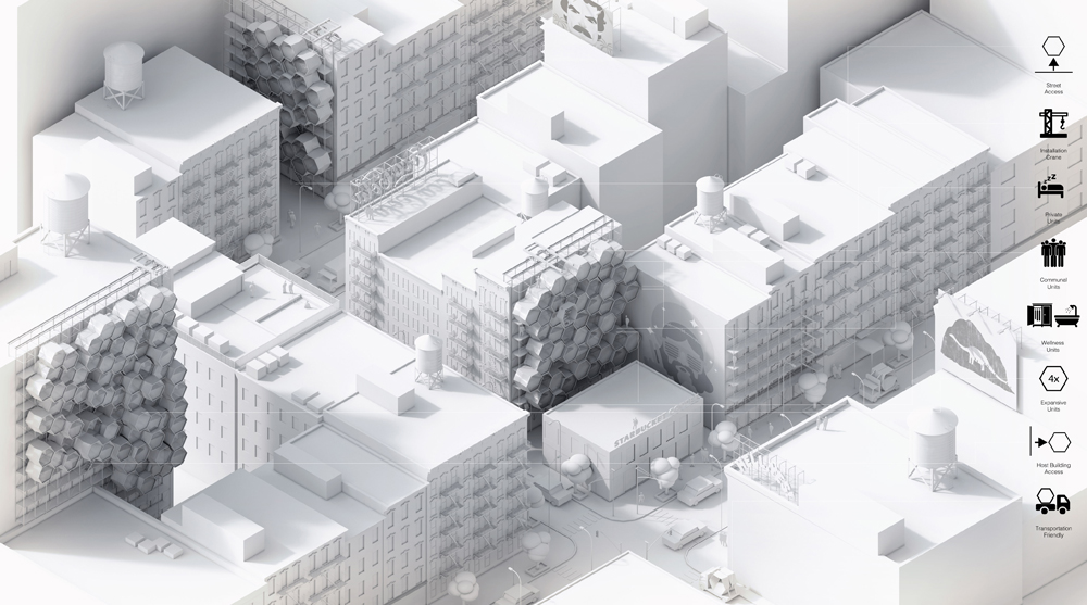 If there is a spectrum linking product design and architecture, Homed falls somewhere in the middle. It responds to environmental conditions, structural requirements, and NYC zoning regulations, and is conceived to support residential program. It also capitalizes on a set of product design tools, as a prefabricated unit with a kit of parts, addressing design objectives through combination and interchangeability rather than customization. The system’s integrated flexibility could permit cost-effective assembly that is modifiable. It could also be disassembled and relocated.