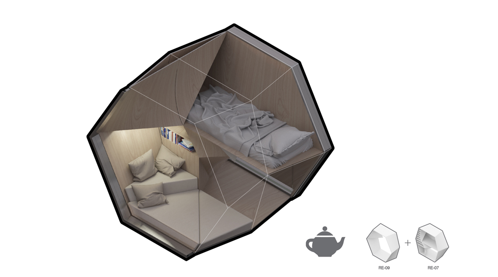 The Homed unit is designed to provide year-round housing that can withstand the winter weather and provide a cool space in the summer. The proposed 3D printed-modules are integrated with furniture, storage, lighting and appliances, and have an exterior skin composed of oxidized aluminum cladding.