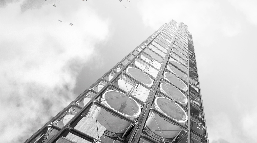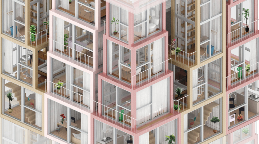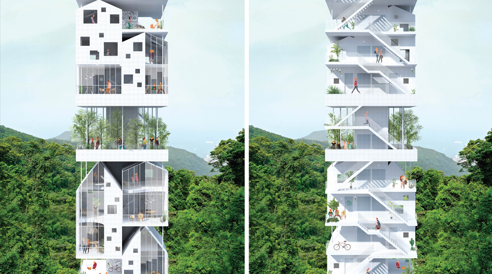 Second prize winners François Chantier and Maria Fernandez from France conceived a 100 square metre area of prefabricated housing units which create a vertical village when the modules are aggregated.