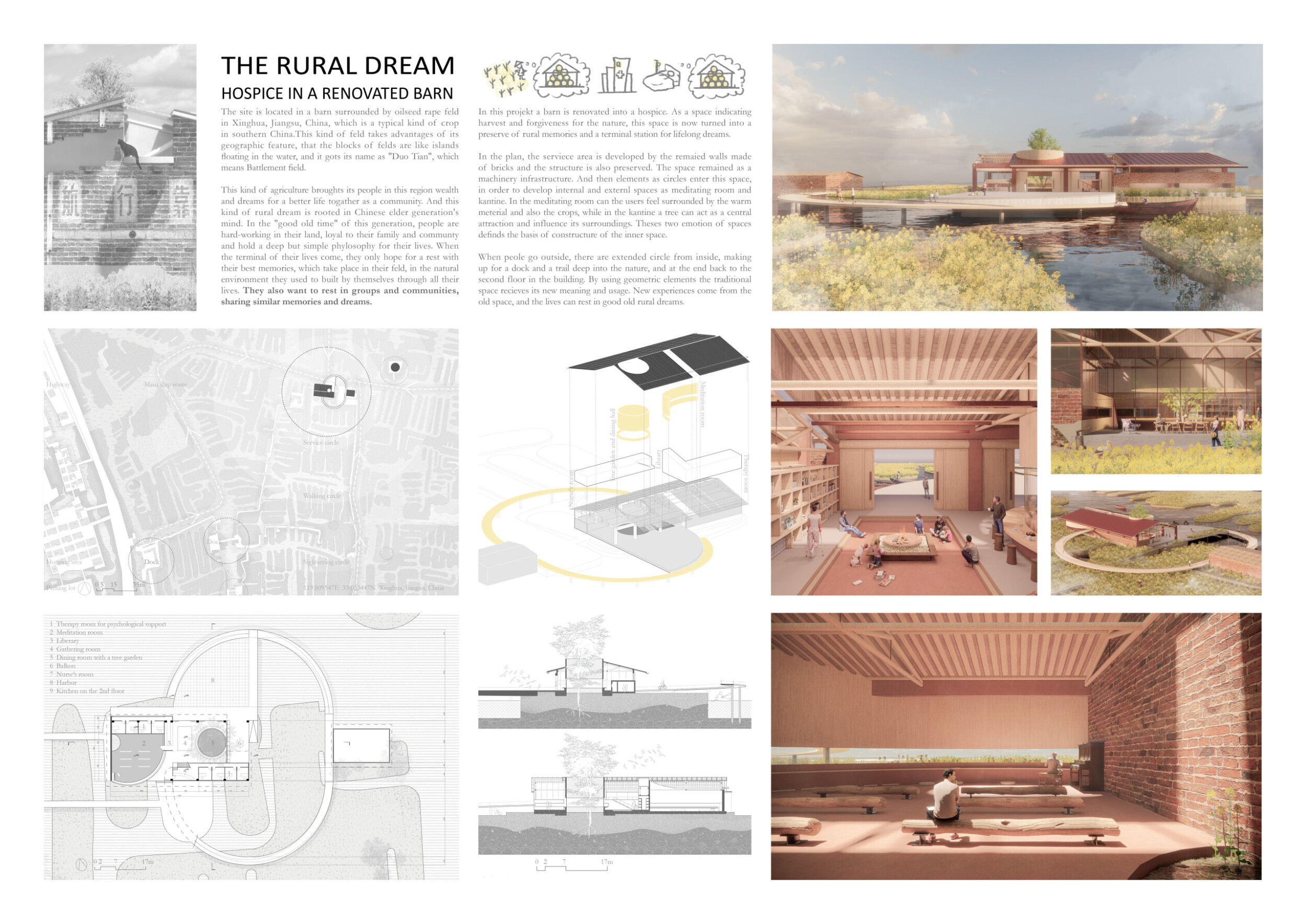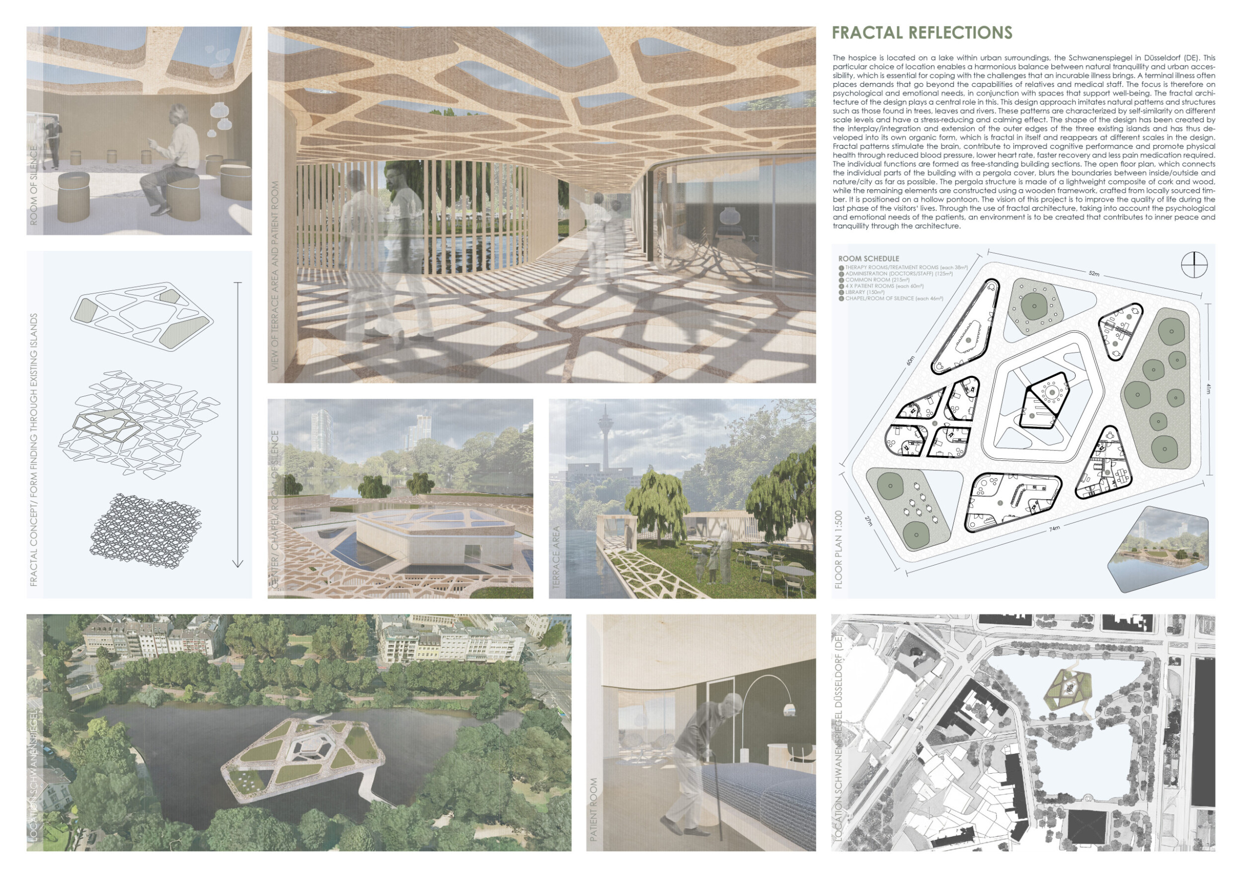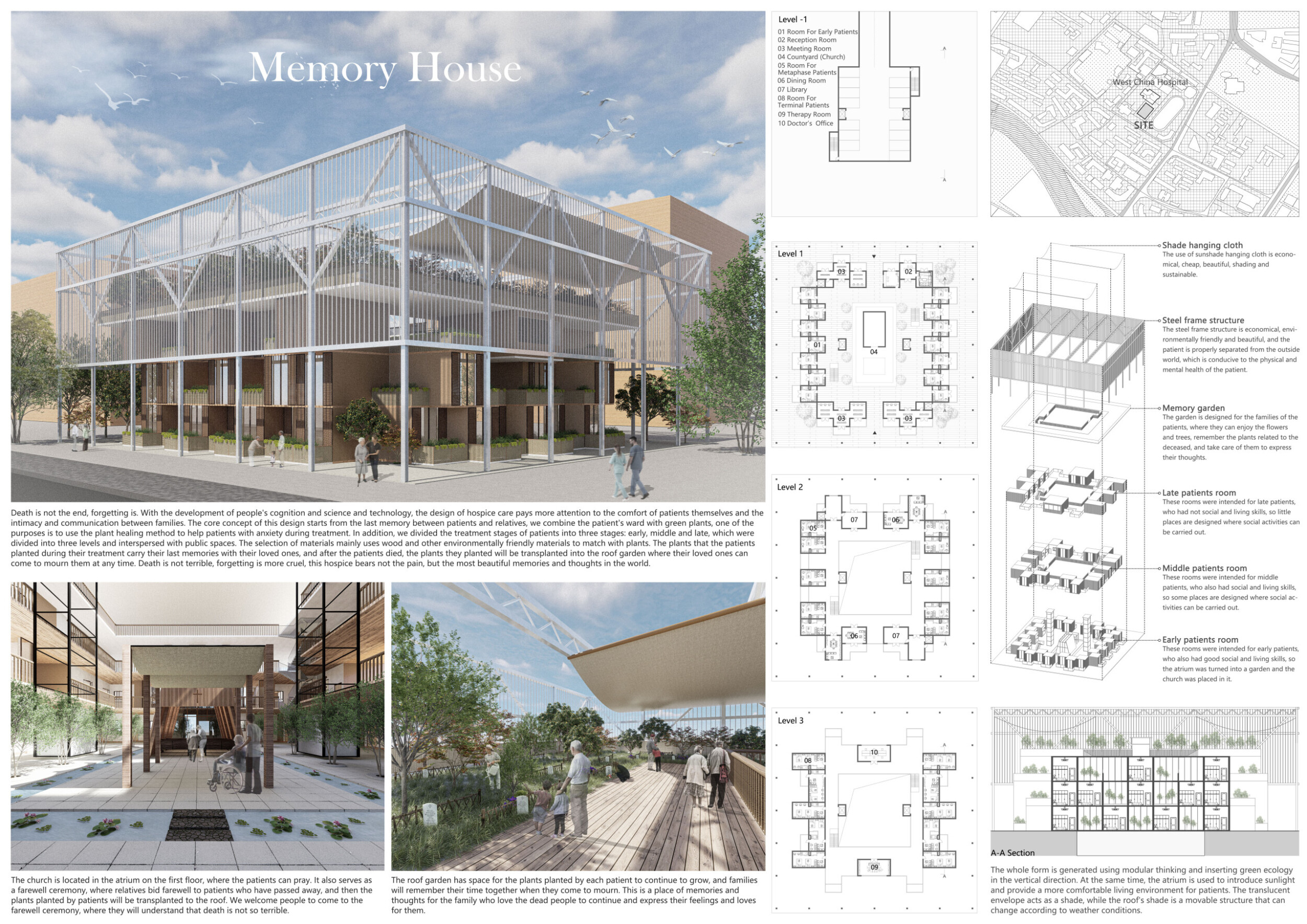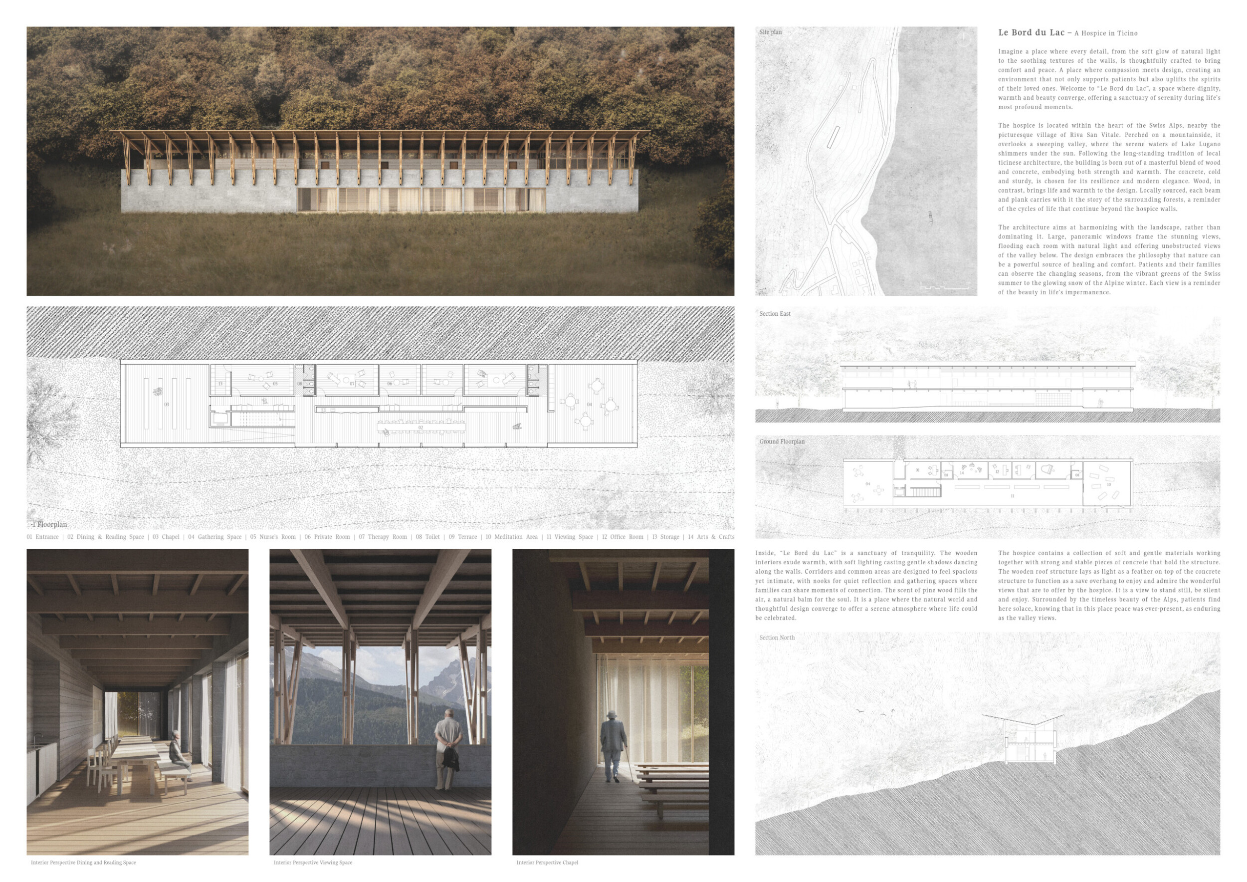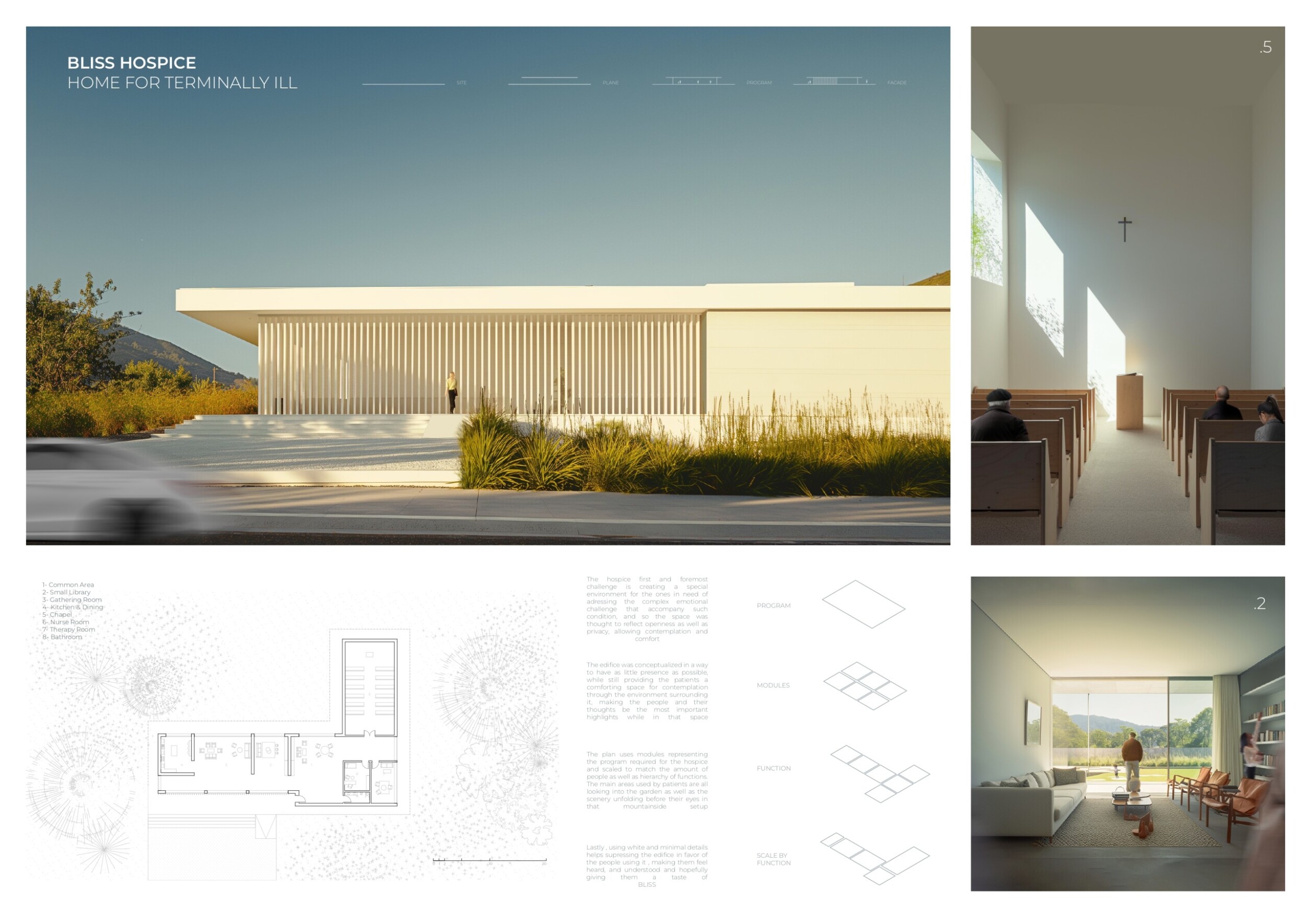 Participants were tasked with designing a facility that accommodates up to fifteen visitors and five staff members, including essential spaces such as a common area with a library, a gathering room, a chapel, a kitchen, a dining room, a nurse’s room, and a therapy room for psychological support. They were encouraged to choose a theoretical site in their own country, allowing them to integrate local cultural, environmental, and social contexts into their designs. The competition aimed to showcase how thoughtful design can provide comfort and support during challenging times.