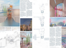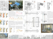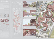 The project offers a unique perspective and plan that highlight its distinctive form and overall layout. Read more The presentation would greatly benefit from the use of larger and more varied texts: currently the text is small and hard-to-read; and the main text is the same size and font as the annotations, lending to an imbalance and lack of hierarchy - where should the reader focus for key information? The sectional axonometric, while visually interesting, would benefit from lighter shadows and more varied colors, as it currently appears dark. Additionally, the large sectional drawing provides a good understanding of spatial arrangement but could use more varied line weights to distinguish between cut lines and elevation lines, as well as offer more details on materiality.