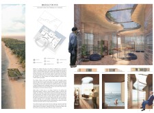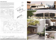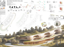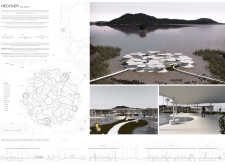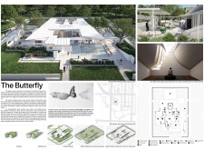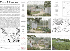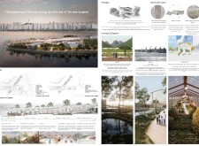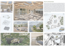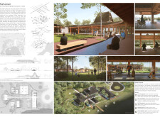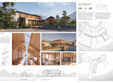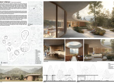 The presentation showcases many excellent features, including a unique sketch-style aerial perspective and a richly detailed site plan that beautifully convey the project's aspirations and how it adapts to its surroundings. The renderings effectively illustrate the project's scale and materiality, with its many cell-like structures fitting seamlessly into the surrounding forest. Read more However, the text would benefit from revision, as it is currently presented in small, dense blocks that are difficult to read. Dividing the text into clearer, more concise points, with highlighted or bold words to emphasize key ideas, would improve readability. Additionally, including a construction-level detail of the structure or roof would greatly enhance the proposal by demonstrating its feasibility as a buildable work of architecture.