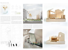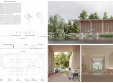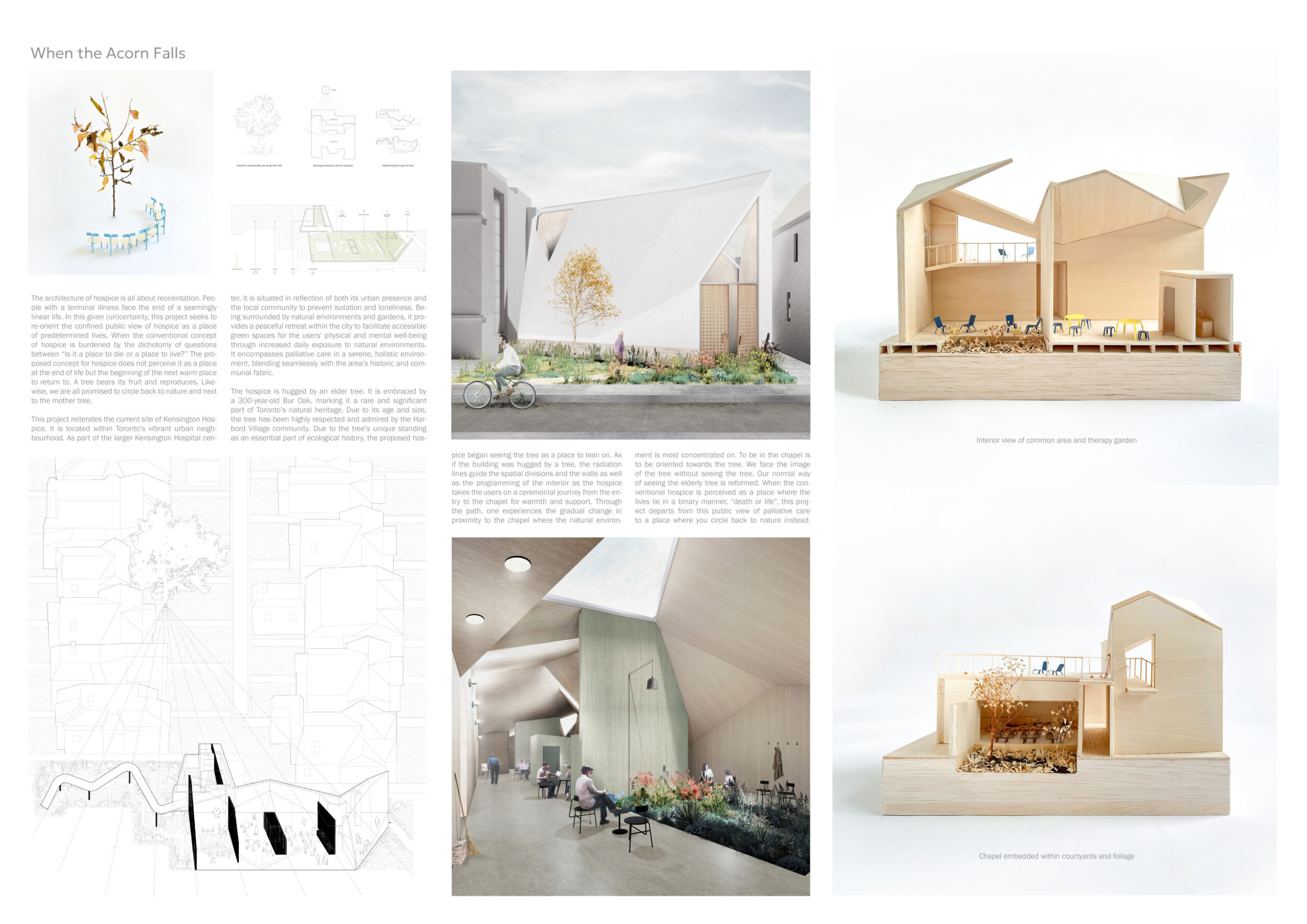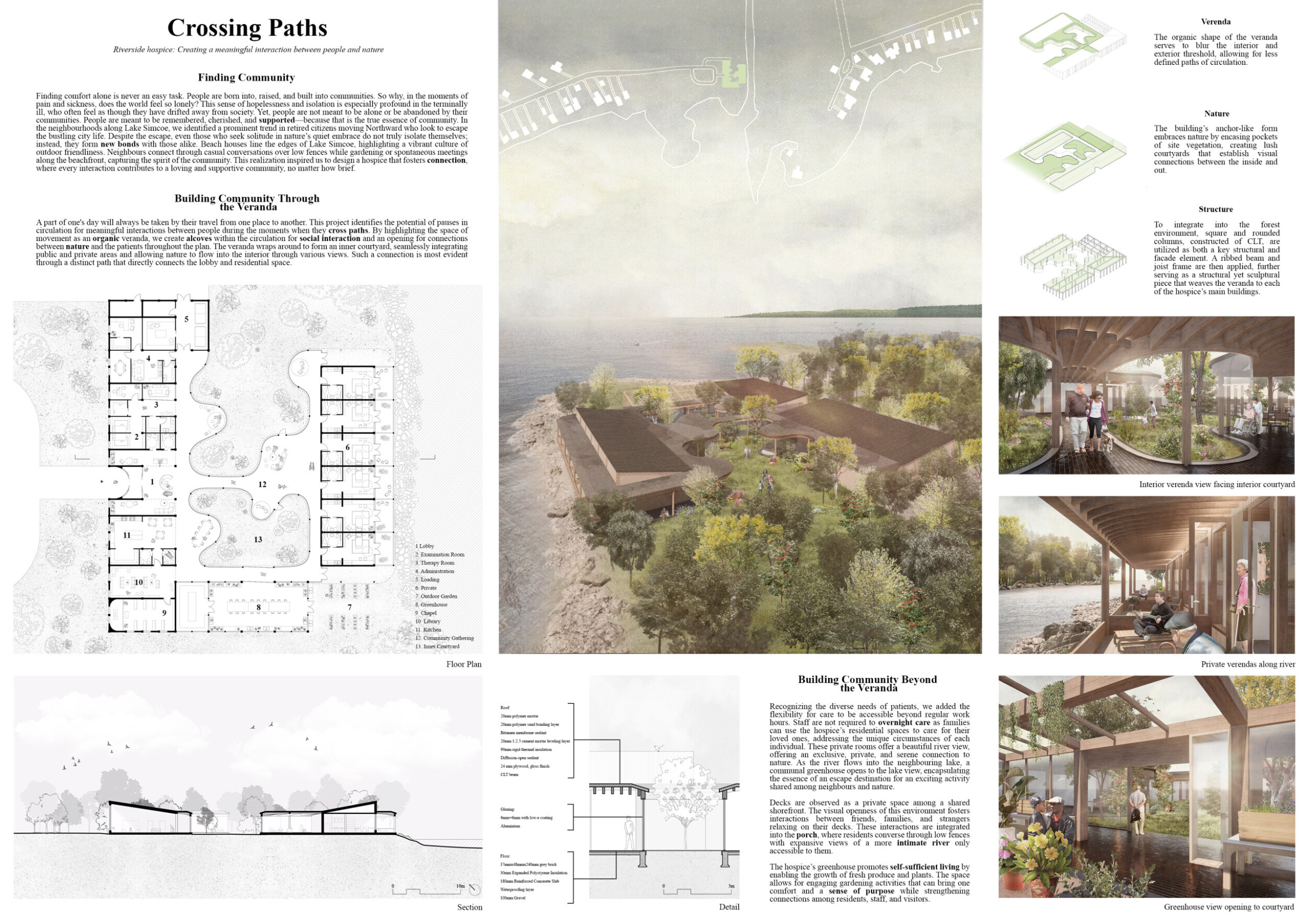 Crossing Paths is designed to foster meaningful connections between people and nature. Located near Lake Simcoe, Canada, the project draws inspiration from the area's vibrant, outdoor-friendly community. The hospice creates opportunities for interaction, countering the isolation often felt by the terminally ill. Central to the design is an organic veranda that forms alcoves for social encounters and connects public and private spaces, bringing nature into the building. Read more Private rooms offer serene river views, while a communal greenhouse encourages gardening and strengthens bonds among residents, staff, and visitors. The use of CLT columns and ribbed beams seamlessly integrates the hospice into the forest, enhancing the relationship between the built environment and the natural landscape.