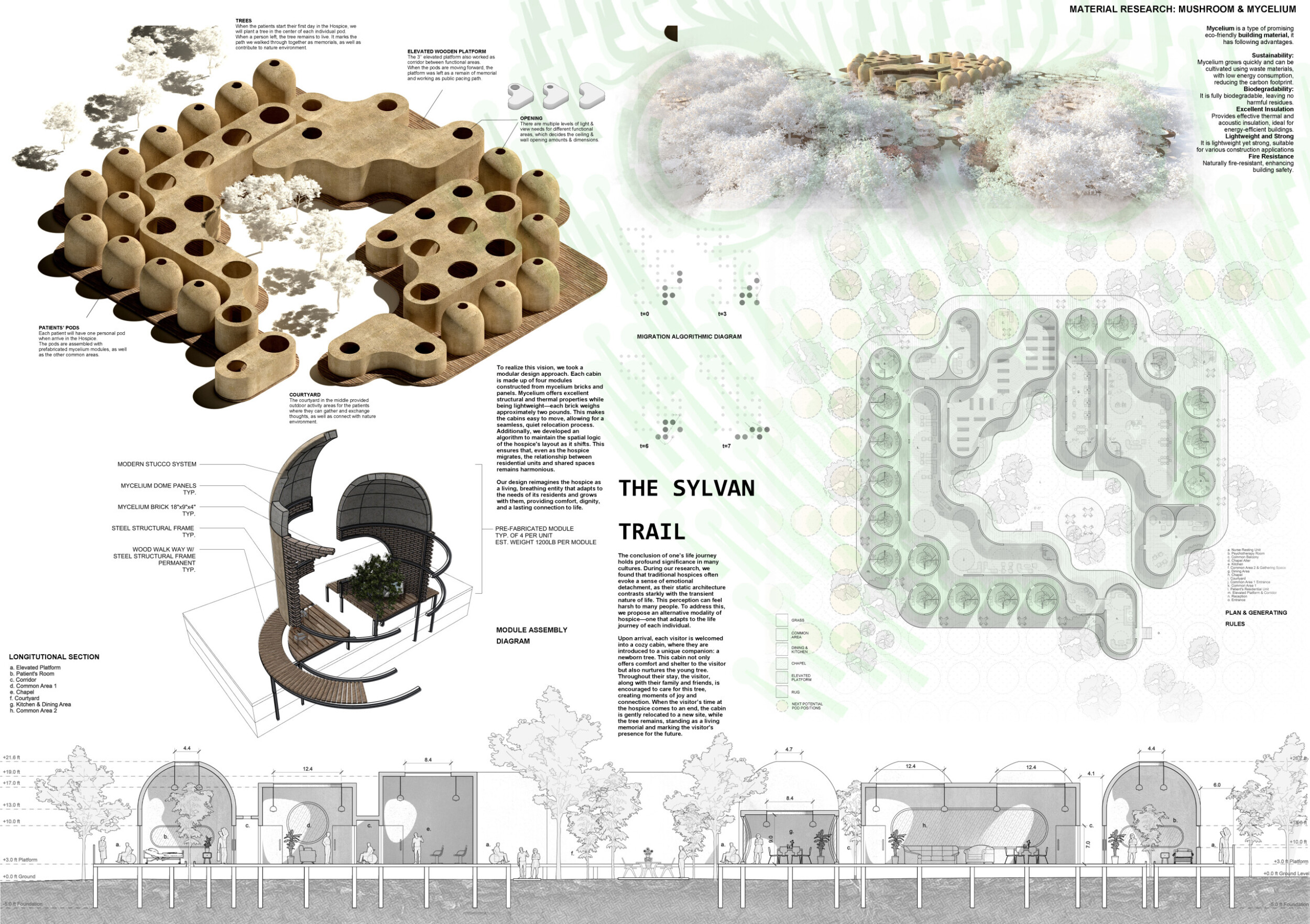 A great idea to couple the individual pod with the tree which remains behind after the patient departs and the pod is relocated. The use of mycelium as a building material is commendable. The focus is on the individual journey, though not much on the shared, communal experience. Also, when the pods move, the platform will need to be extended or re-configured in some way.