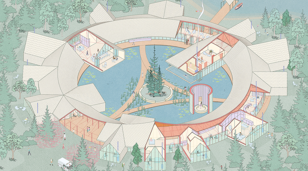 An esteemed international jury, including Alan Dunlop, Paul Monaghan, Dr. Nirit Pilosof, and others with deep expertise in healthcare and human-centered design, reviewed submissions from around the world. First prize was awarded to Marinus A. Wouters and Britt P. H. Segeren from the Netherlands for Our Light—a modular timber scheme inspired by rituals of remembrance and designed to dissolve the boundary between public and private experience. Second prize went to Xiaojin Huang, Gerald Yi En Low, and Melissa Chong from Australia for Held Between Eucalyptus and Walls, a nature-immersed concept built from rammed earth and timber. Third prize was awarded to Pierre-Charles Gauthier from Canada for Memory House, a gentle, circular hospice rooted in the emotional rhythms of memory and seasonal change.