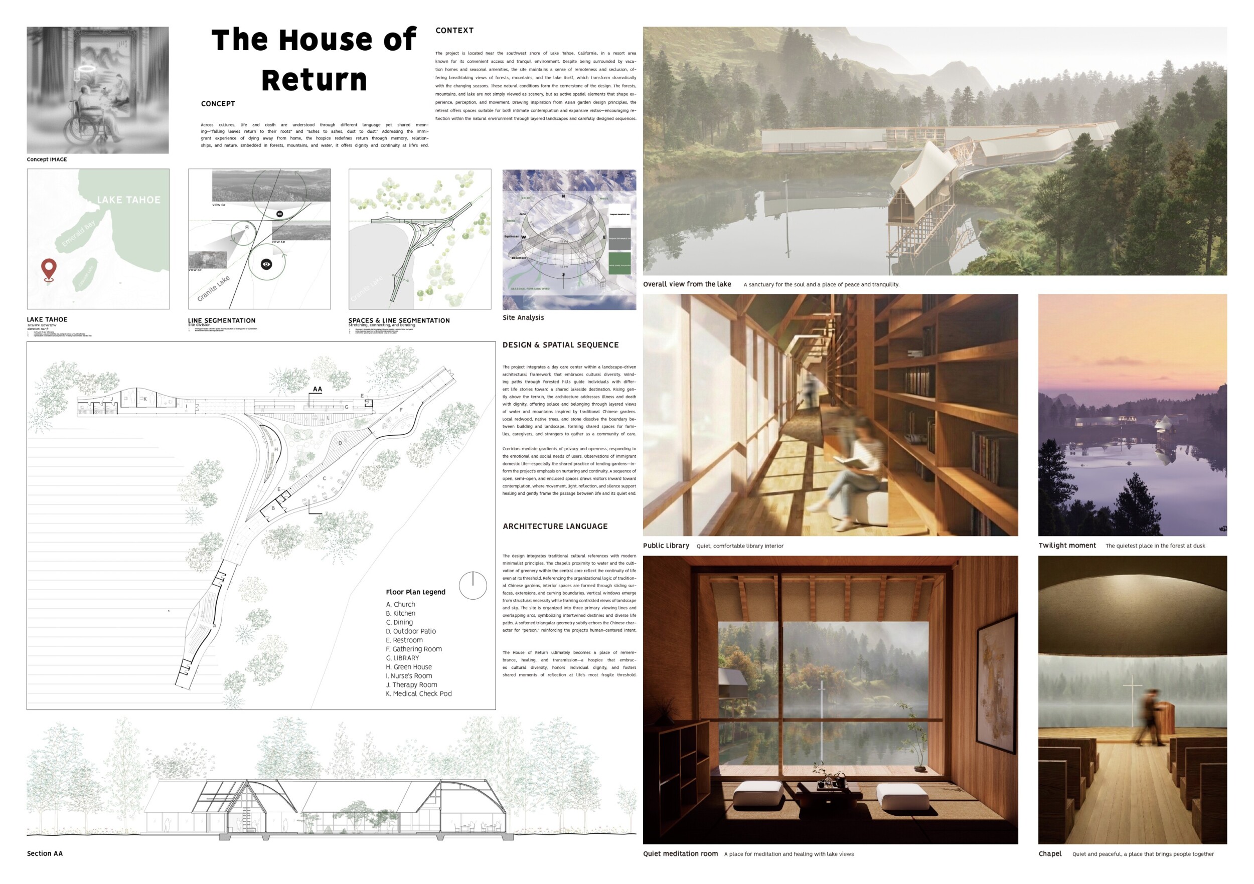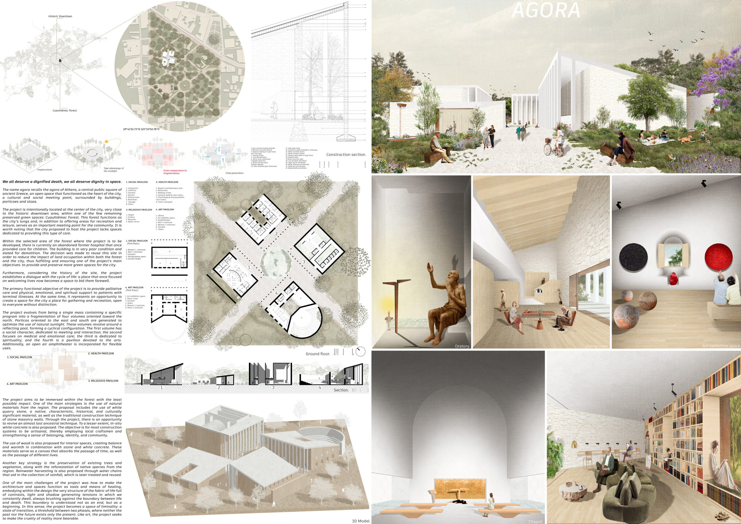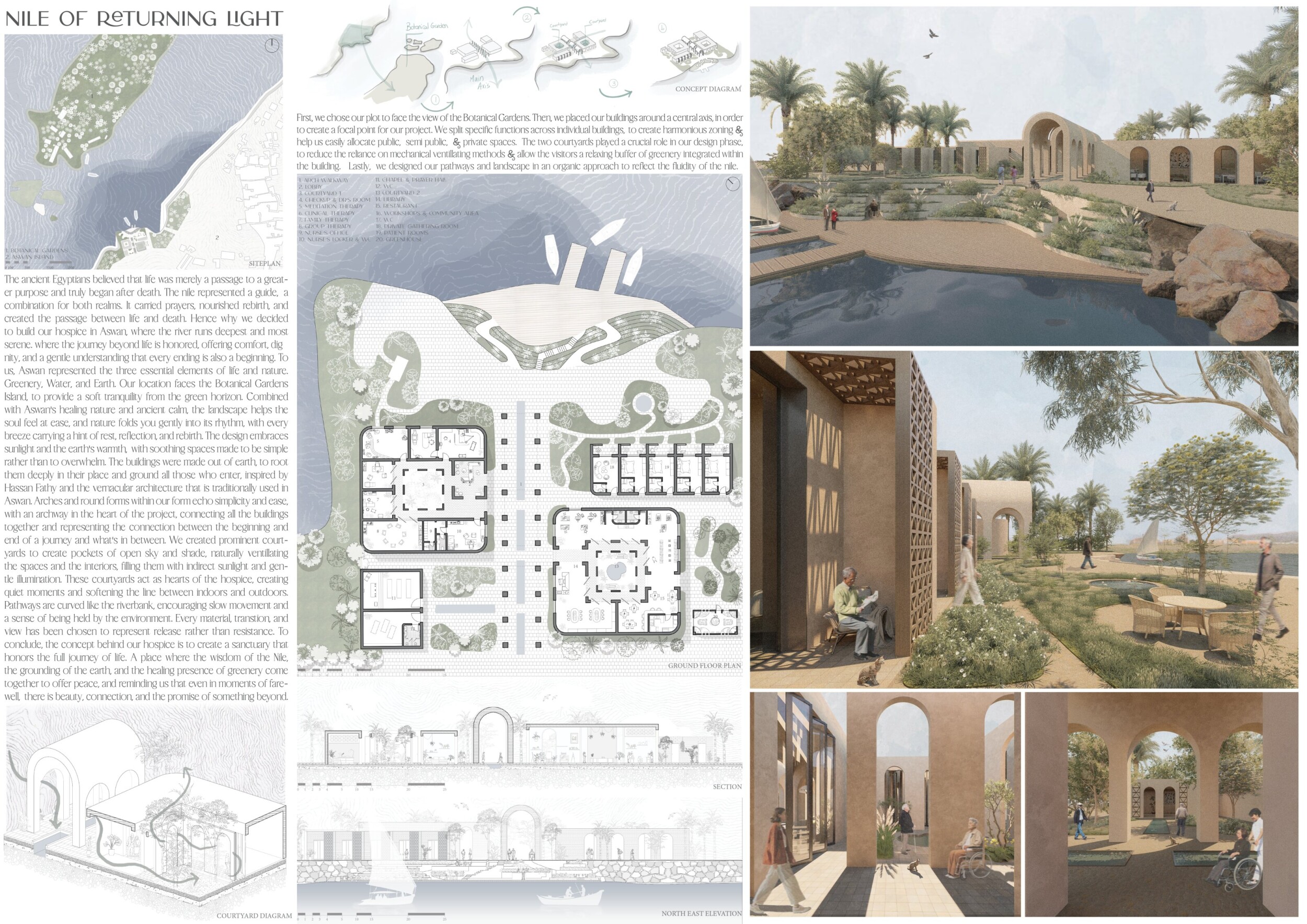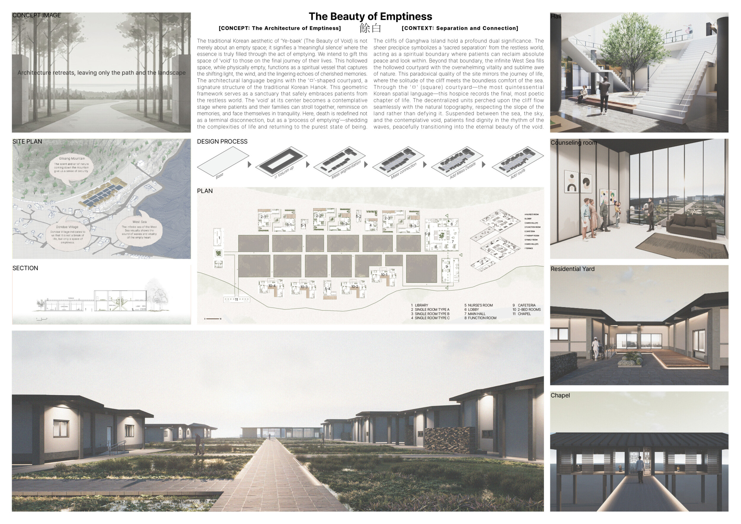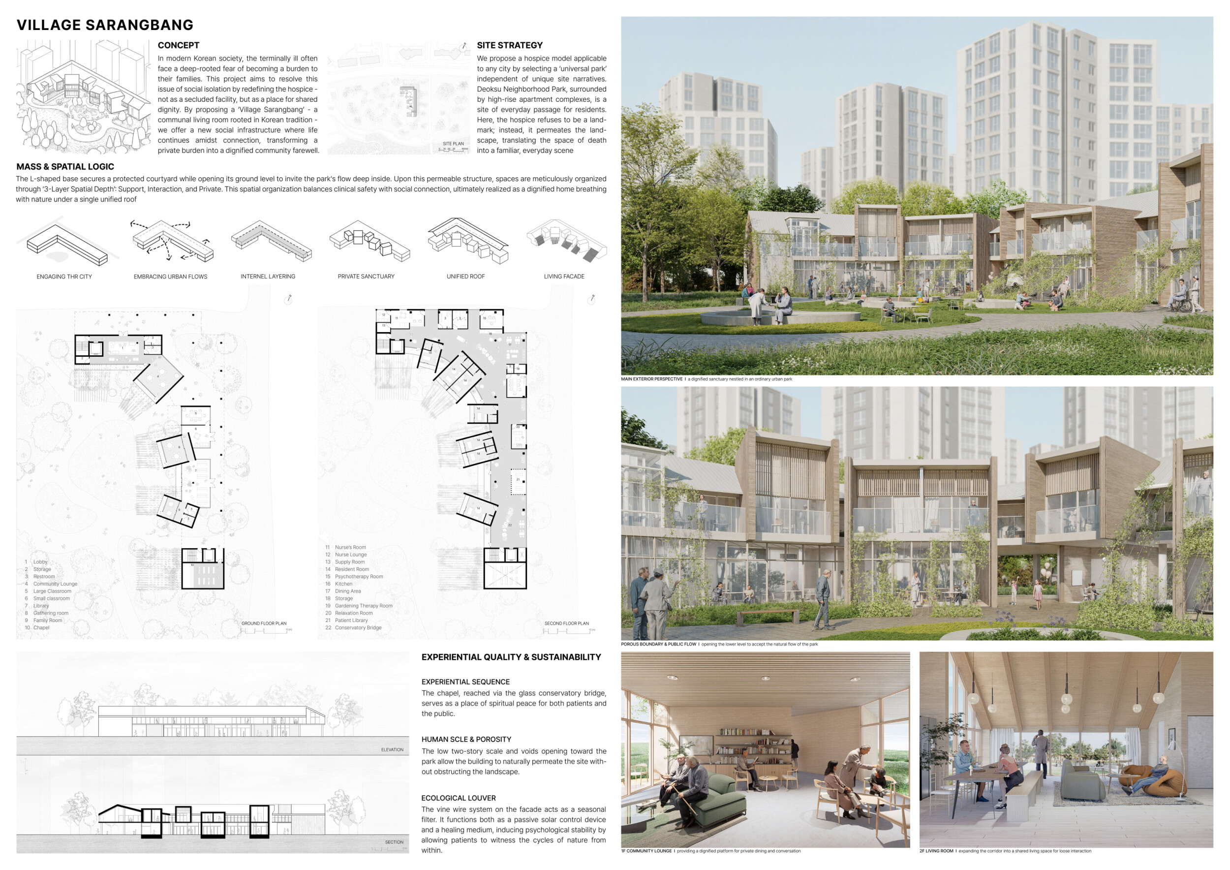 The response to the brief revealed a number of shared themes across submissions. Many projects explored the integration of hospice environments within everyday urban or community life, positioning care as part of the social fabric rather than isolating it at the margins. Others emphasized the role of landscape and nature—courtyards, gardens, and quiet exterior spaces—as essential settings for reflection and emotional well-being. Several proposals also framed hospice architecture as a broader civic infrastructure, introducing community-oriented programs and shared spaces that allow care environments to remain connected to the rhythms of daily life.