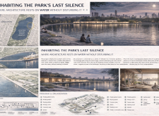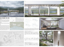 The presentation conveys a calm and carefully crafted visual narrative, pairing precise technical drawings with atmospheric renderings that effectively communicate the contemplative character of the project. Plans, sections, and details are clearly drafted, demonstrating strong line control and graphic discipline, while the layout organizes information in a logical sequence that moves from concept diagrams to spatial experience.