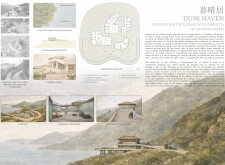 The presentation communicates the proposal’s conceptual ambition through a composed and atmospheric graphic language. Plans, sections, and diagrams clearly articulate the concentric organizational strategy, allowing the viewer to understand the spatial relationship between private care environments and the surrounding layers of family and community functions.