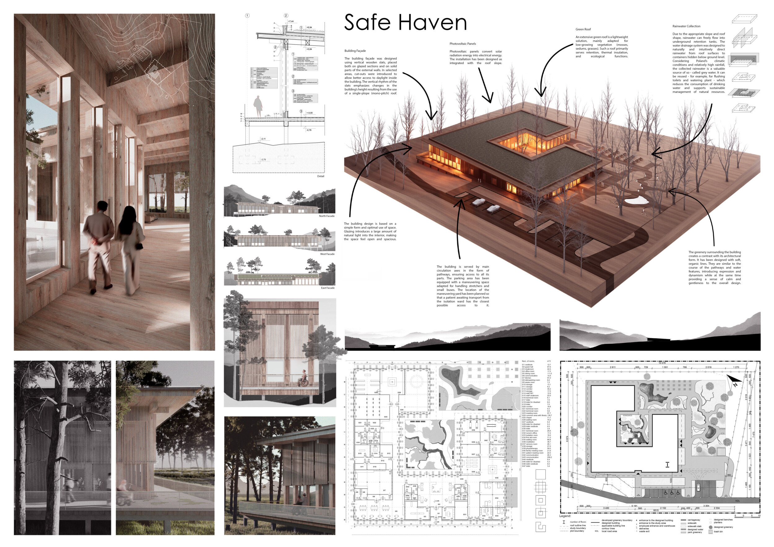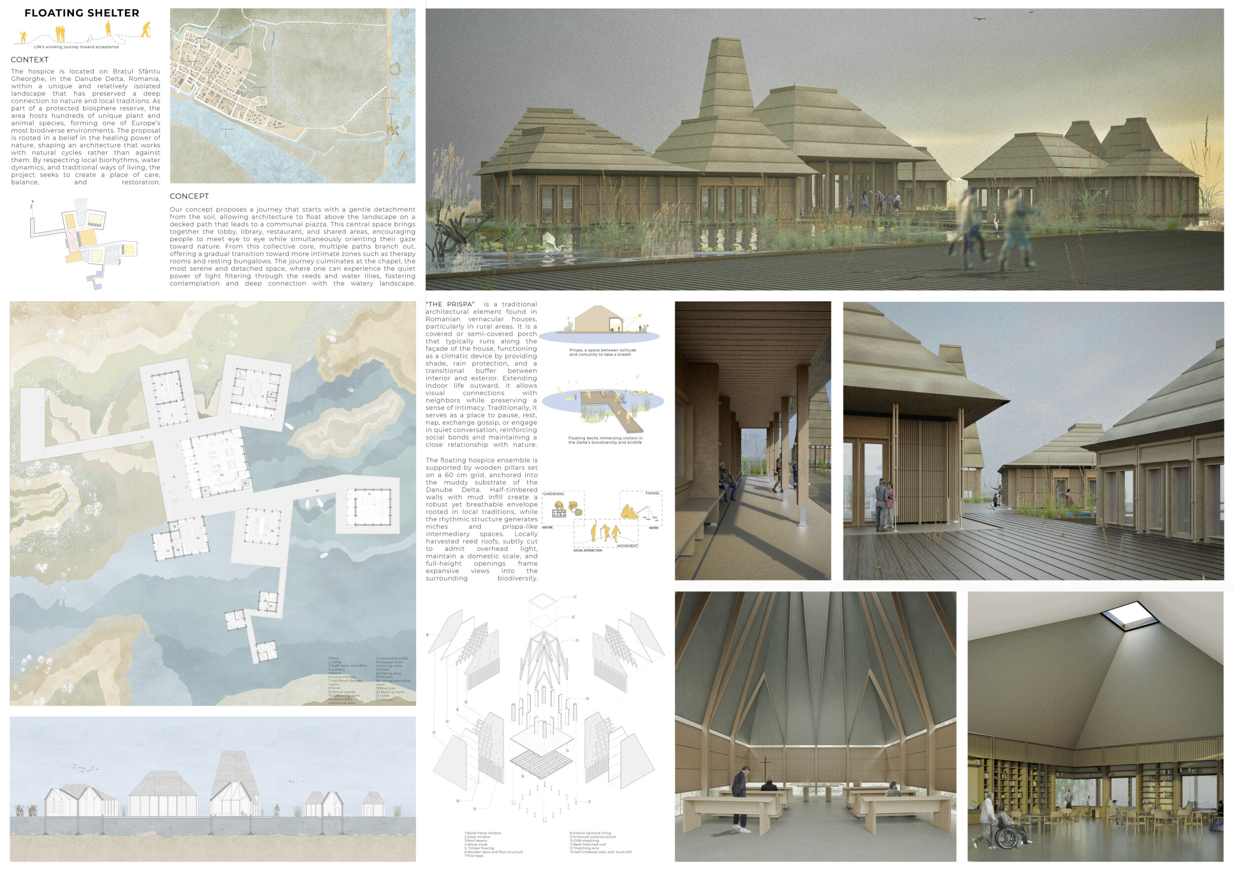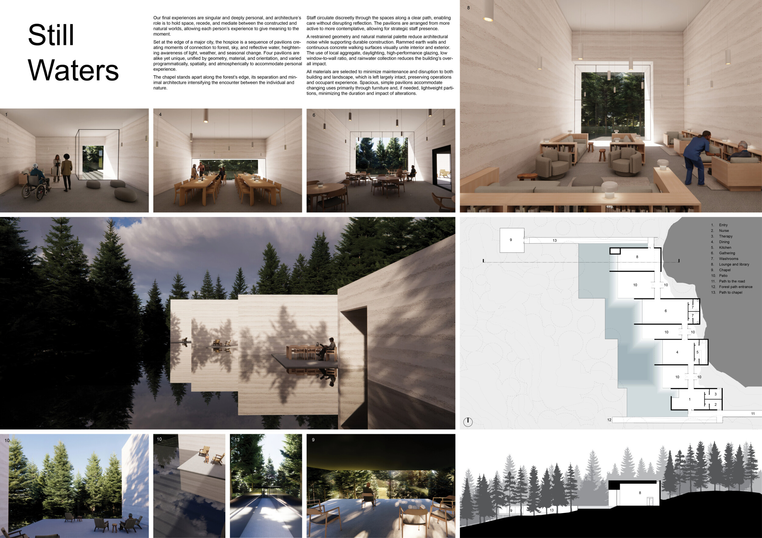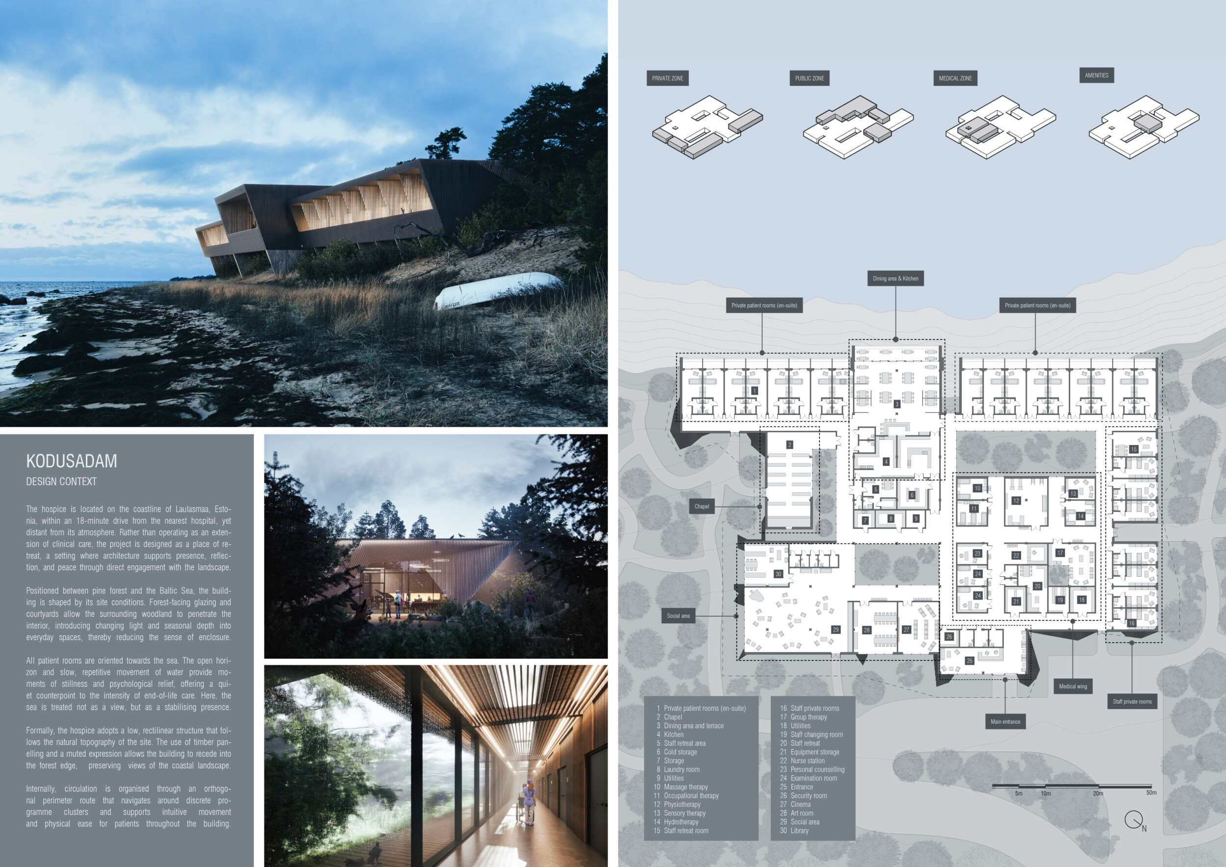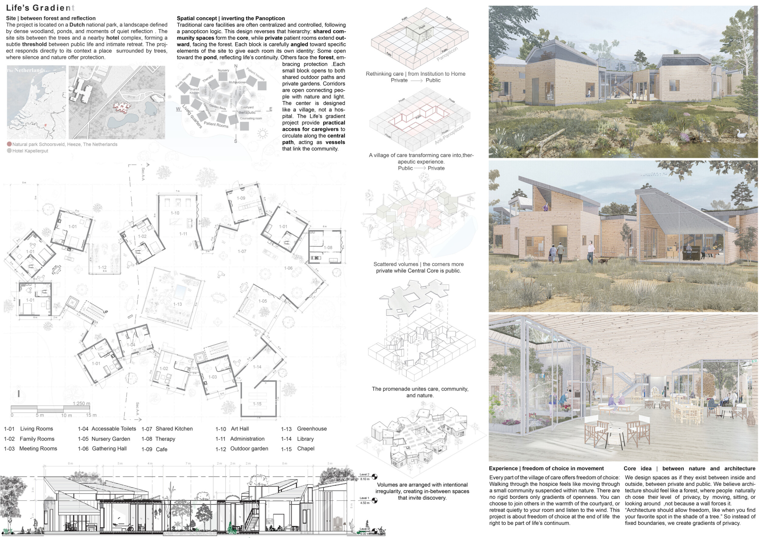 Participants were asked to propose a hospice accommodating up to fifteen visitors and five staff members, including spaces for contemplation, gathering, and spiritual support such as a library, communal areas, therapy rooms, and a chapel. The brief encouraged designers to think beyond purely clinical models, exploring how architecture can act as an instrument of comfort and companionship while balancing privacy with opportunities for social interaction.