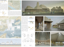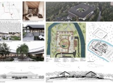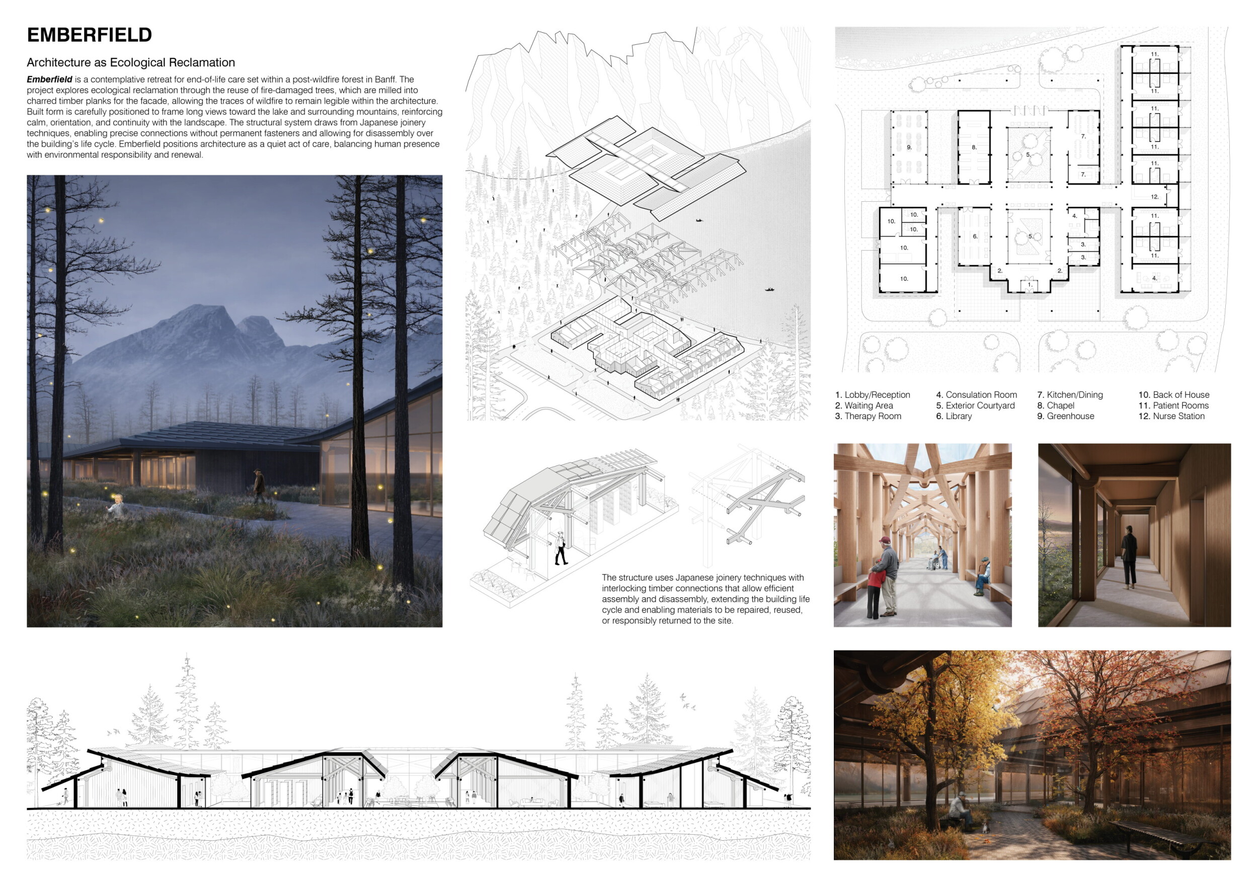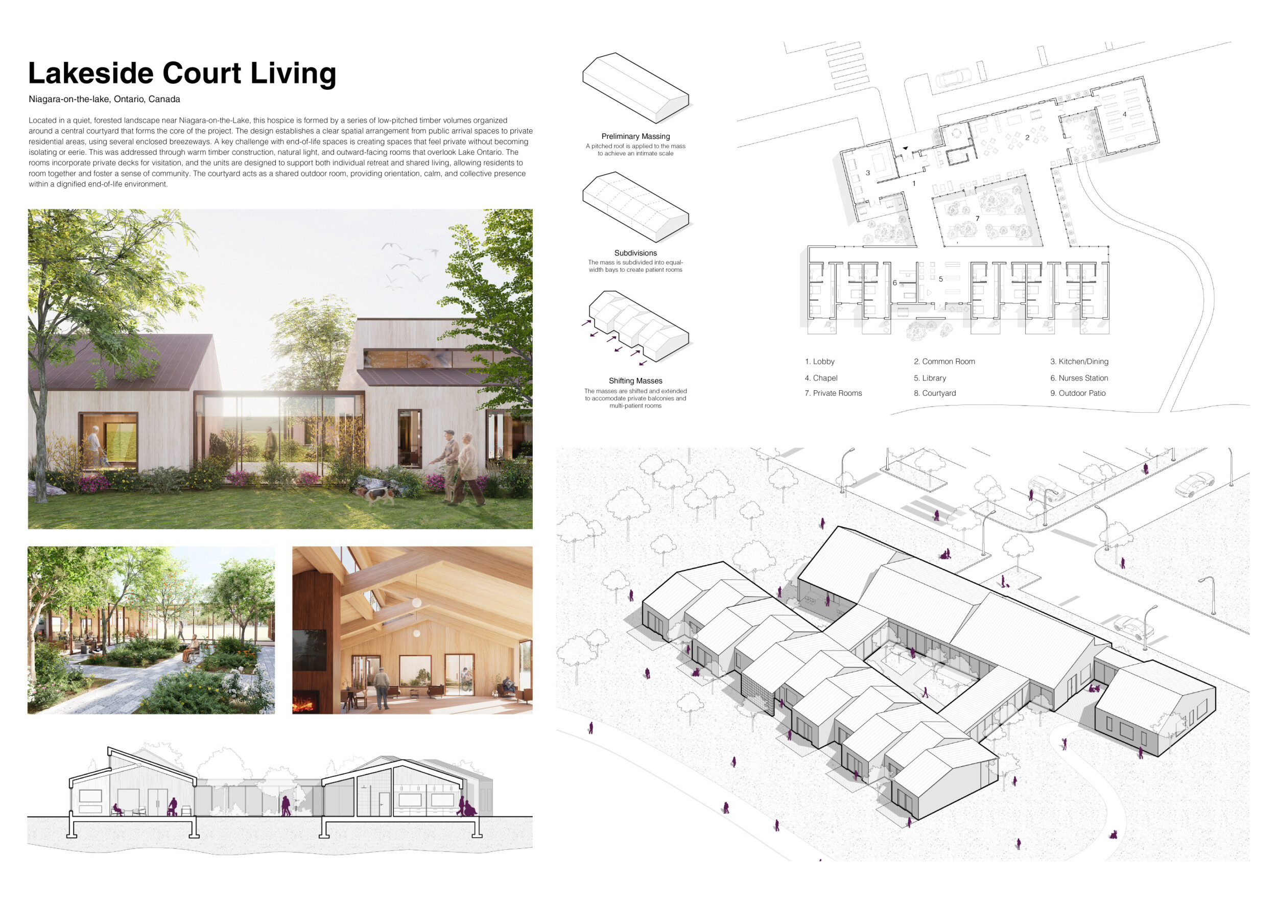 Loose Bonds, Lasting Care proposes a hospice environment structured around the idea of community as a supportive ecosystem rather than a purely clinical institution. The design organizes the program around a central courtyard that anchors shared spaces while smaller residential volumes extend outward, forming a constellation of intimate living environments embedded within a landscaped setting.