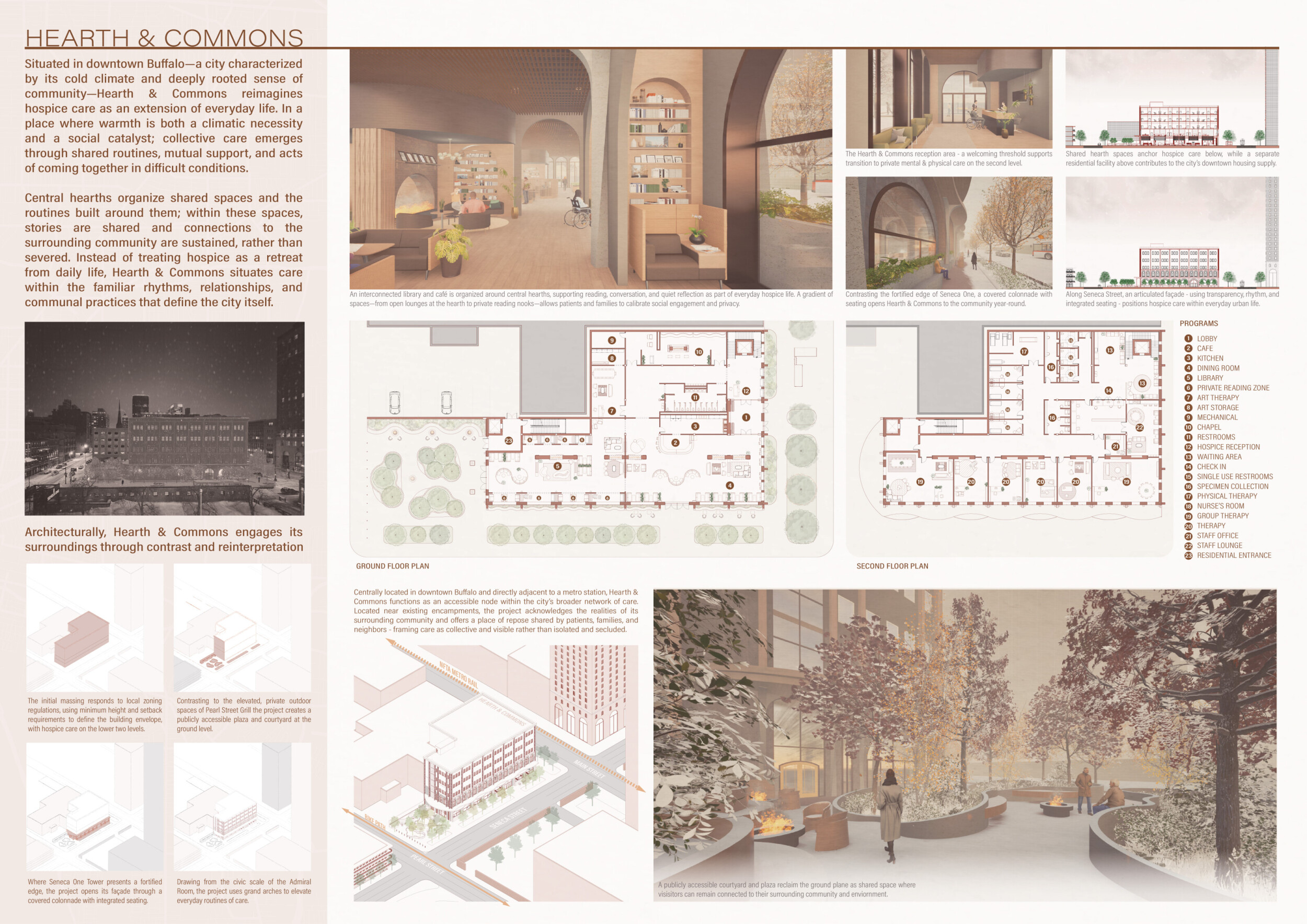 Within Reach reimagines hospice care as an integral component of everyday urban life rather than an isolated institution. Situated within a dense neighborhood context, the proposal organizes the program through a concentric spatial framework that gradually transitions from intimate spaces of care to broader layers of community interaction. At the center lies a calm, protected environment for patients, structured around landscaped courtyards, shared interior gardens, and contemplative spaces.