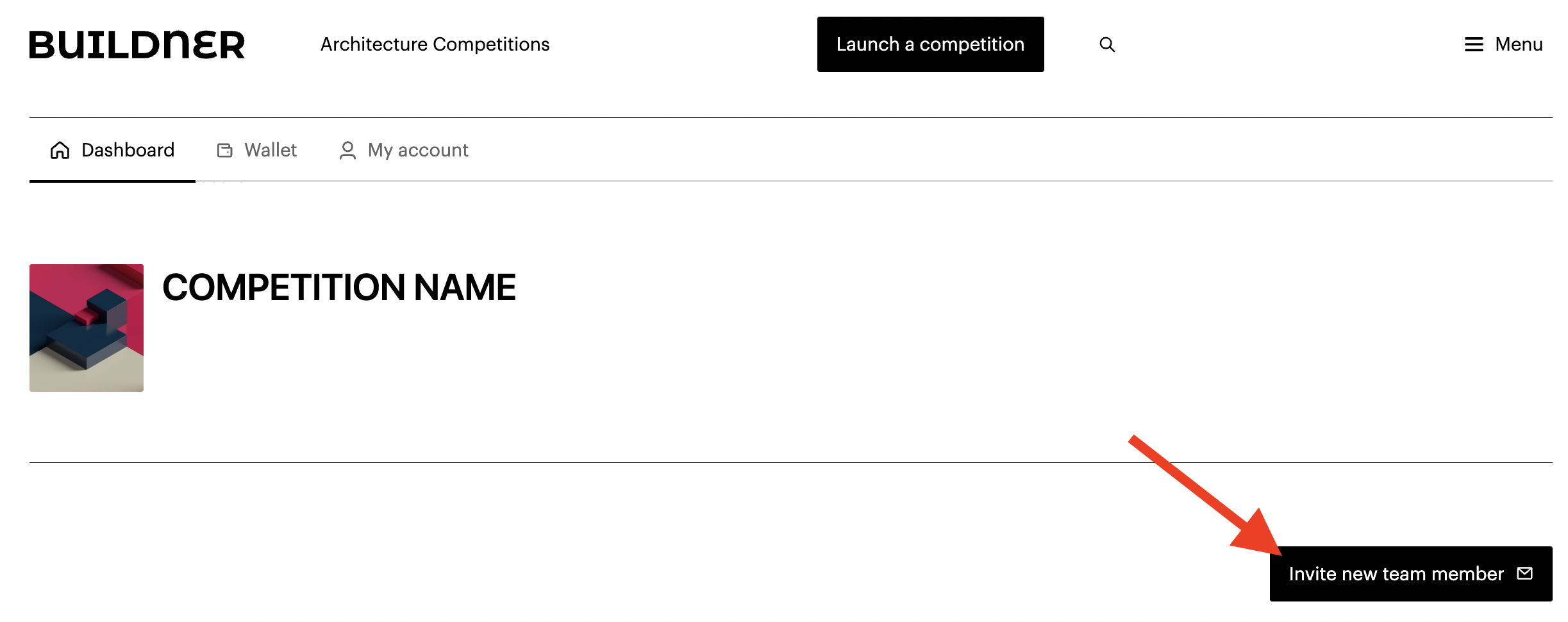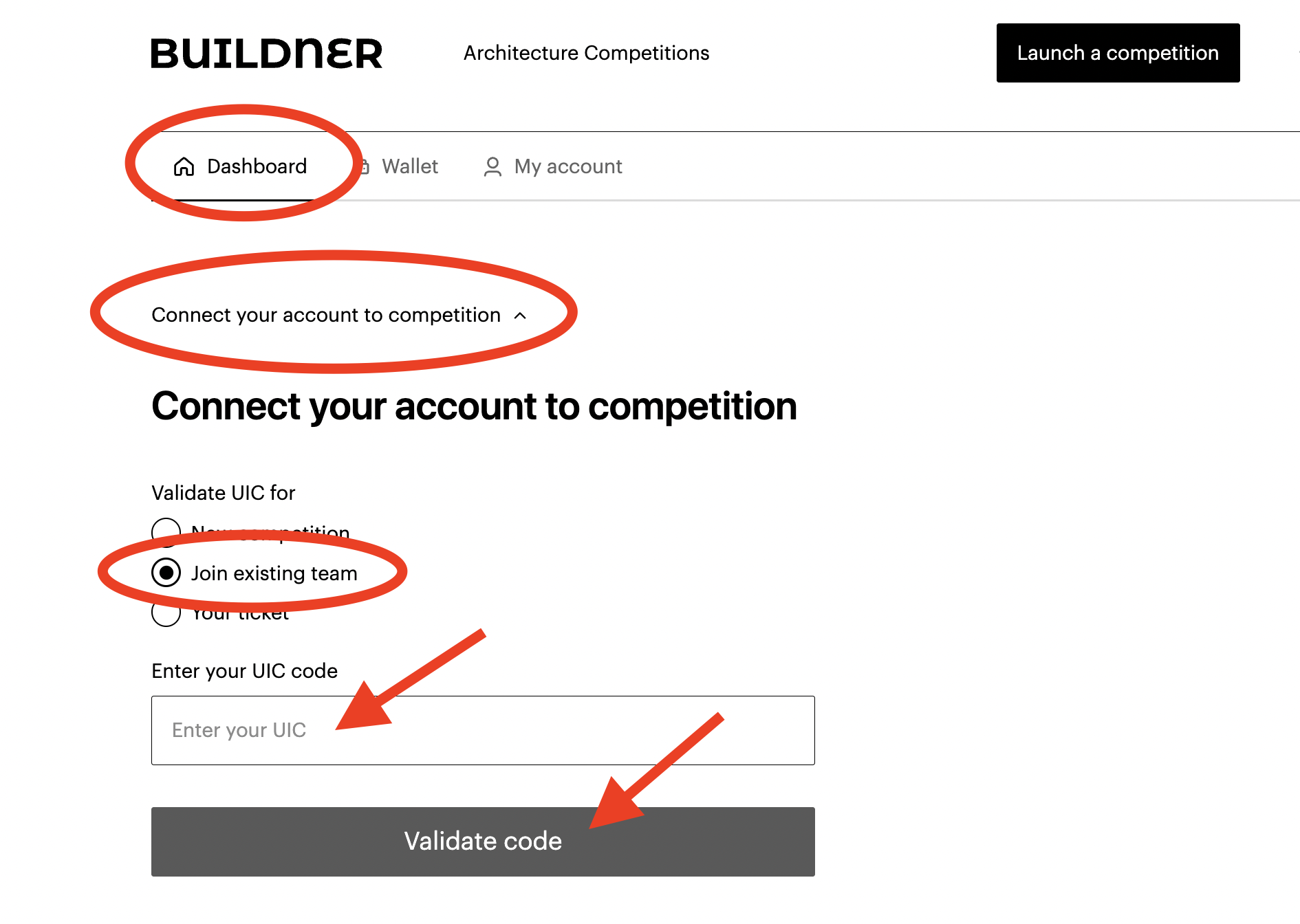The potential new team member must then complete log in to their Buildner account (https://architecturecompetitions.com/login) using their own Architects' Network (https://an.pro) credentials. Afterward, they should click on "Join existing team" and enter the same UIC code that Team Leader sent them.