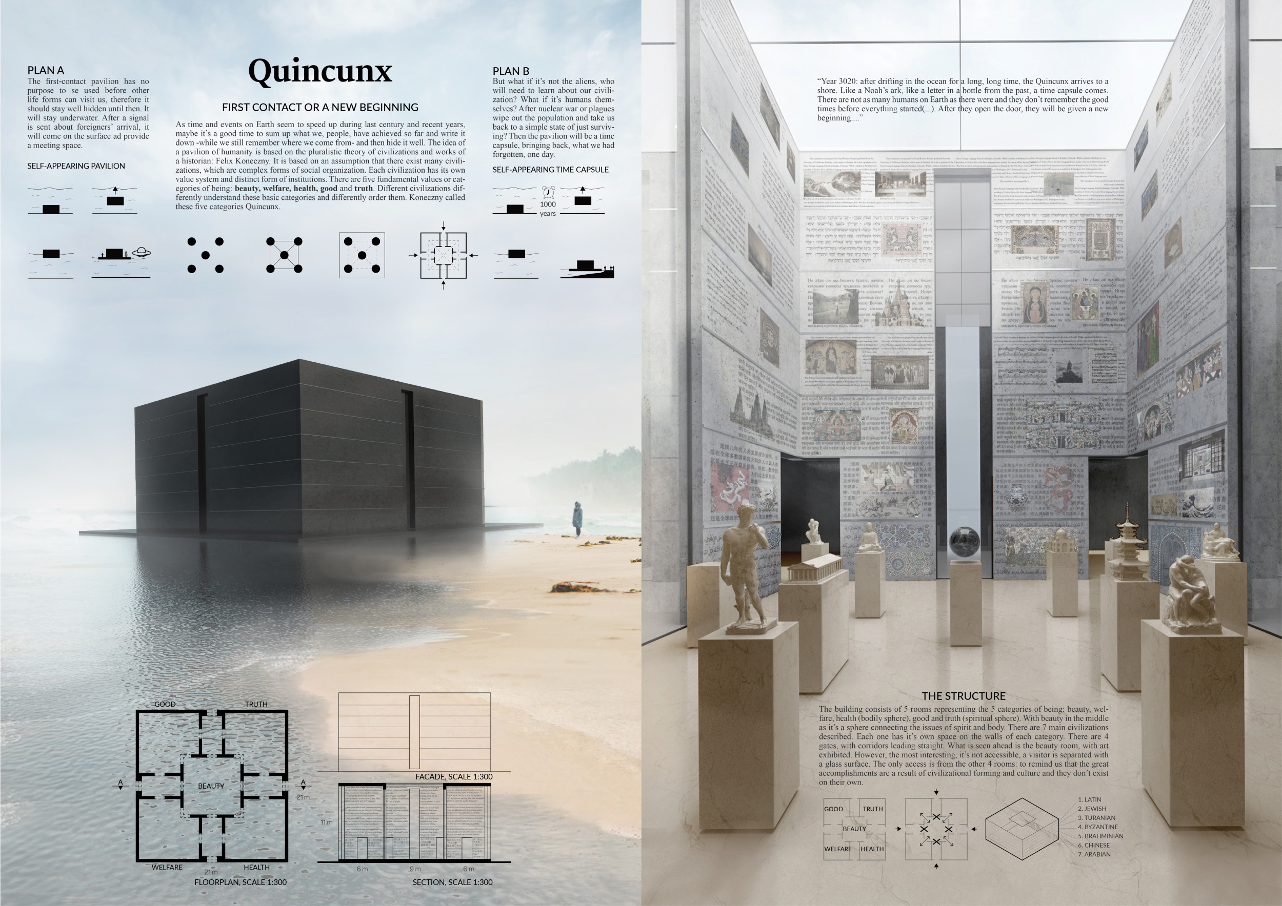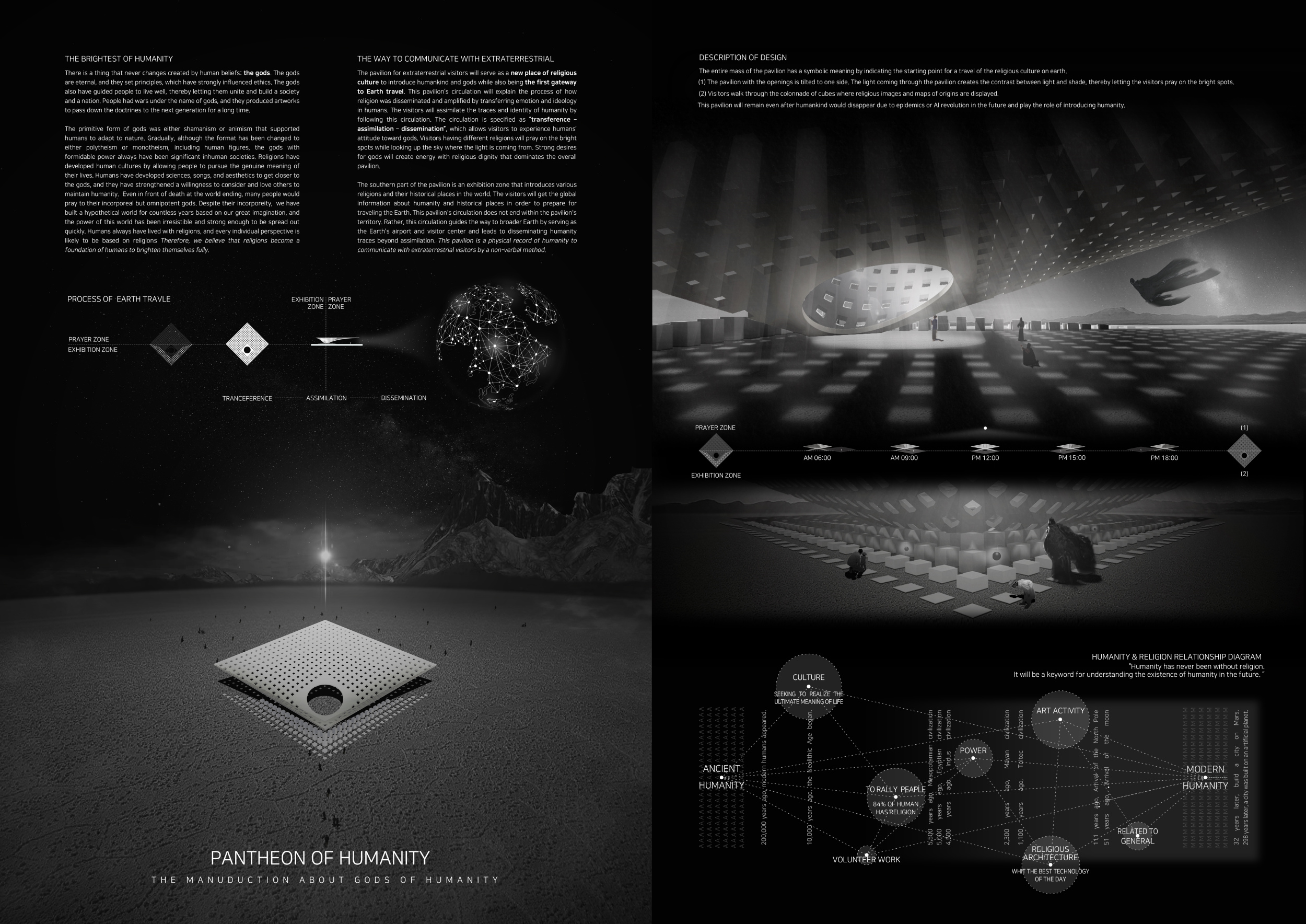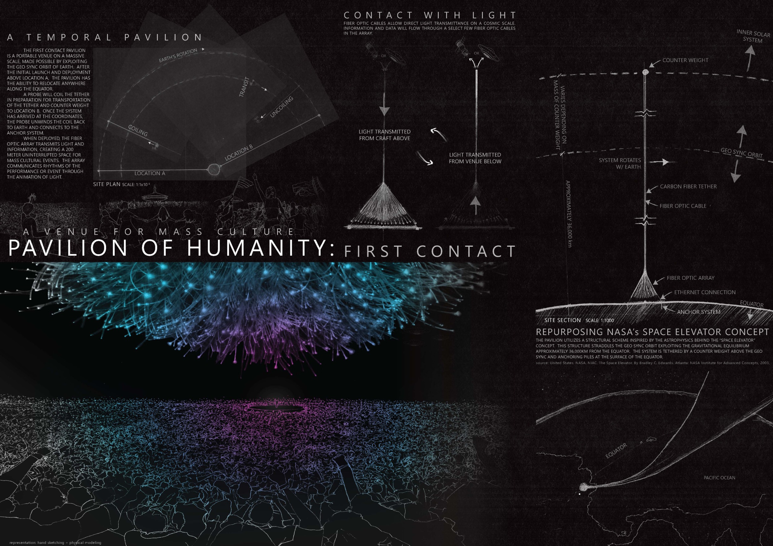 The Pavilion of Humanity: First Contact ideas competition tasked participants with designing a structure encapsulating the best and brightest of our species in a way that, should we ever be visited by extraterrestrial lifeforms, would appropriately communicate the achievements of human civilization in a single space, constructed on a site chosen by the participants located anywhere on Earth.