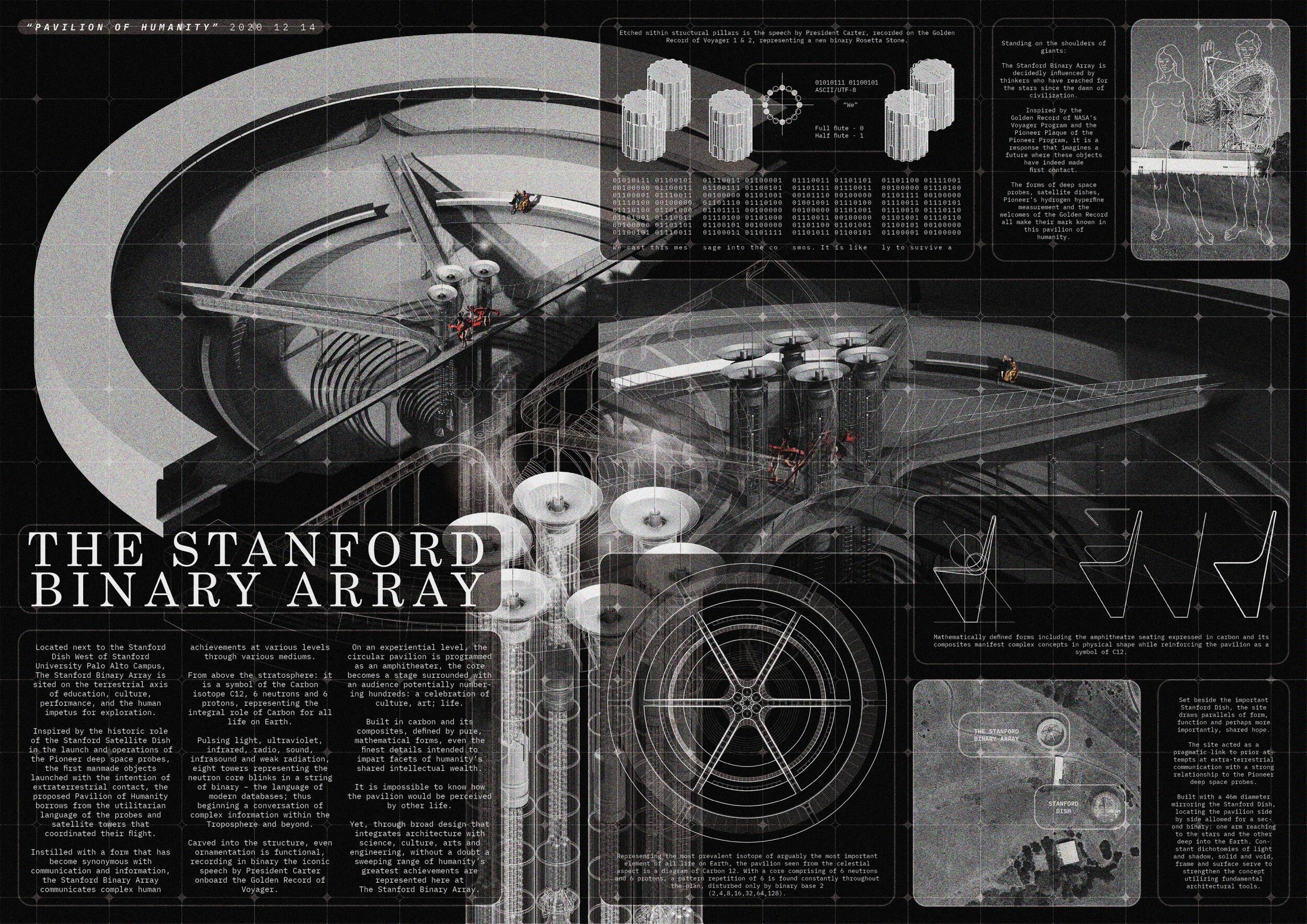 The Stanford Binary Array proposes a pavilion set next to the Stanford Satellite Dish on the Palo Alto campus. Its form is inspired by the historic satellite – the first manmade object launched with the intent to make extraterrestrial contact.