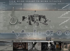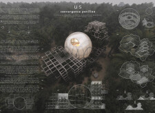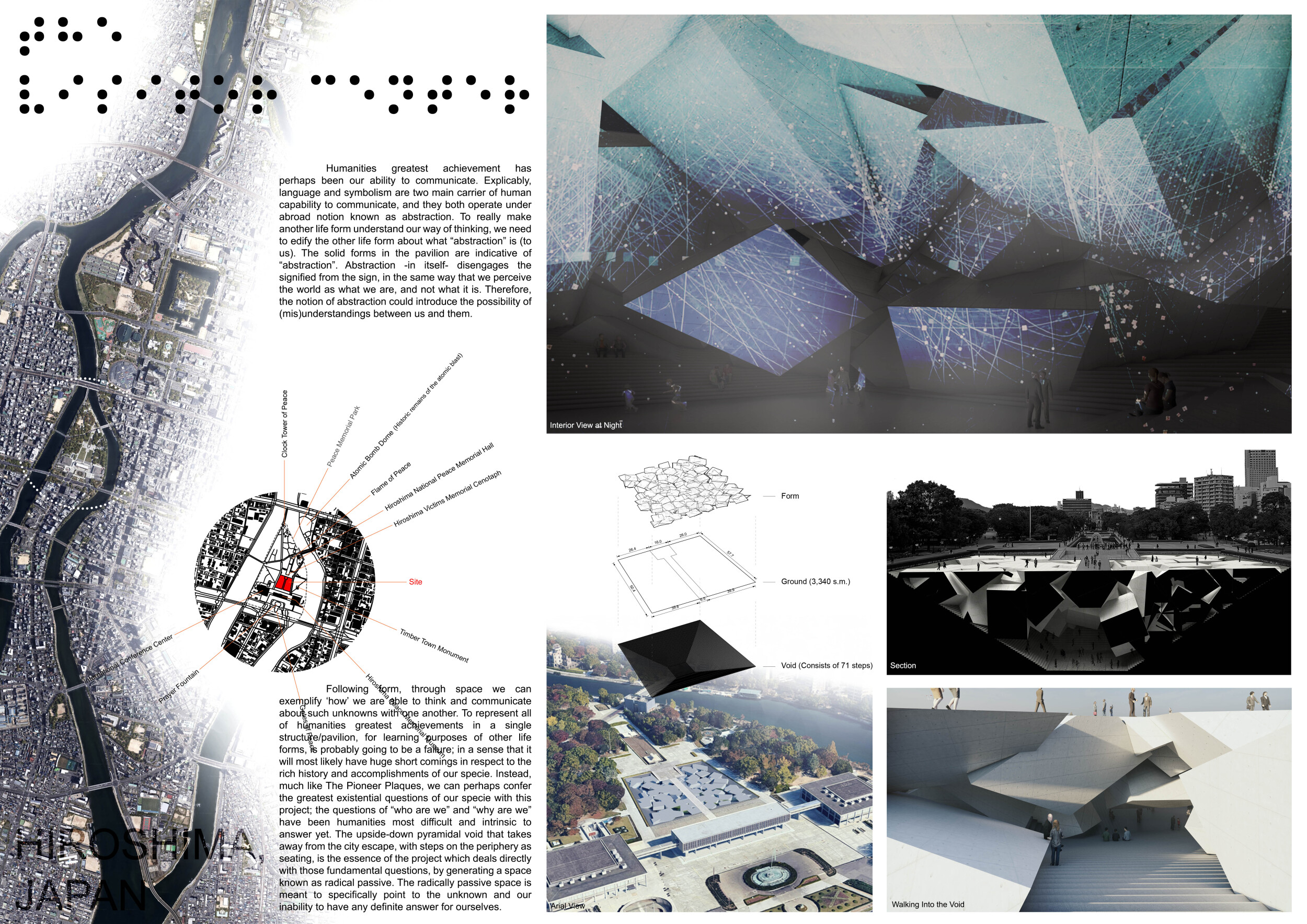 Located at the Hiroshima atomic epicenter, the project proposes an inverted pyramidal void, filled with a tangle of forms that result in a complex set of passages into and through the pavilion. According to the submission proposal, the form represents a “radically passive space meant to specifically point to the unknown and the [human’s] inability to have any definitive answers for ourselves.