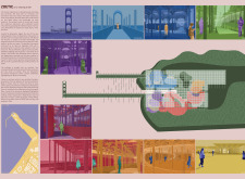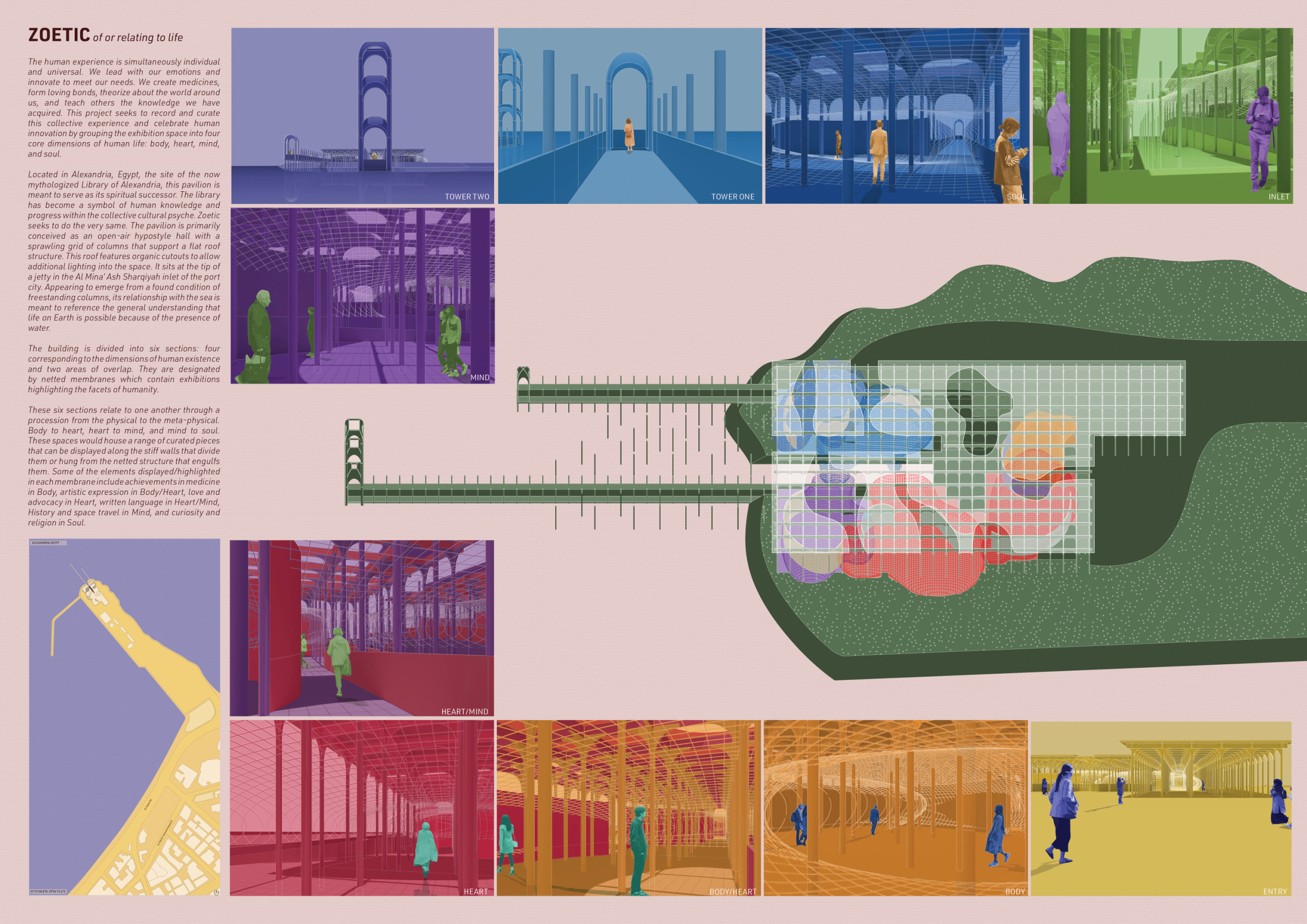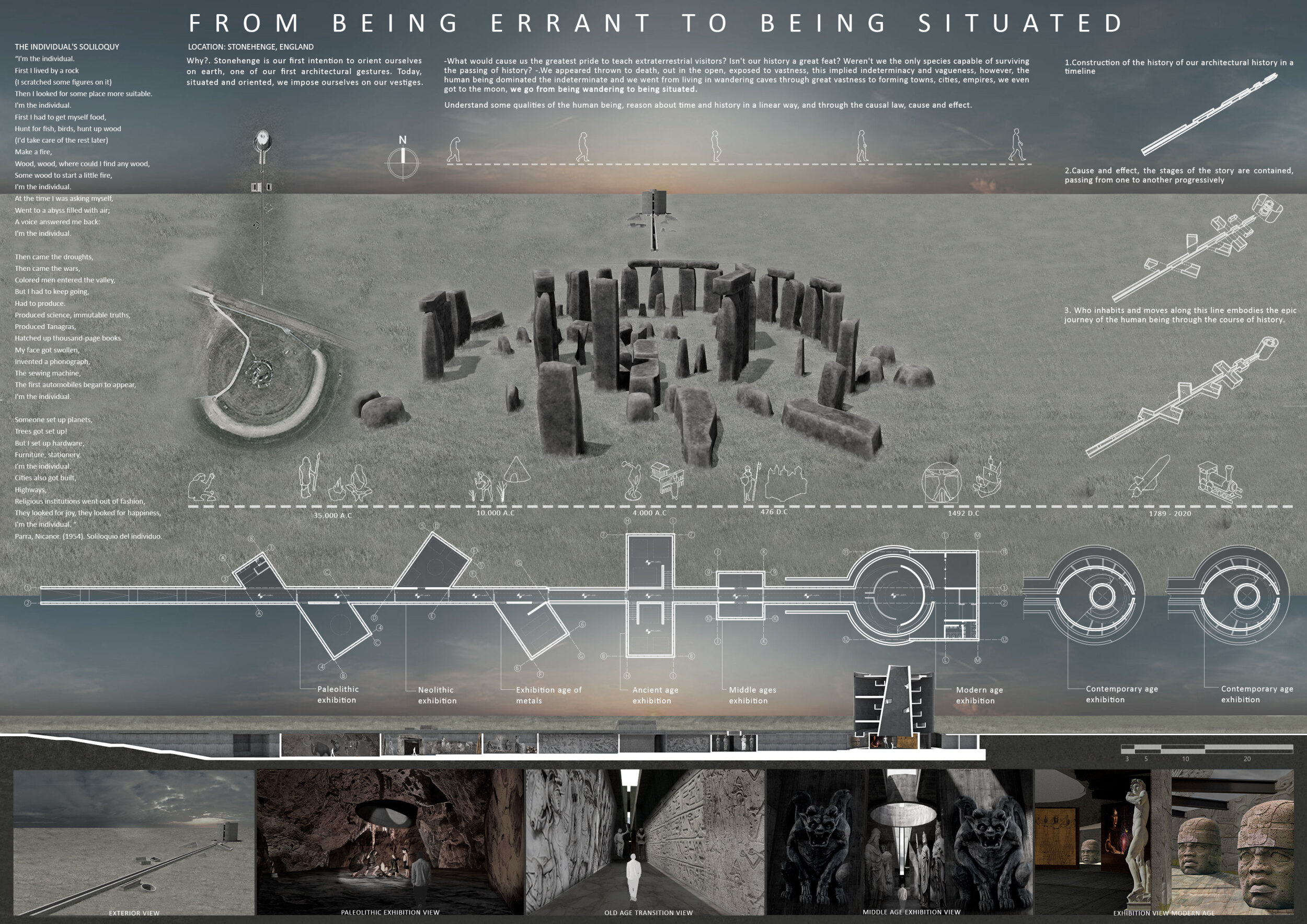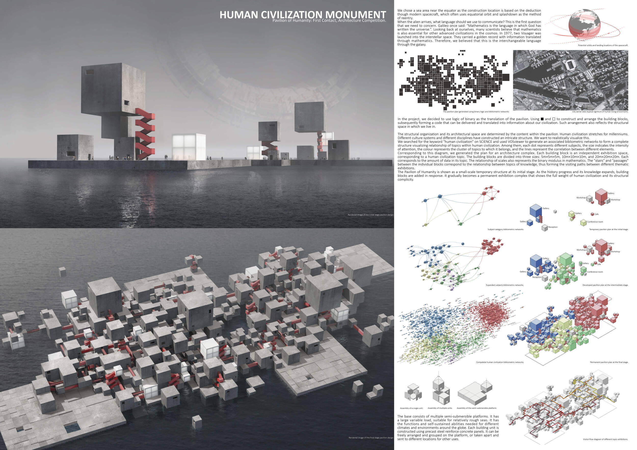 The project proposes a floating architectural complex, comprised of a pixel-like aggregation of building blocks, organized according to binary code, each of the blocks represent an independent exhibition space corresponding to a singular topic in the history of human civilization.