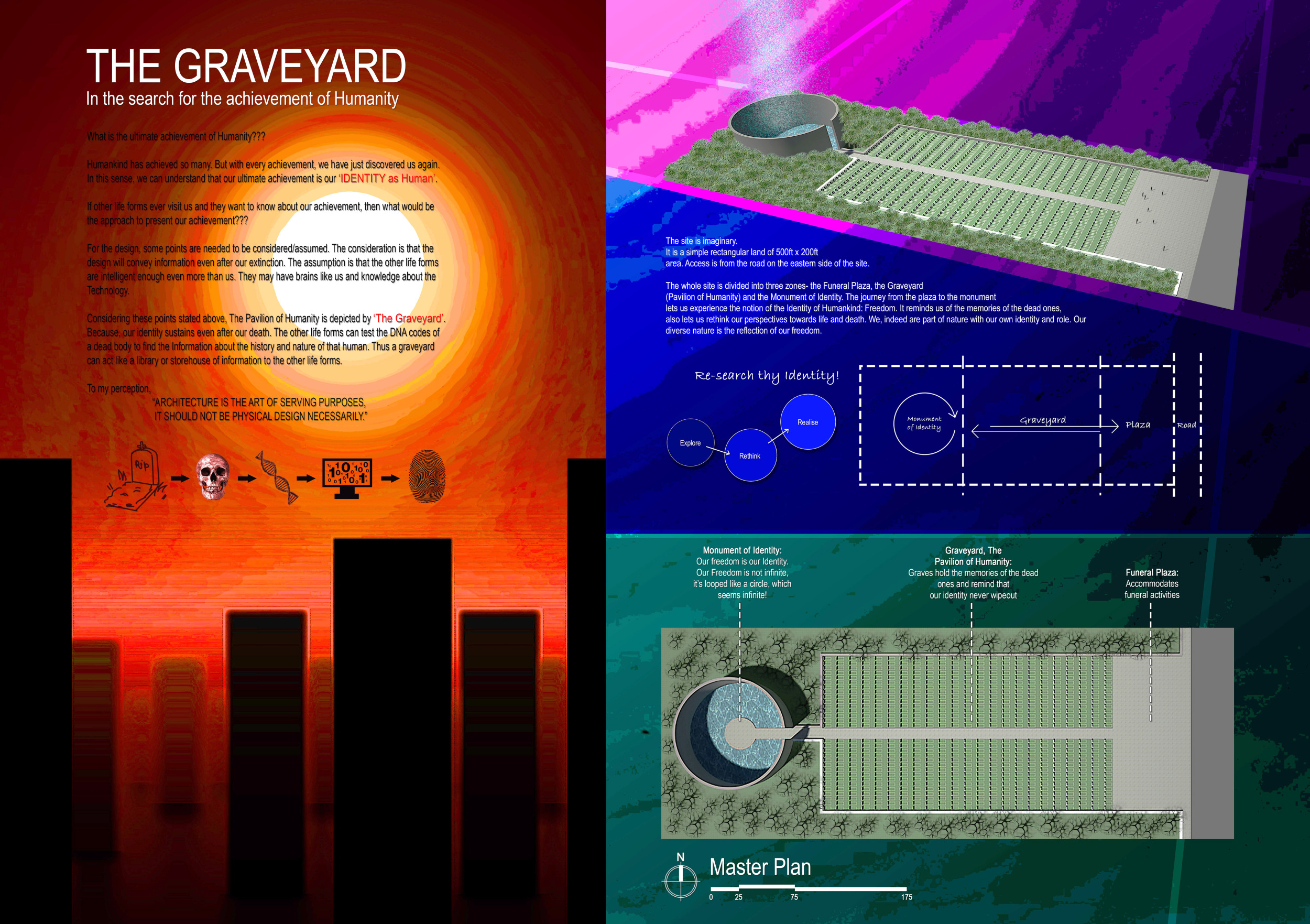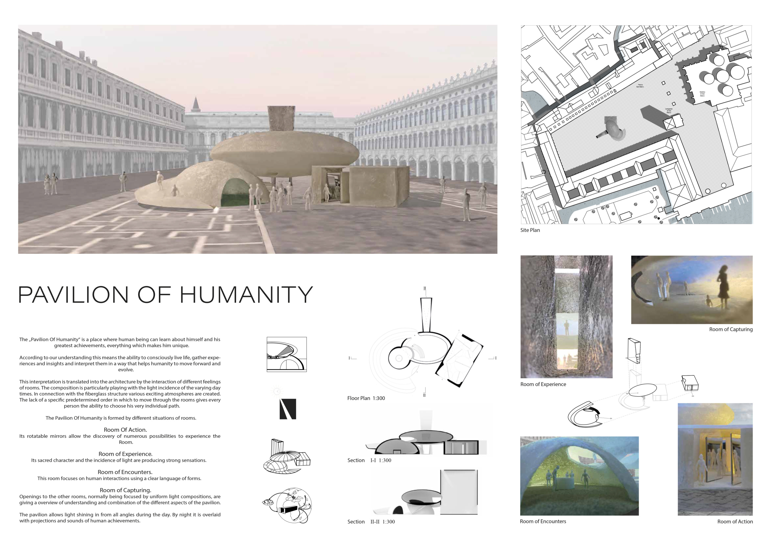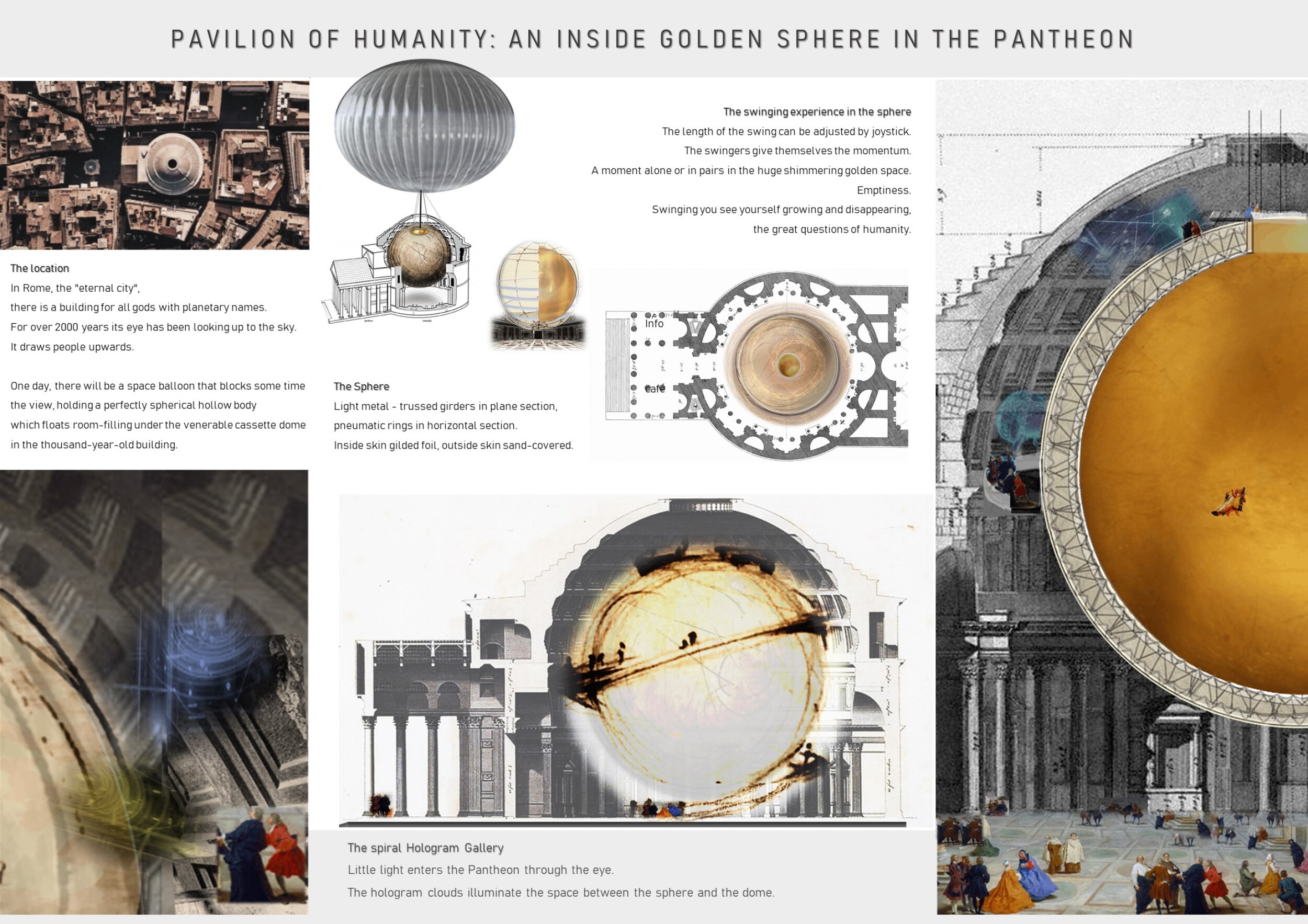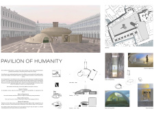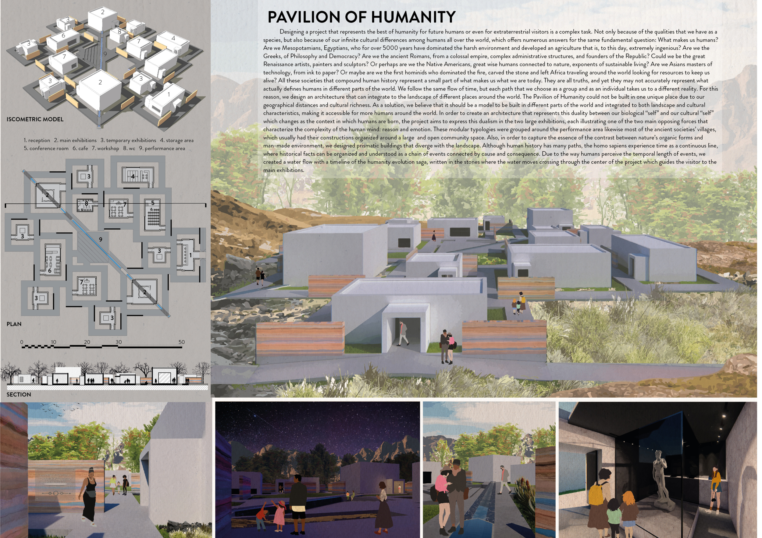 Much like the Pioneer Plaques, placed aboard the 1972 NASA Pioneer 10 and 1973 Pioneer 11 spacecraft, that were intended to communicate a pictorial history of humanity, the Pavilion of Humanity is meant to represent the human race through architecture.