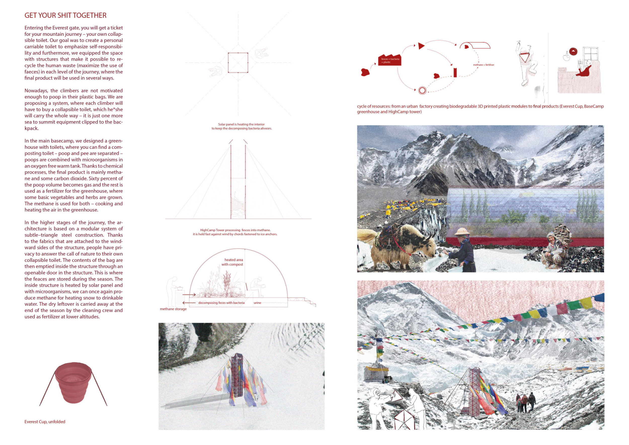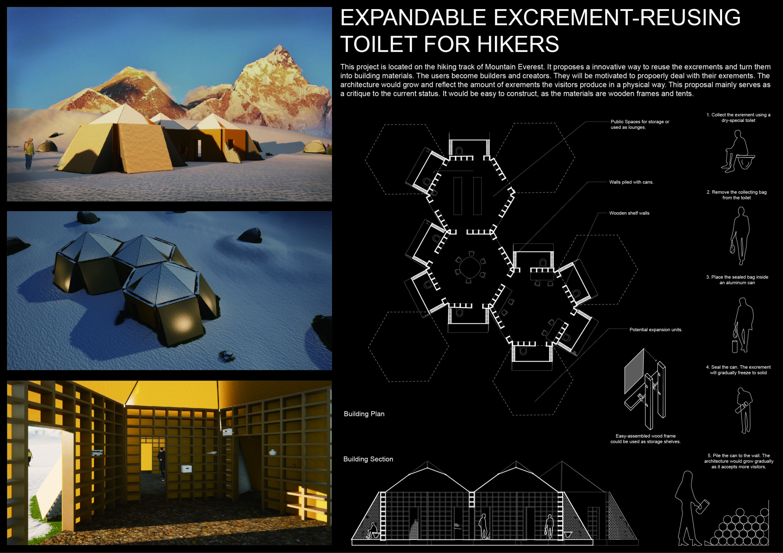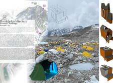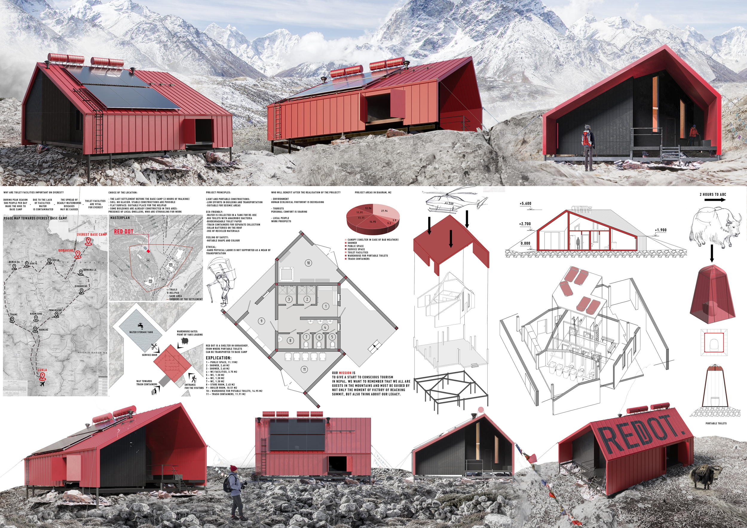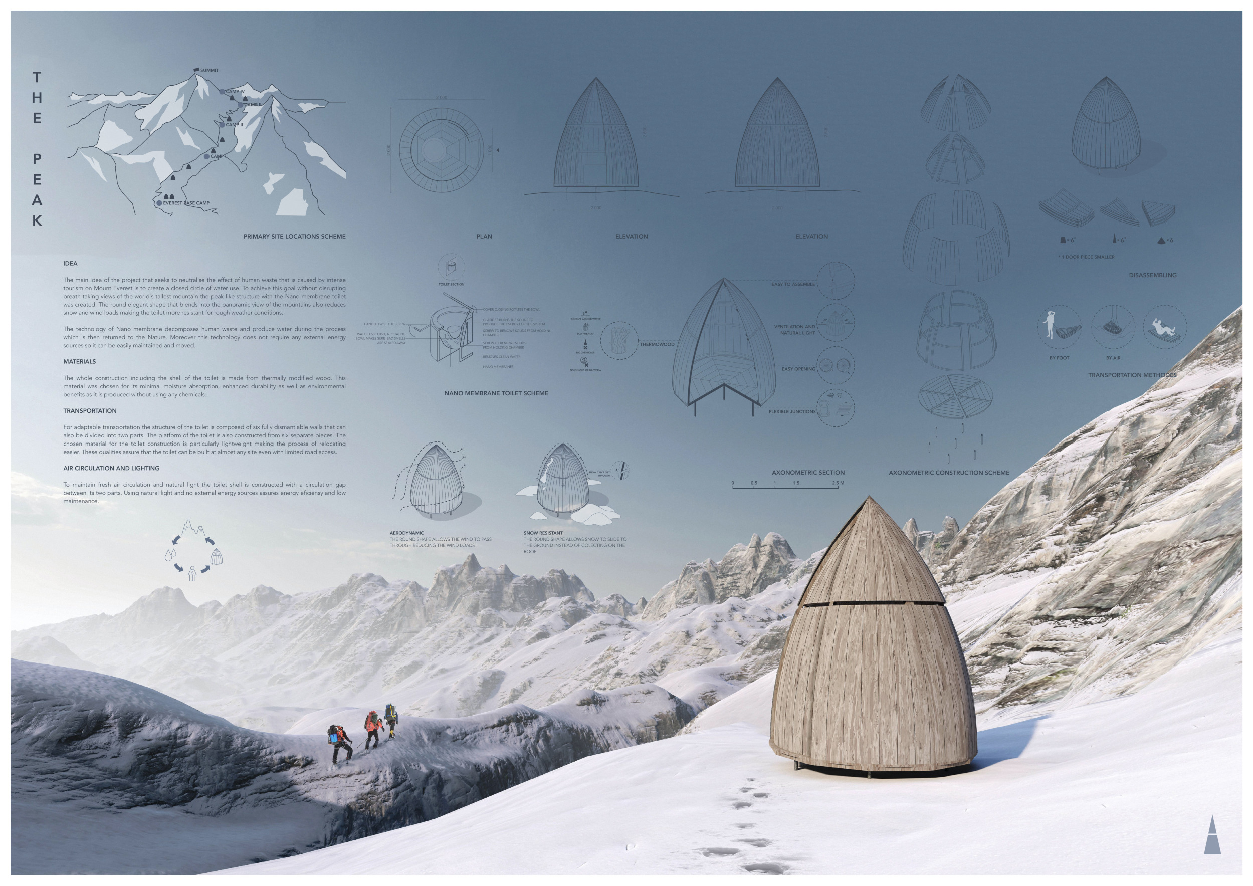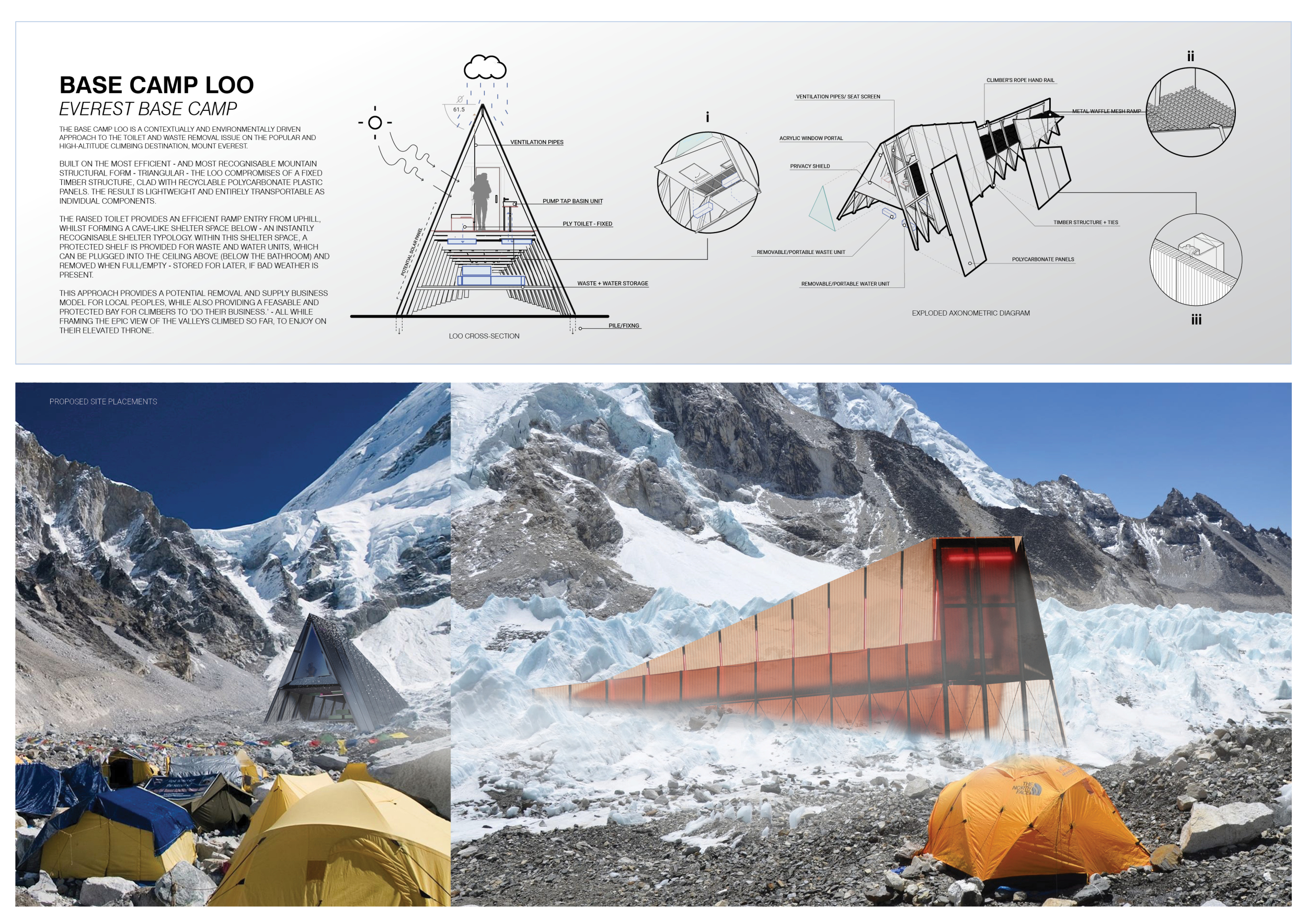 The Humble Architecture competition series seeks designs for toilet facilities that could improve the lives of their users and consider the highest environmental standards for their sites. This first event tasked participants with designing sustainable toilet facilities on Mount Everest - a remote location with a harsh climate that sees many visitors, but is programmed with limited waste facilities.