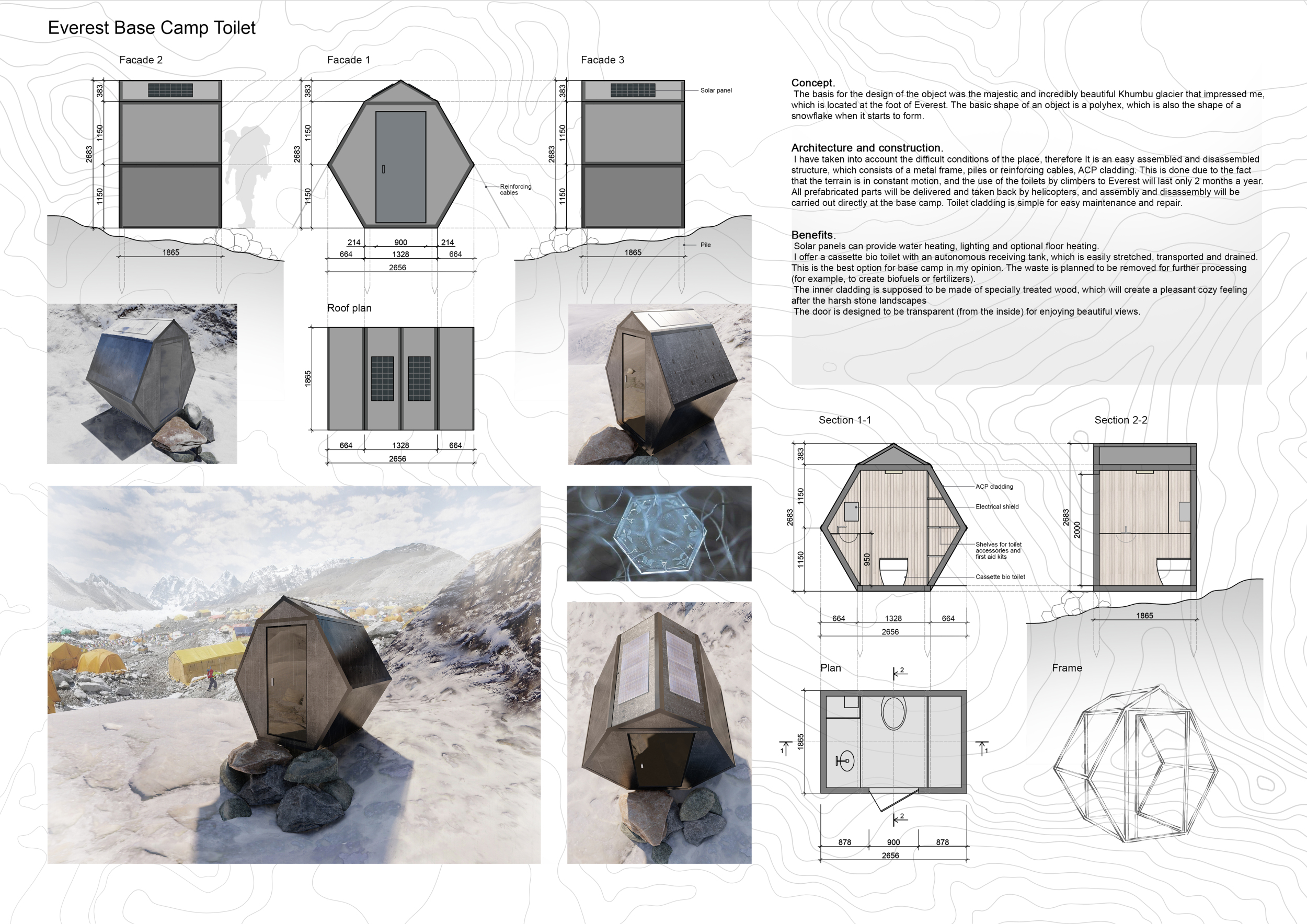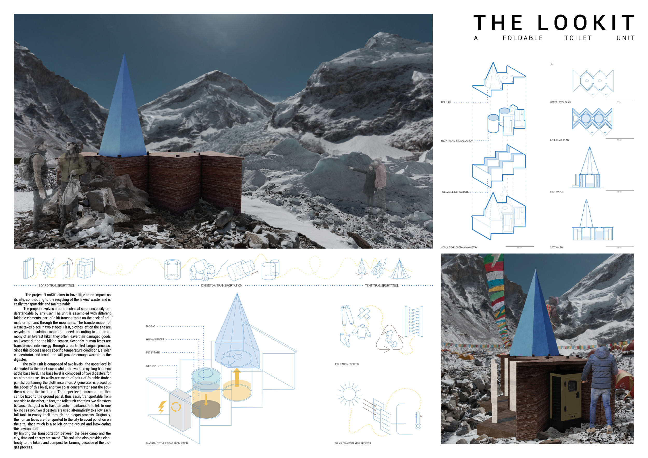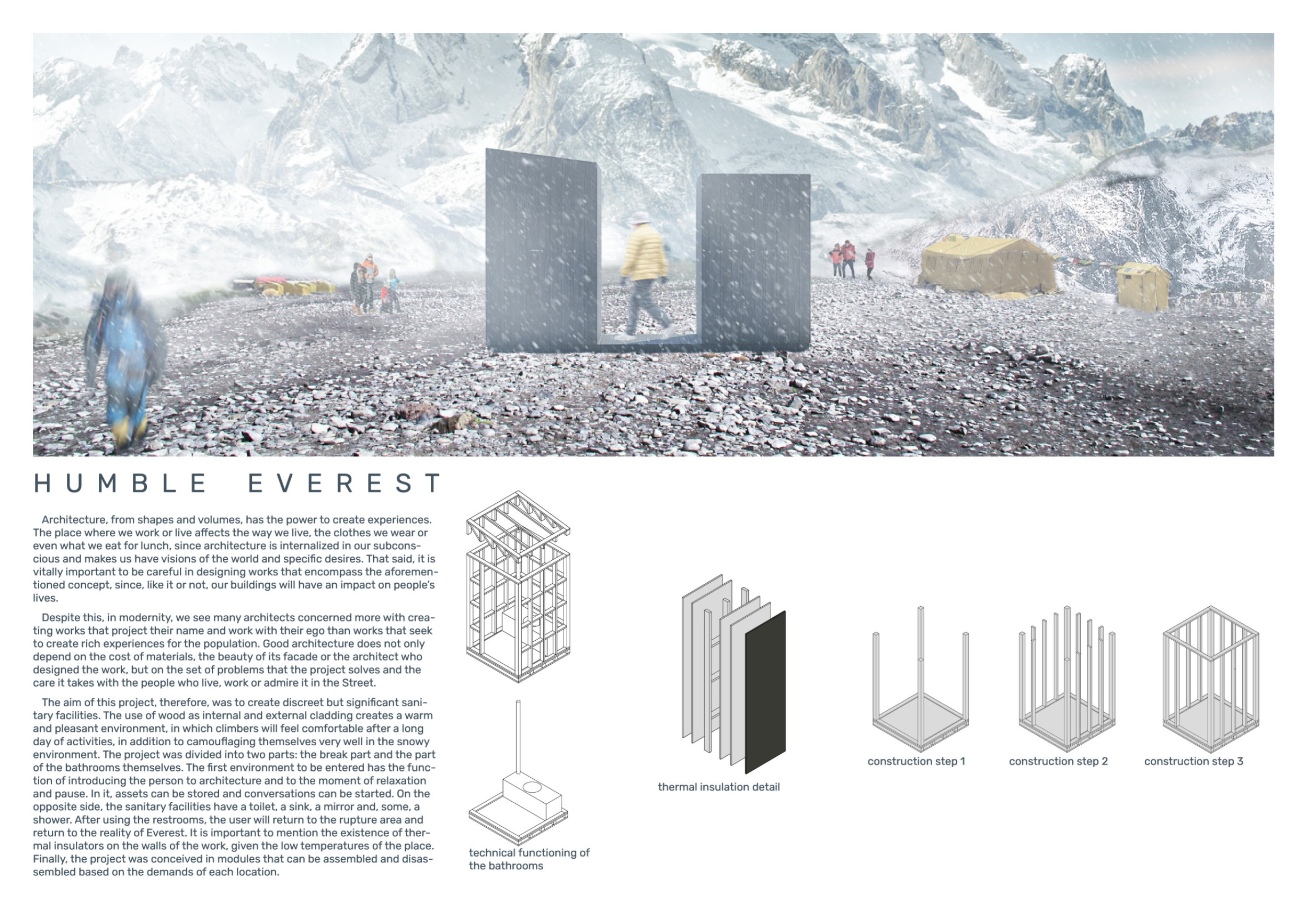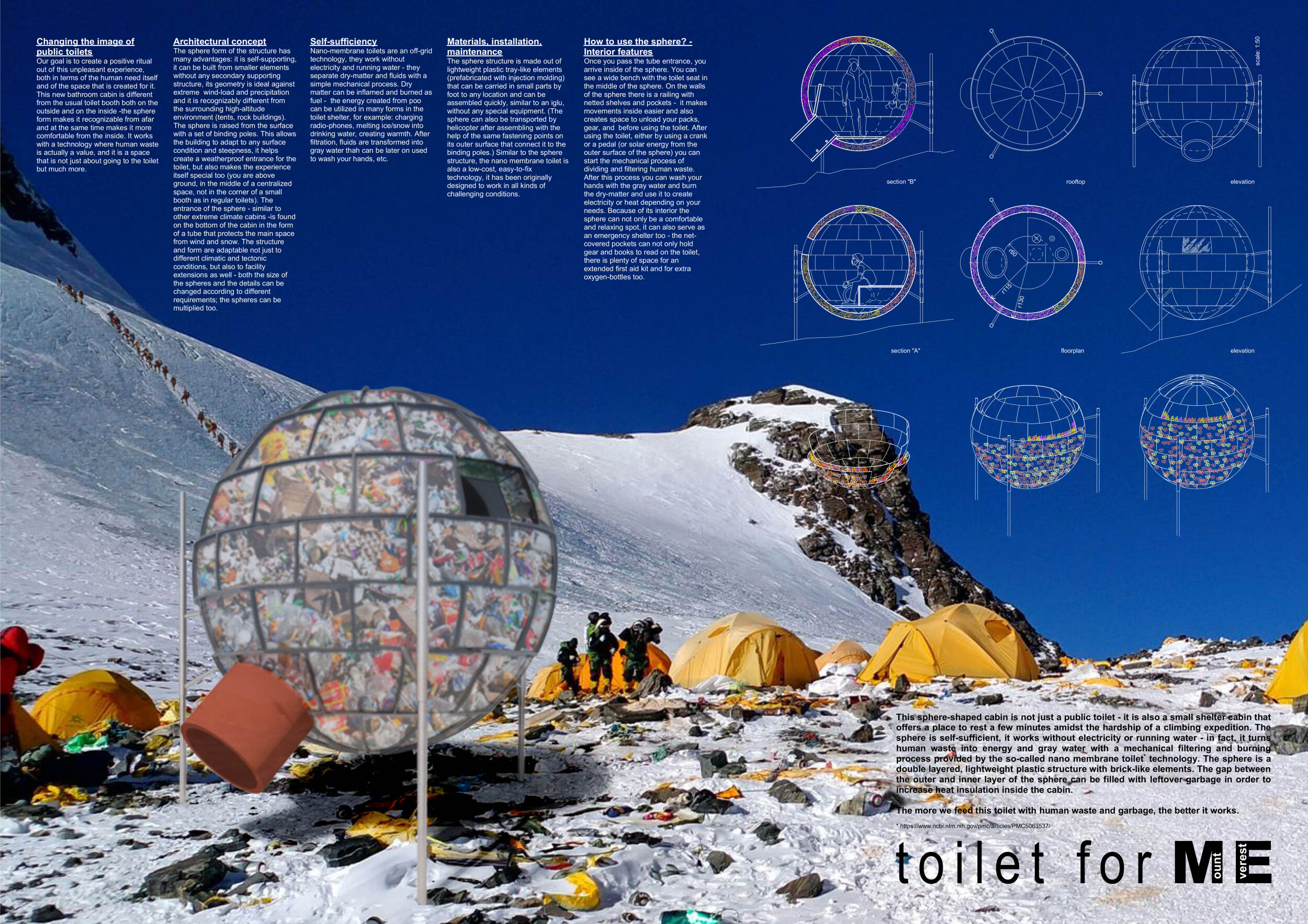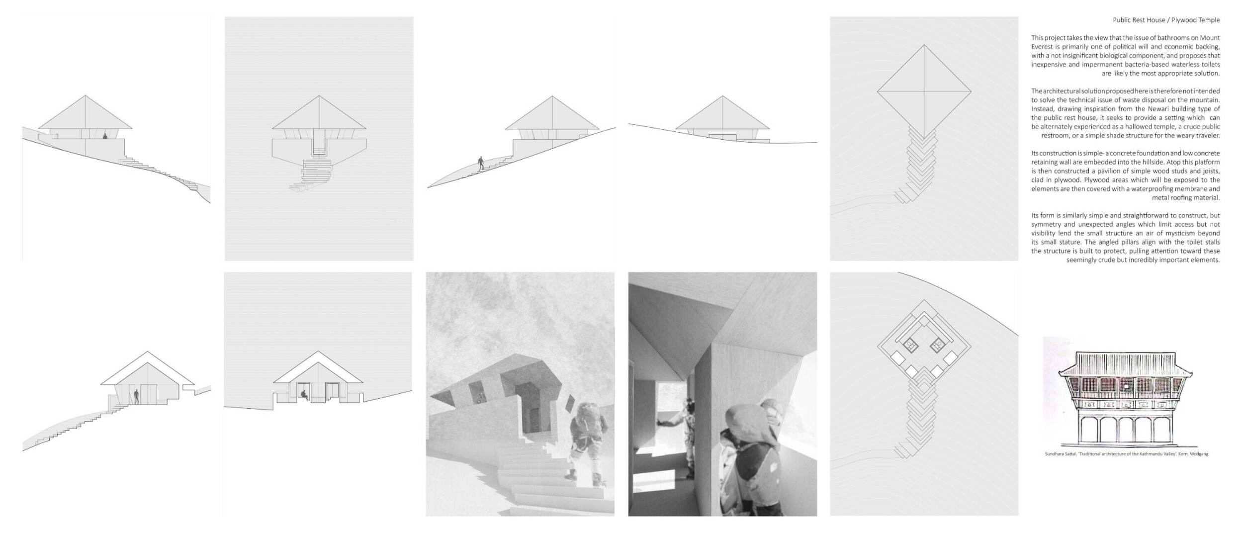 The Humble Architecture competition series seeks designs for toilet facilities that could improve the lives of their users and consider the highest environmental standards for their sites. This first event tasked participants with designing sustainable toilet facilities on Mount Everest - a remote location with a harsh climate that sees many visitors, but is programmed with limited waste facilities.