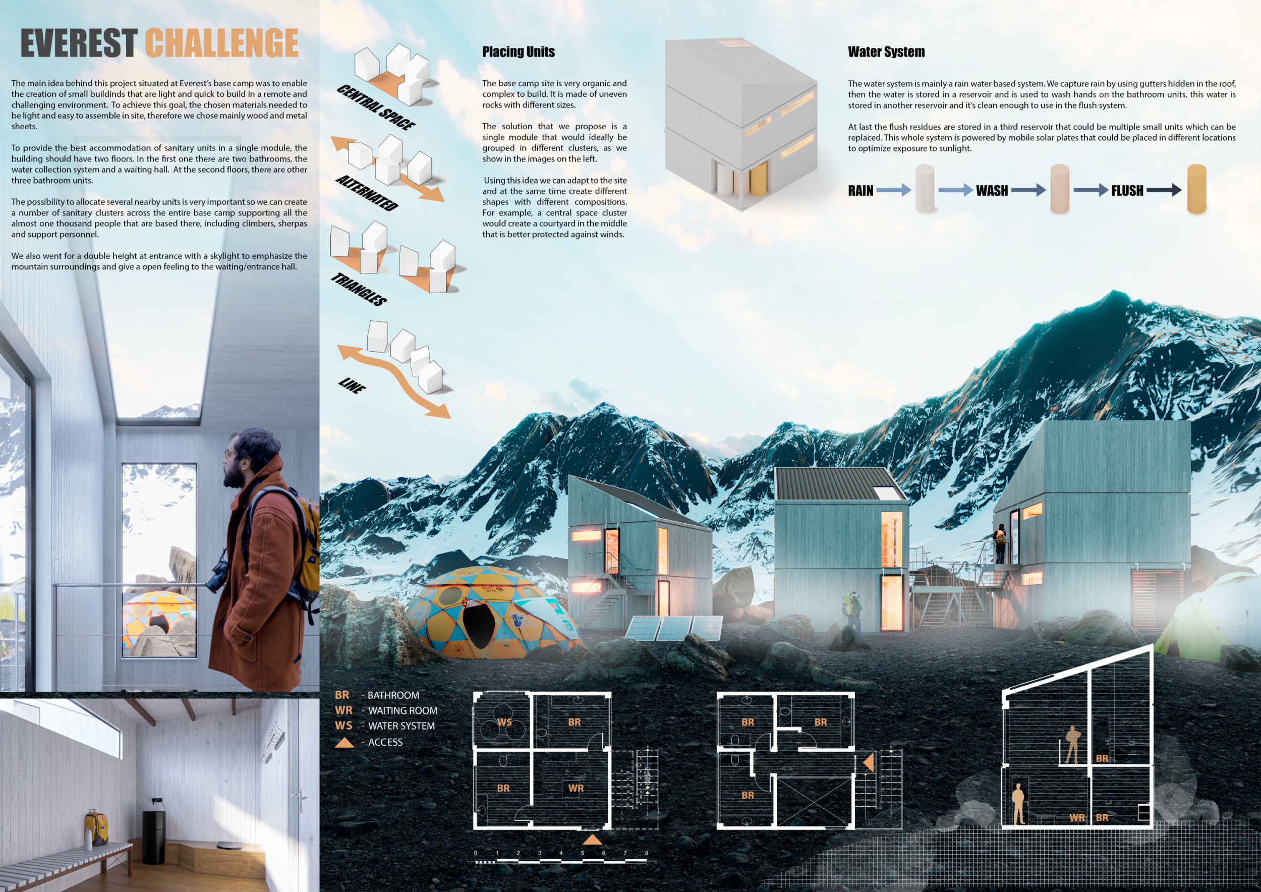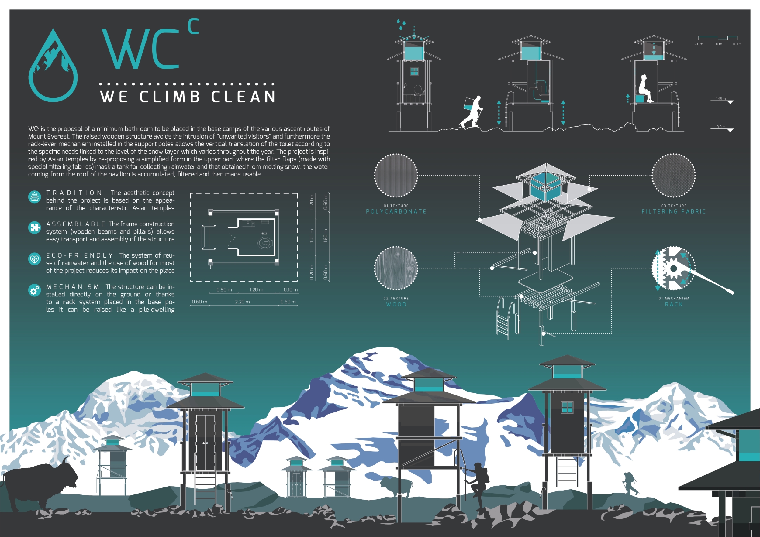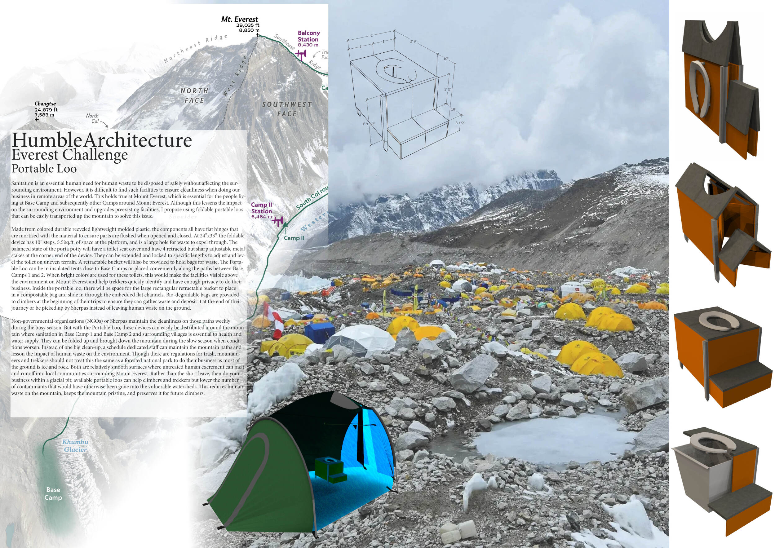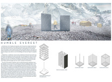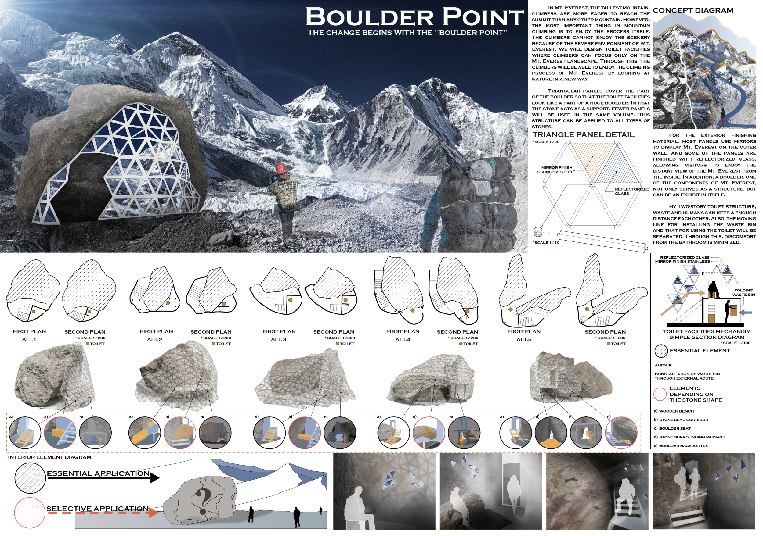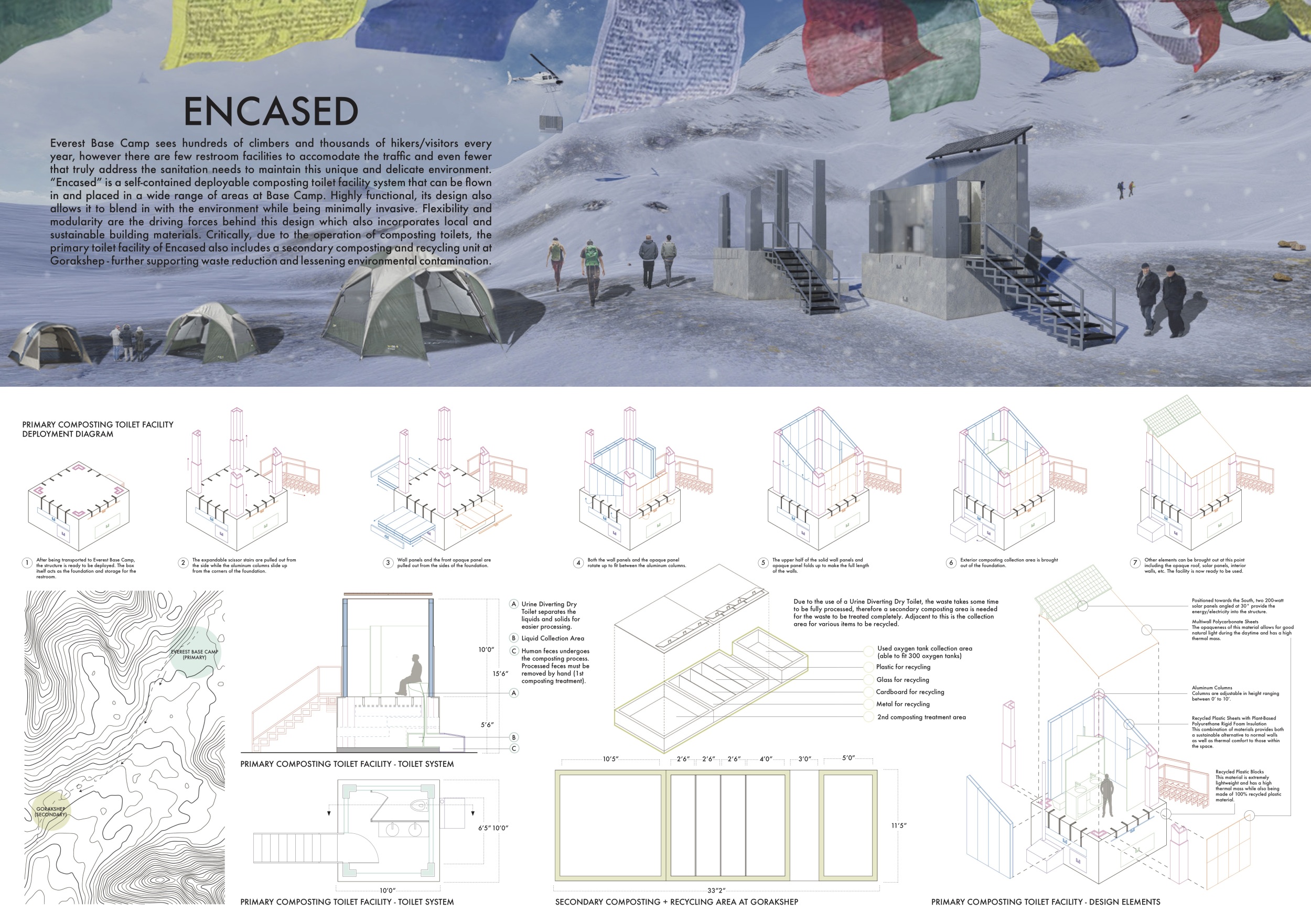 The Humble Architecture competition series seeks designs for toilet facilities that could improve the lives of their users and consider the highest environmental standards for their sites. This first event tasked participants with designing sustainable toilet facilities on Mount Everest - a remote location with a harsh climate that sees many visitors, but is programmed with limited waste facilities.