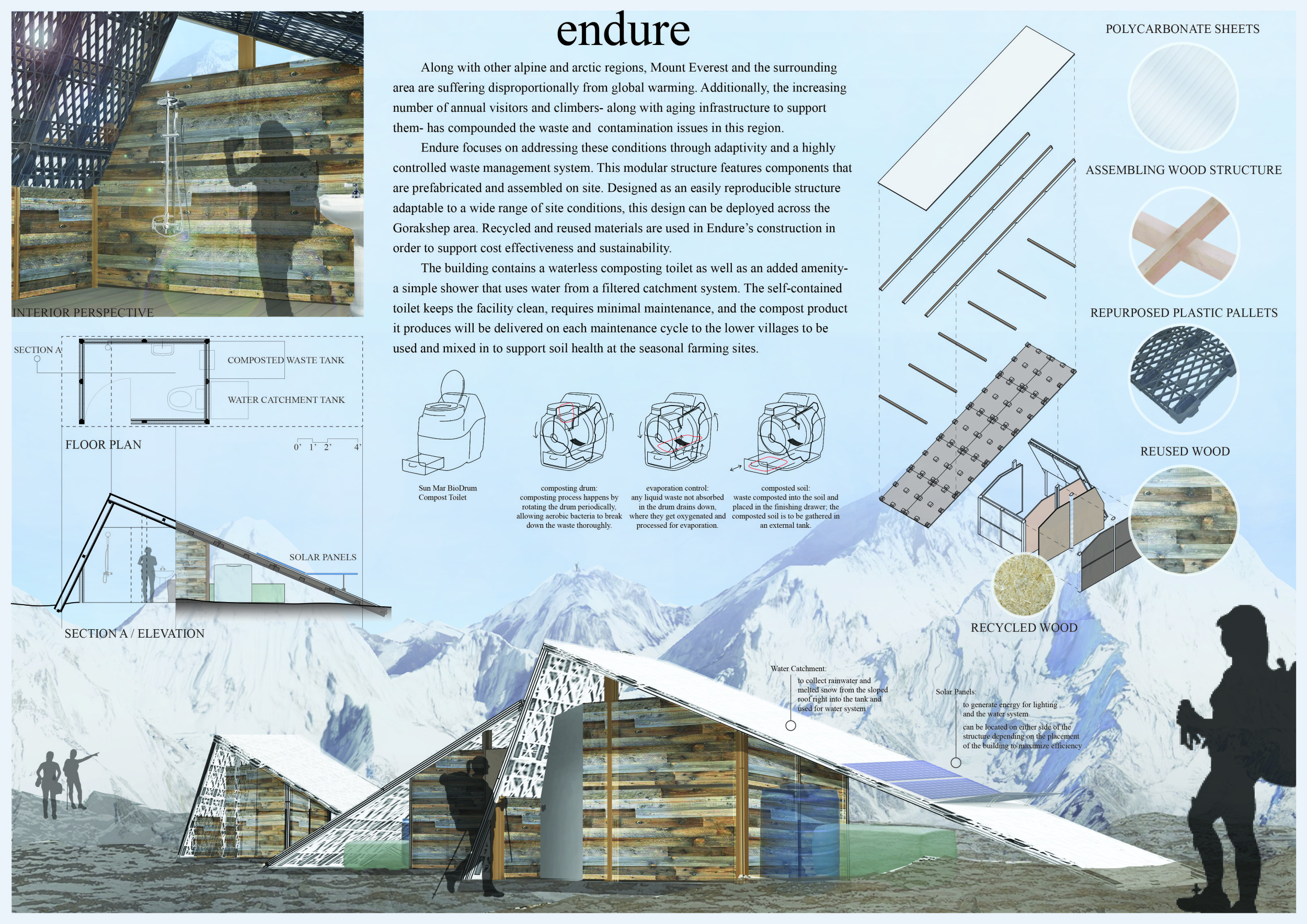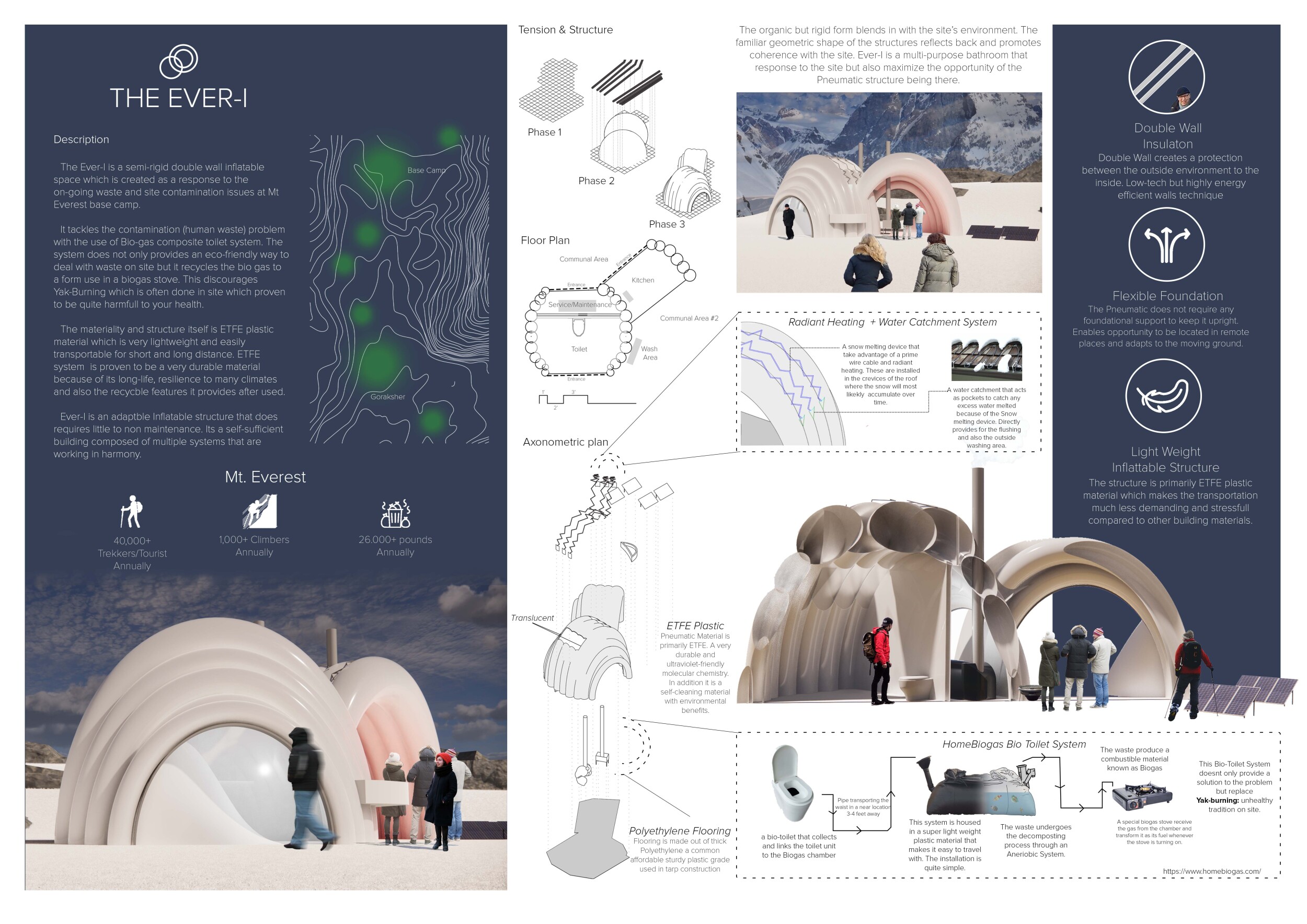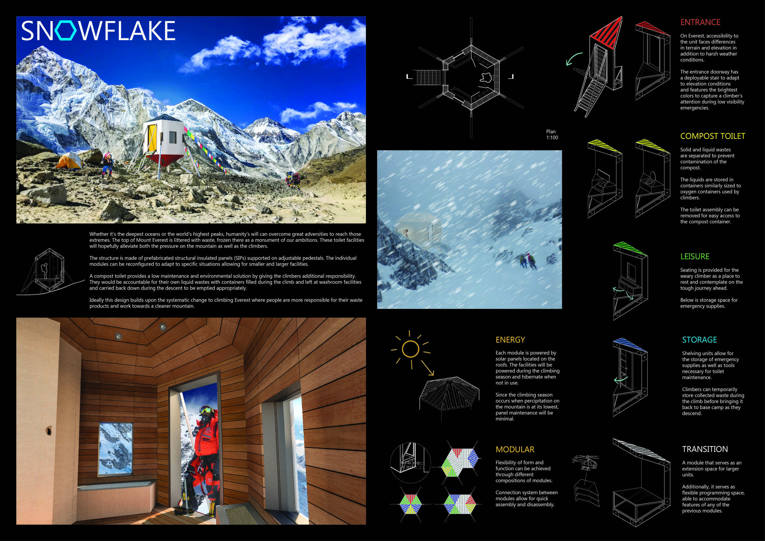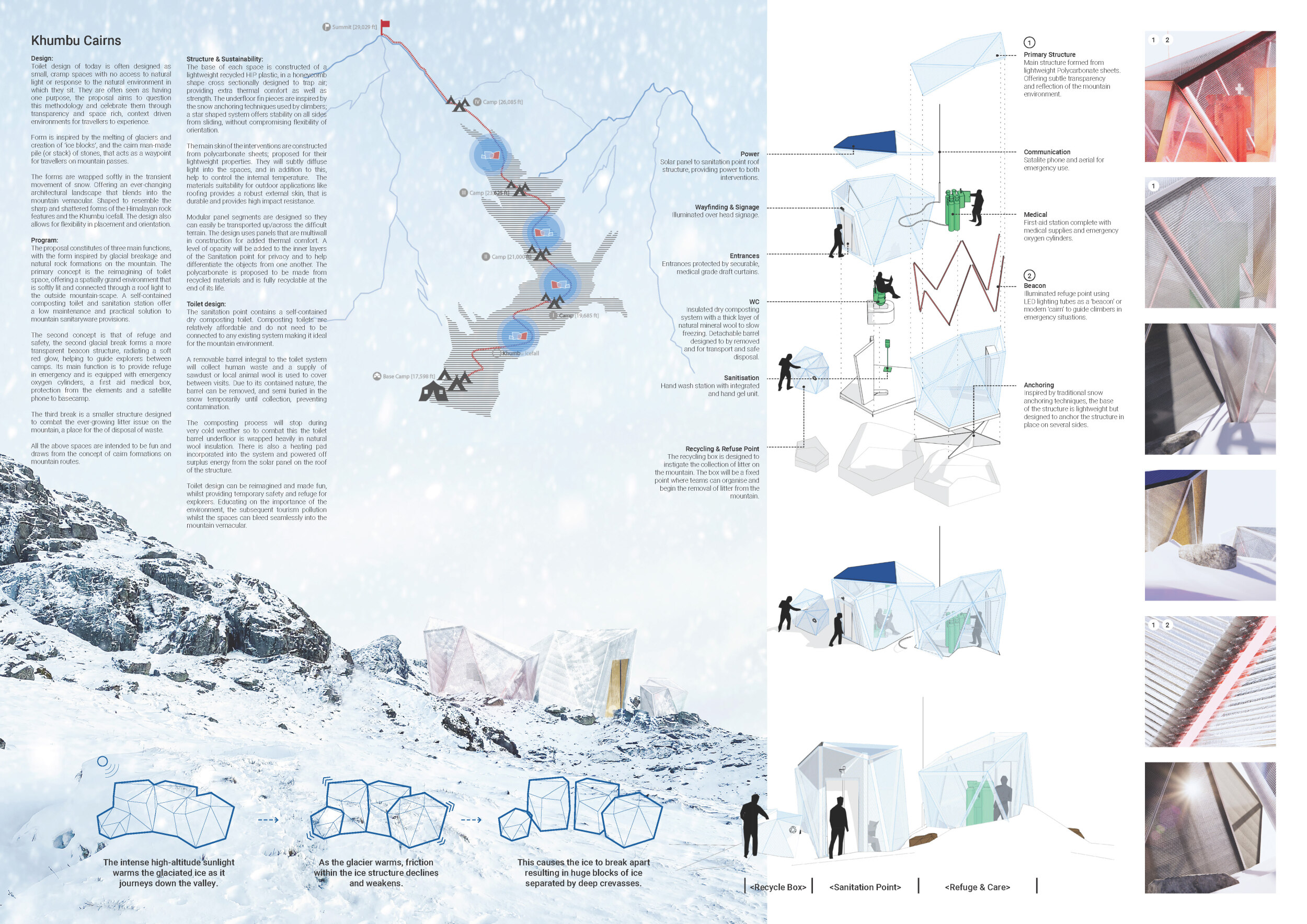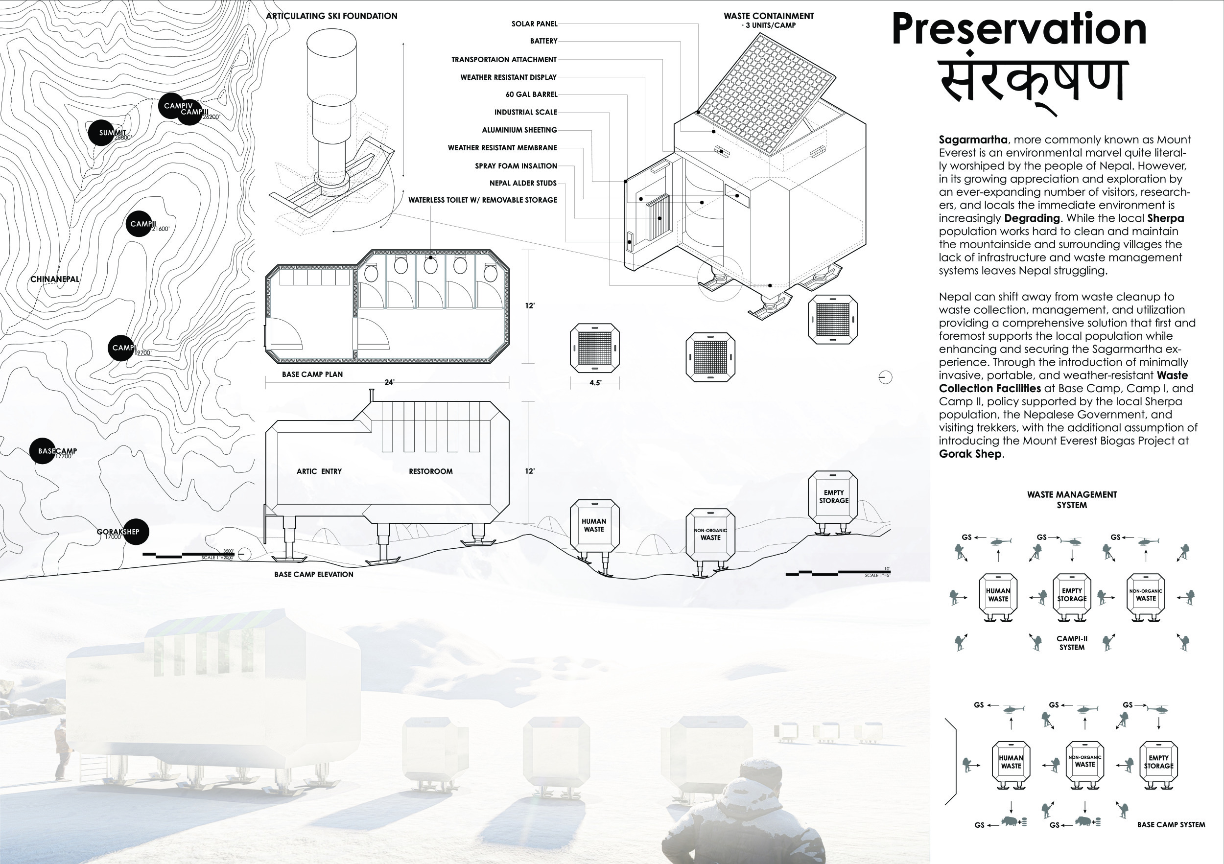 The Humble Architecture competition series seeks designs for toilet facilities that could improve the lives of their users and consider the highest environmental standards for their sites. This first event tasked participants with designing sustainable toilet facilities on Mount Everest - a remote location with a harsh climate that sees many visitors, but is programmed with limited waste facilities.