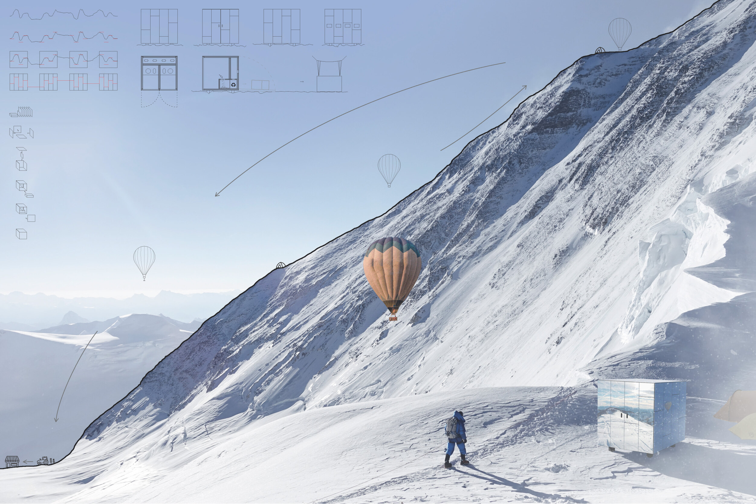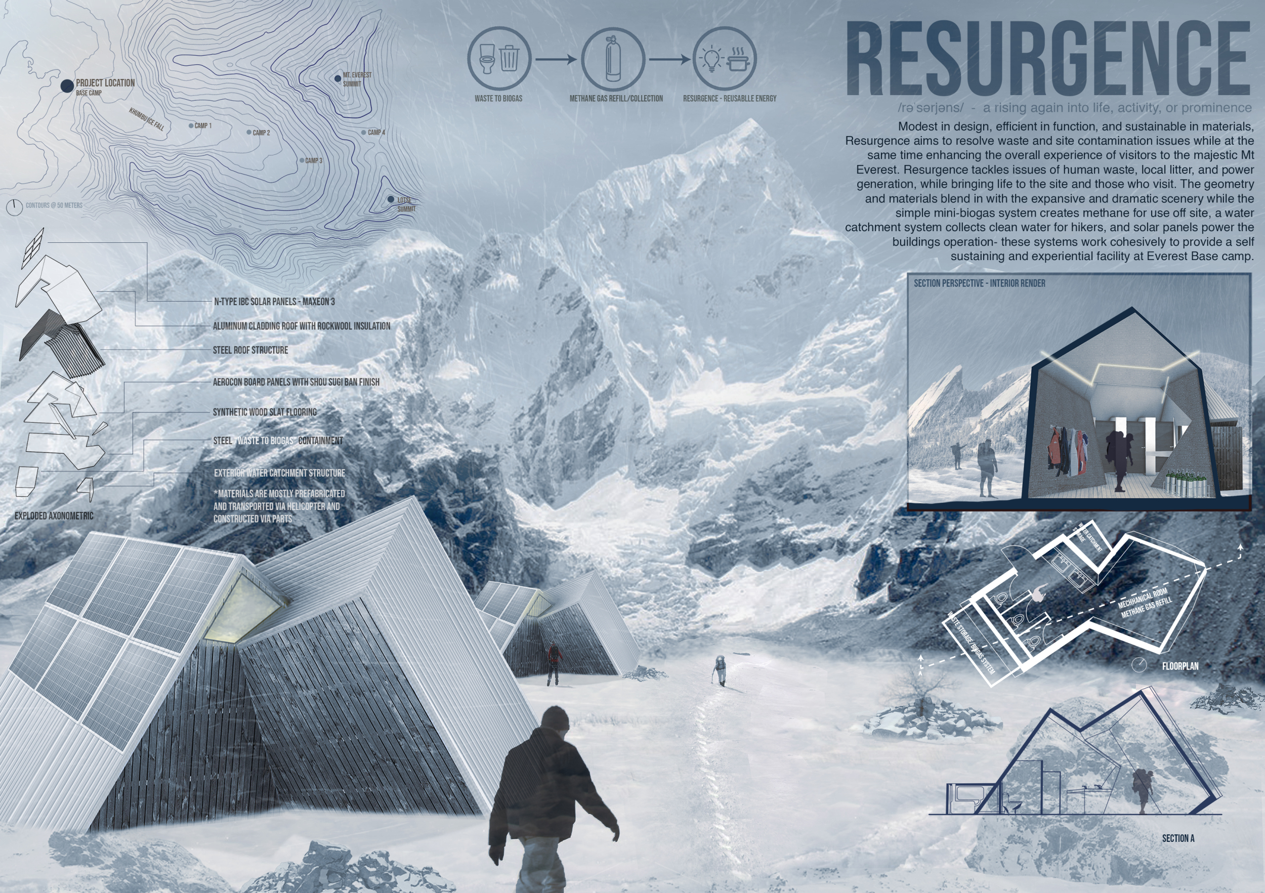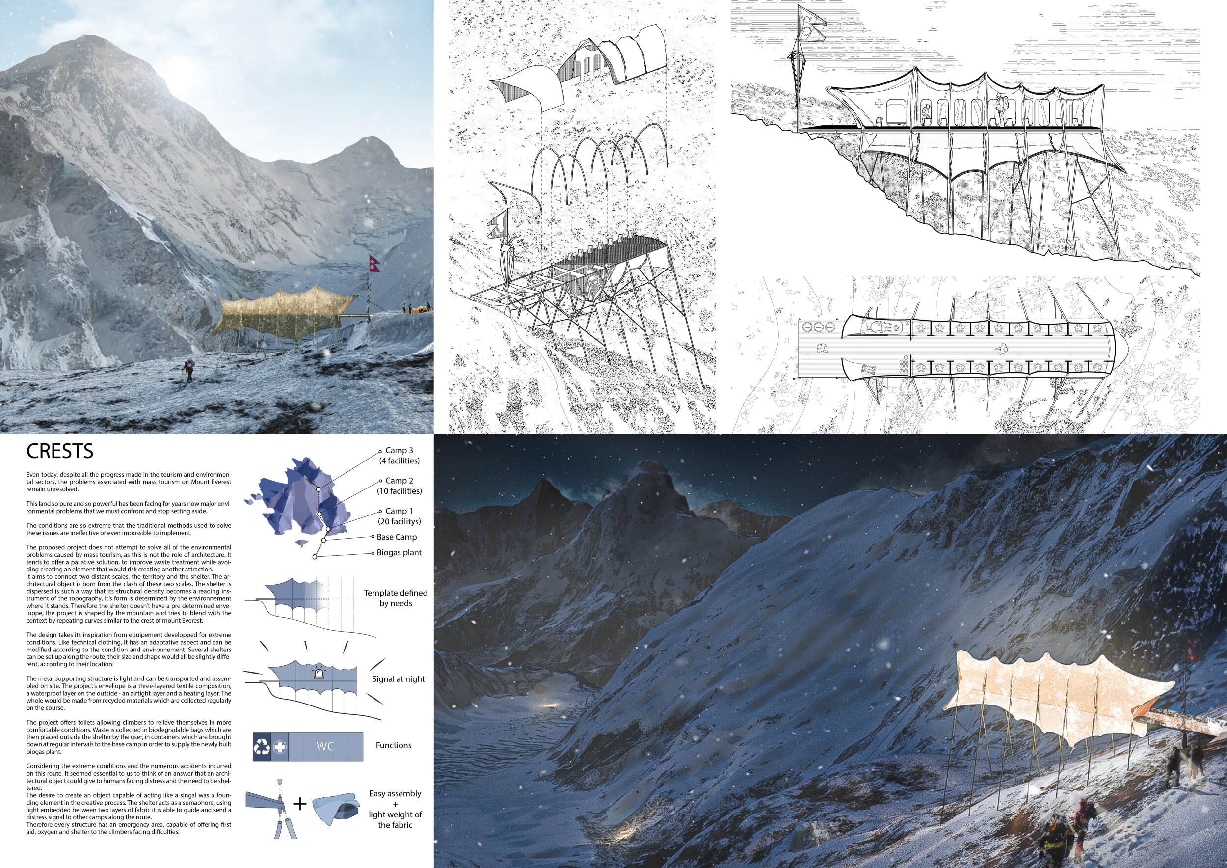 The proposal Crest takes inspiration from tents and other shelters made for extreme conditions, with a metal base structure wrapped in lightweight fabric * in this case, dramatically cantilevered off the edge of the mountainous site’s steep topography. Waste is collected in biodegradable bags placed in bins removed from the mountain at intervals, where they are fed into a biogas plant also proposed as part of the solution.