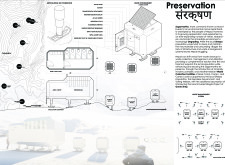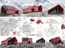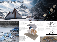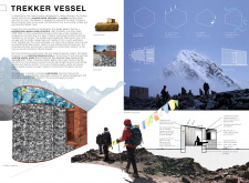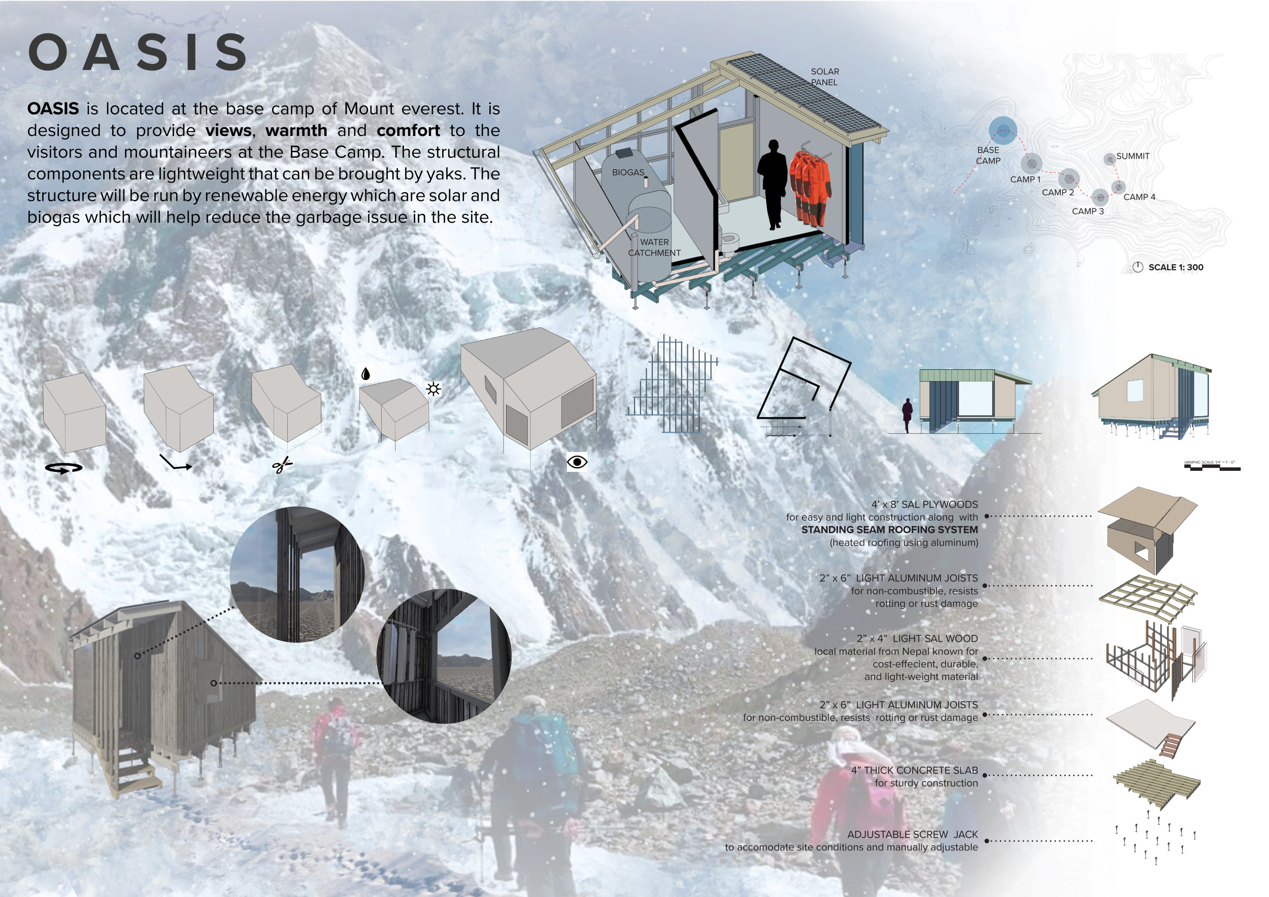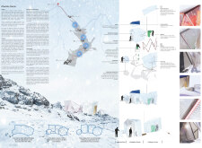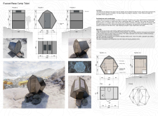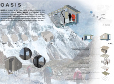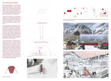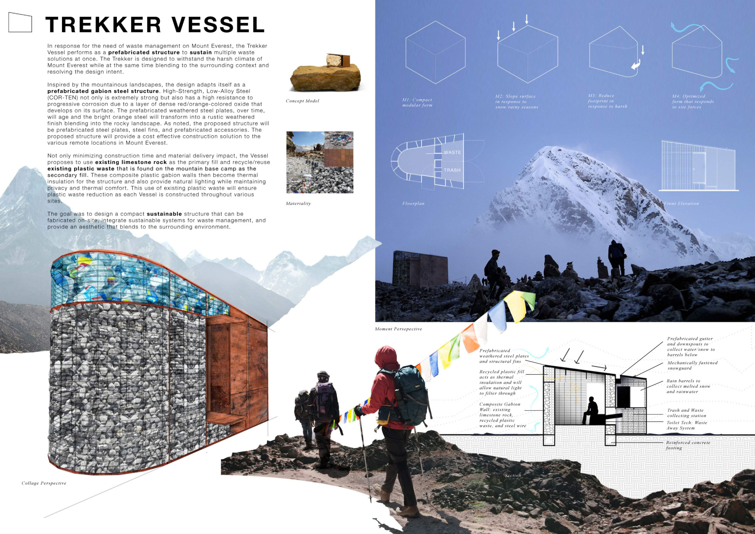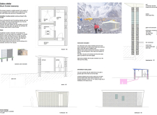 The proposal Crest takes inspiration from tents and other shelters made for extreme conditions, with a metal base structure wrapped in lightweight fabric * in this case, dramatically cantilevered off the edge of the mountainous site’s steep topography. Waste is collected in biodegradable bags placed in bins removed from the mountain at intervals, where they are fed into a biogas plant also proposed as part of the solution.
