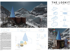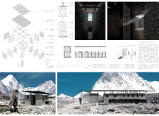 Cairns proposes a modular system made from aircrete - a lightweight and sustainable form of concrete. These molded building blocks can be carried by mountaineers to the desired location, reducing the need for any major means of transport for installation or construction. Once built, inside it includes a mesh seat and simple bag for waste disposal.