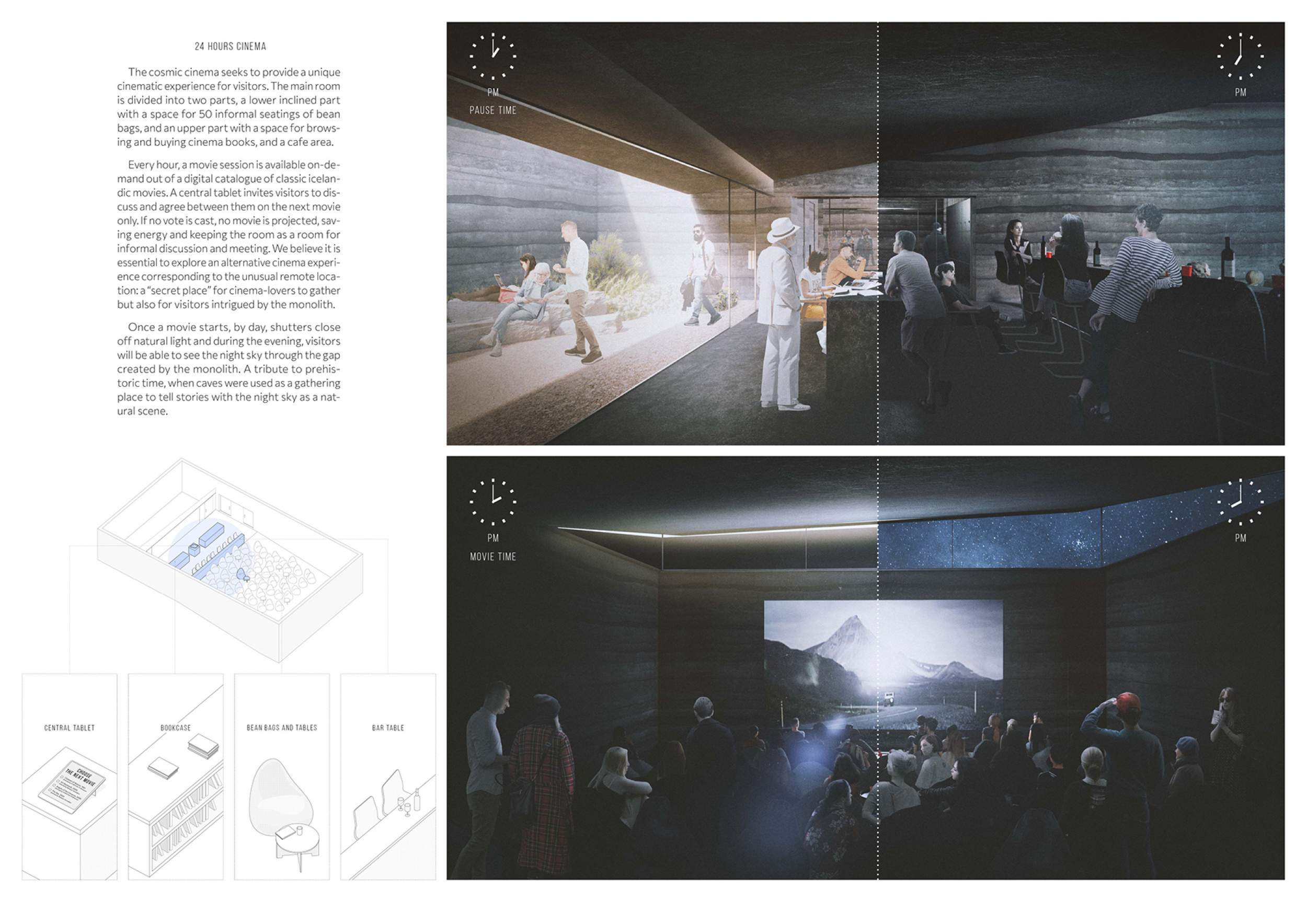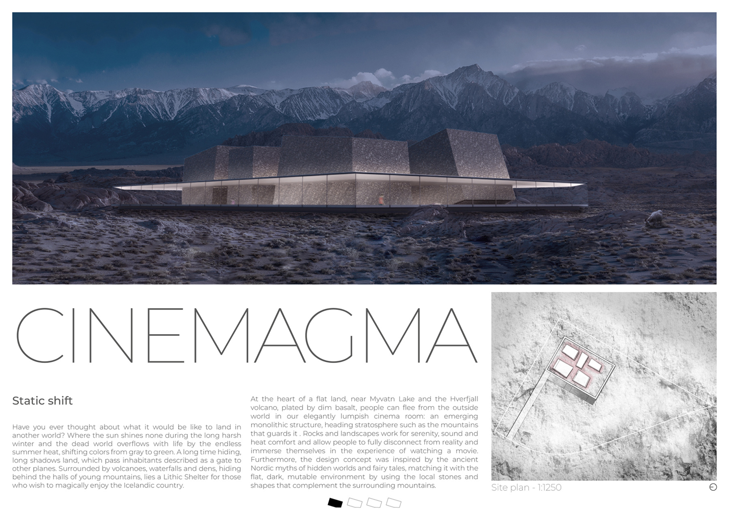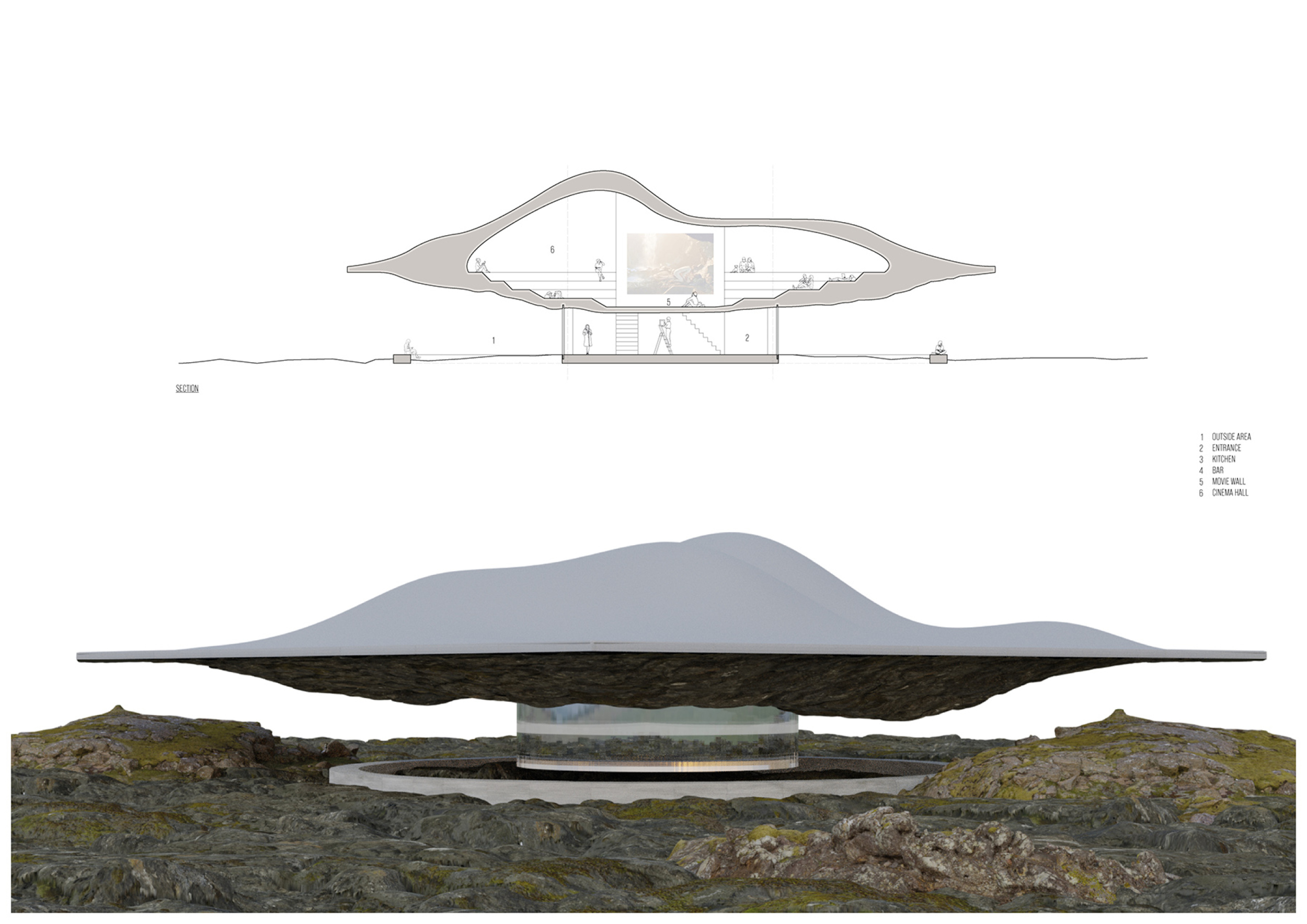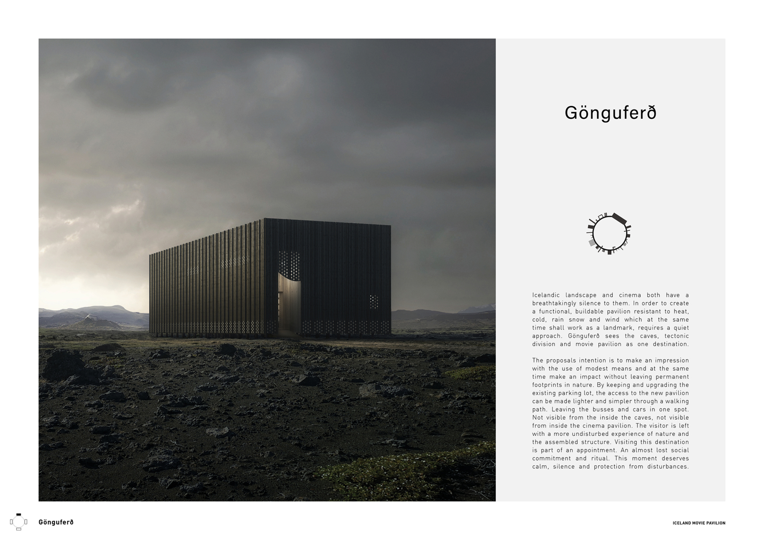The Iceland Movie Pavilion competition sought designs for a movie pavilion in the Grjótagjá cave region located near Lake Mývatn in northern Iceland. It was asked that proposals reflect the essence of Icelandic cinema, its distinctive character and unique history, with the central focus being a small movie theater capable of hosting up to 50 visitors. The pavilion is envisioned to be a place to introduce visitors to Icelandic cinema, as well as one to offer fans a place to gather and share a passion for film.