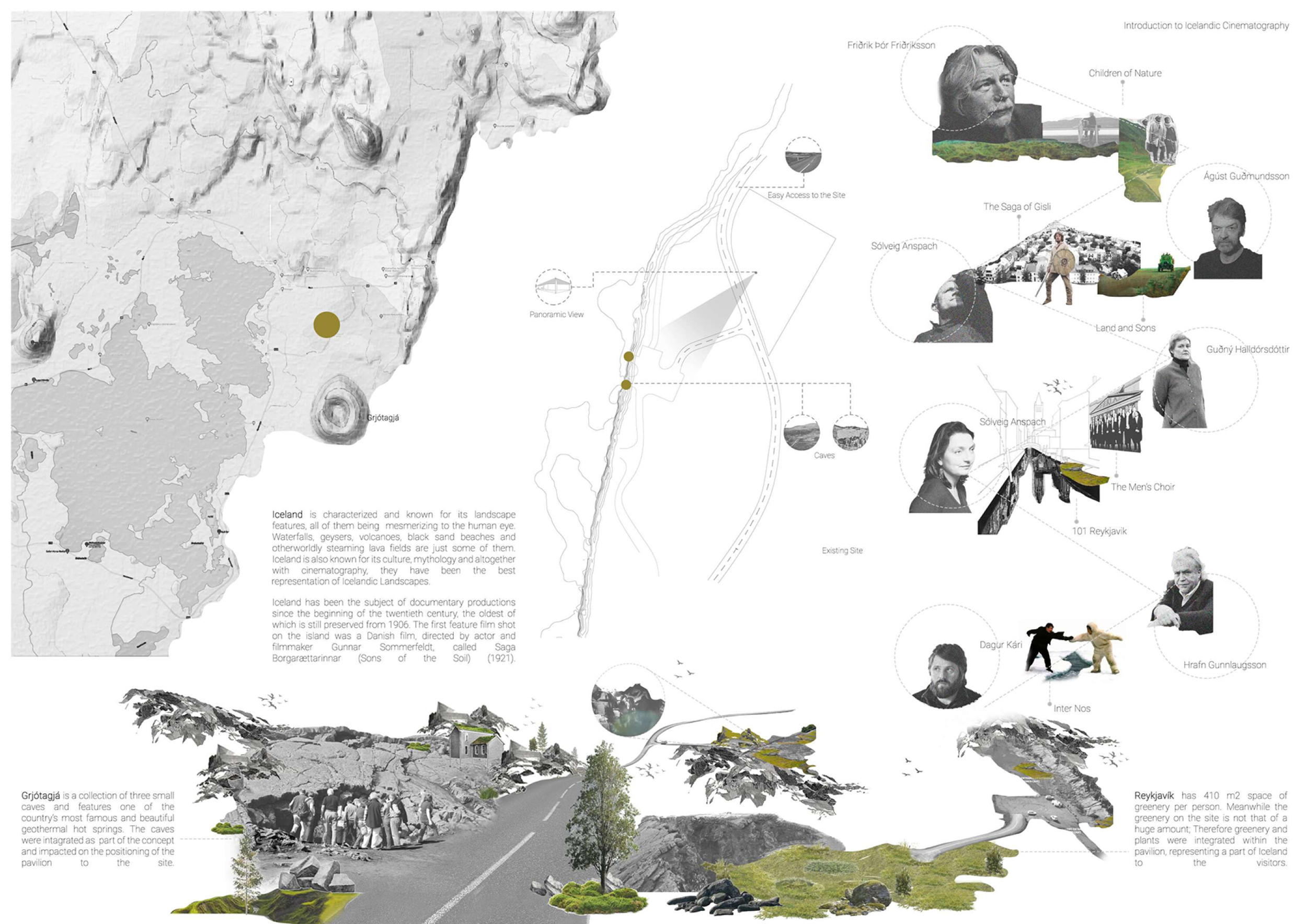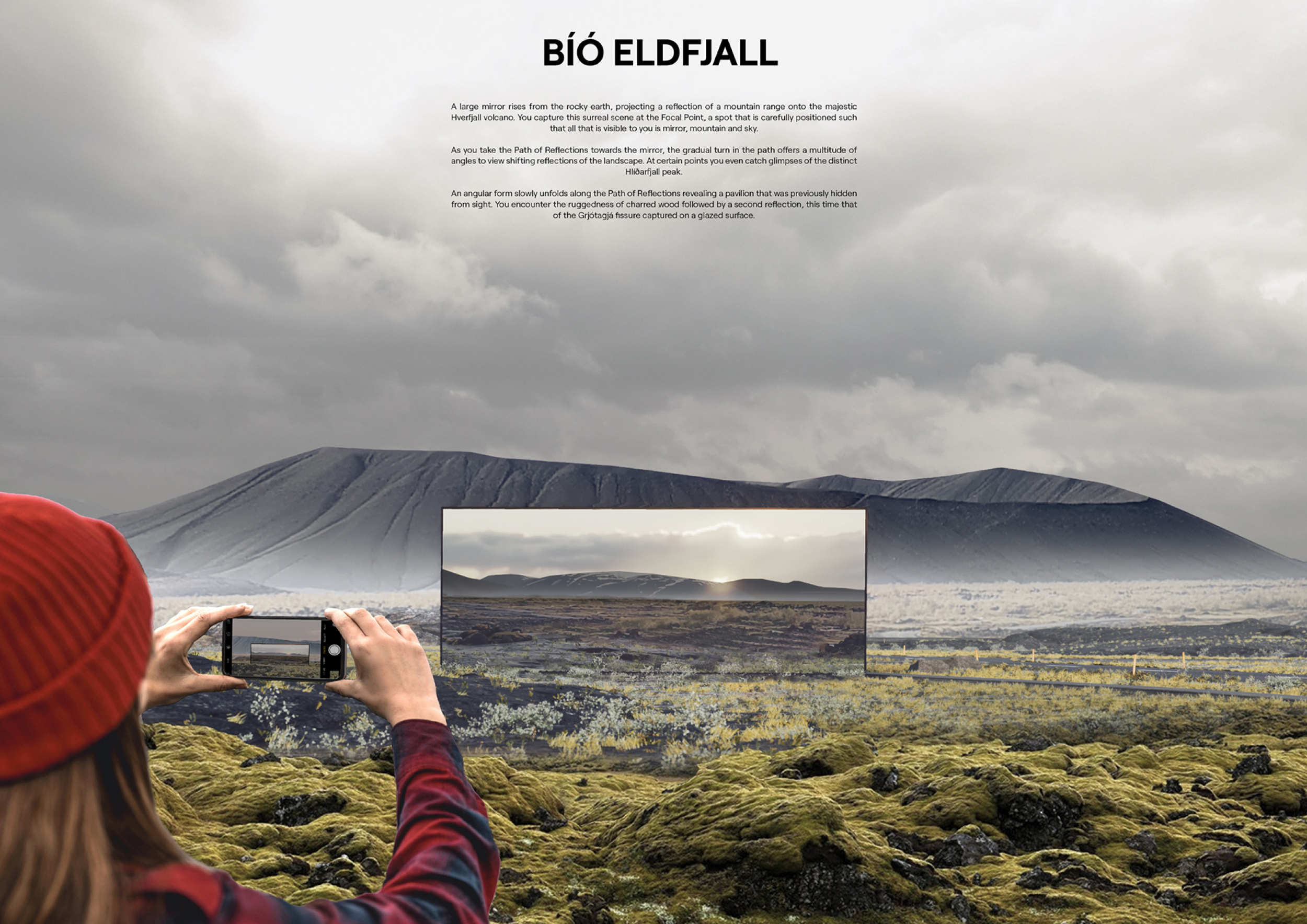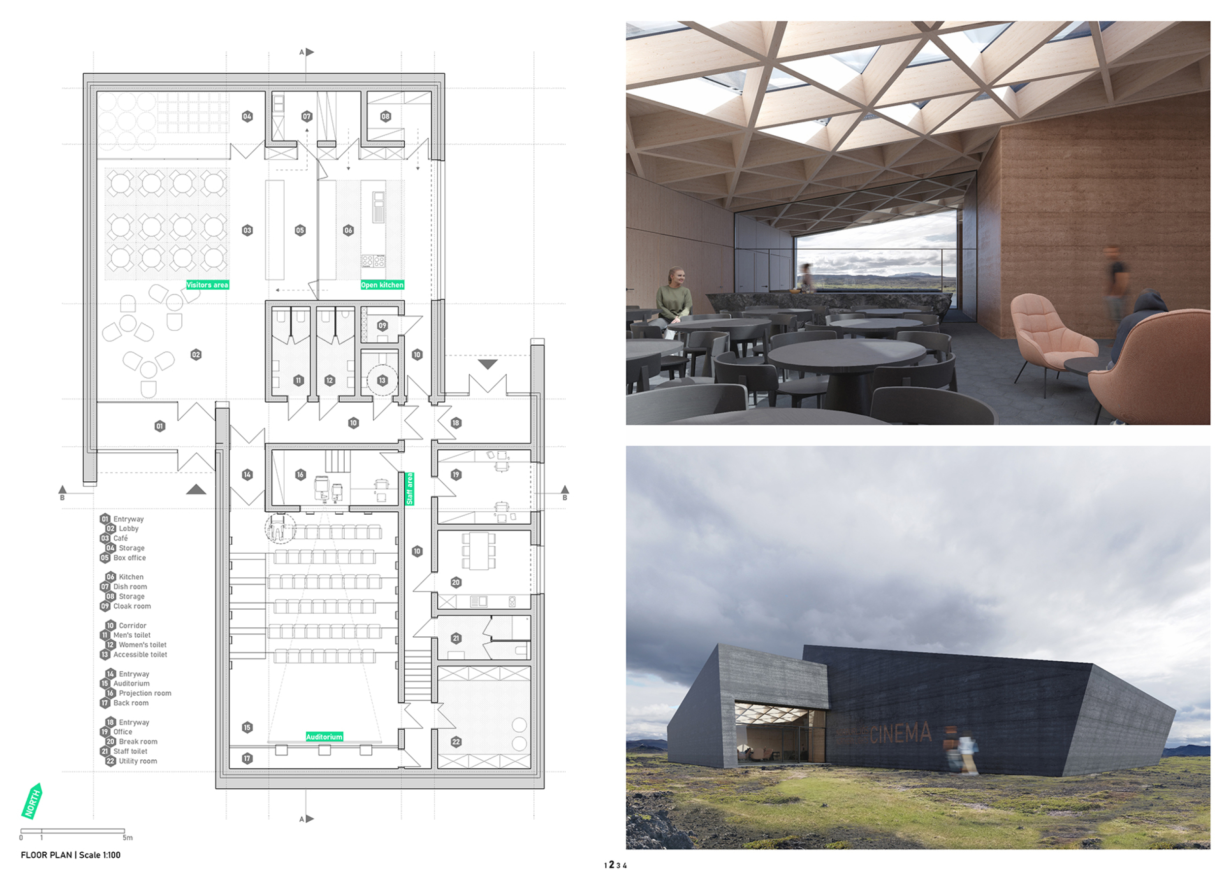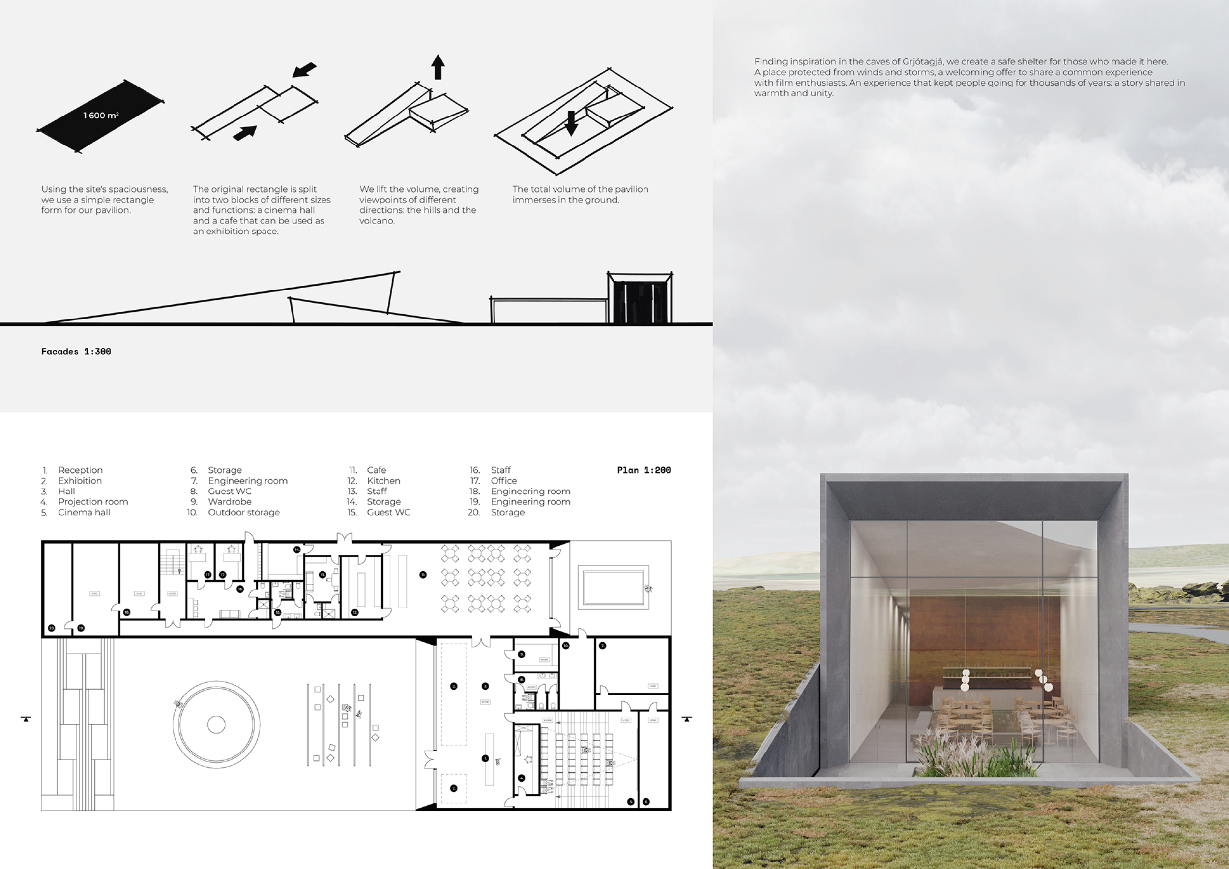 The Iceland Movie Pavilion competition sought designs for a movie pavilion in the Grjótagjá cave region located near Lake Mývatn in northern Iceland. It was asked that proposals reflect the essence of Icelandic cinema, its distinctive character and unique history, with the central focus being a small movie theater capable of hosting up to 50 visitors. The pavilion is envisioned to be a place to introduce visitors to Icelandic cinema, as well as one to offer fans a place to gather and share a passion for film.