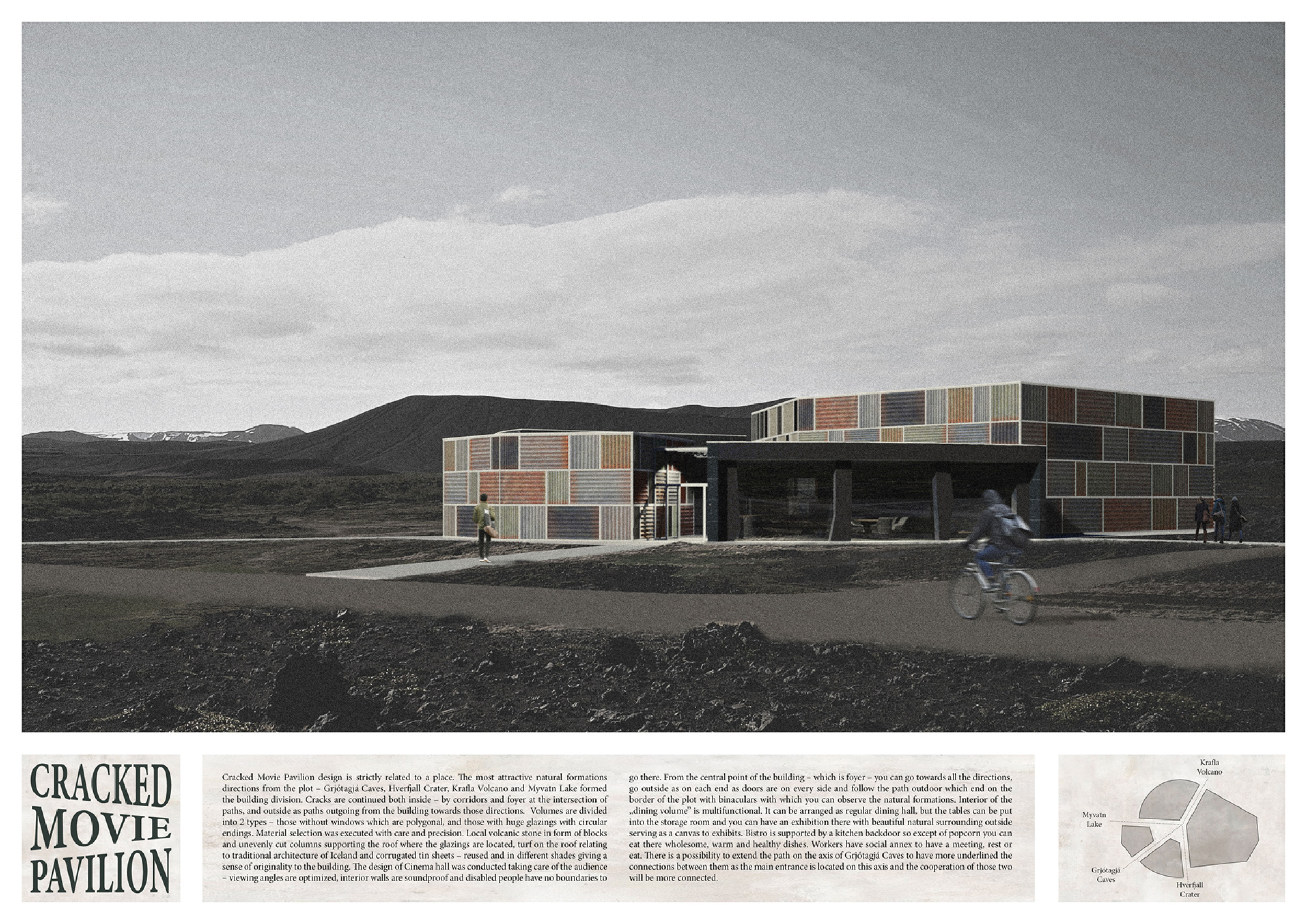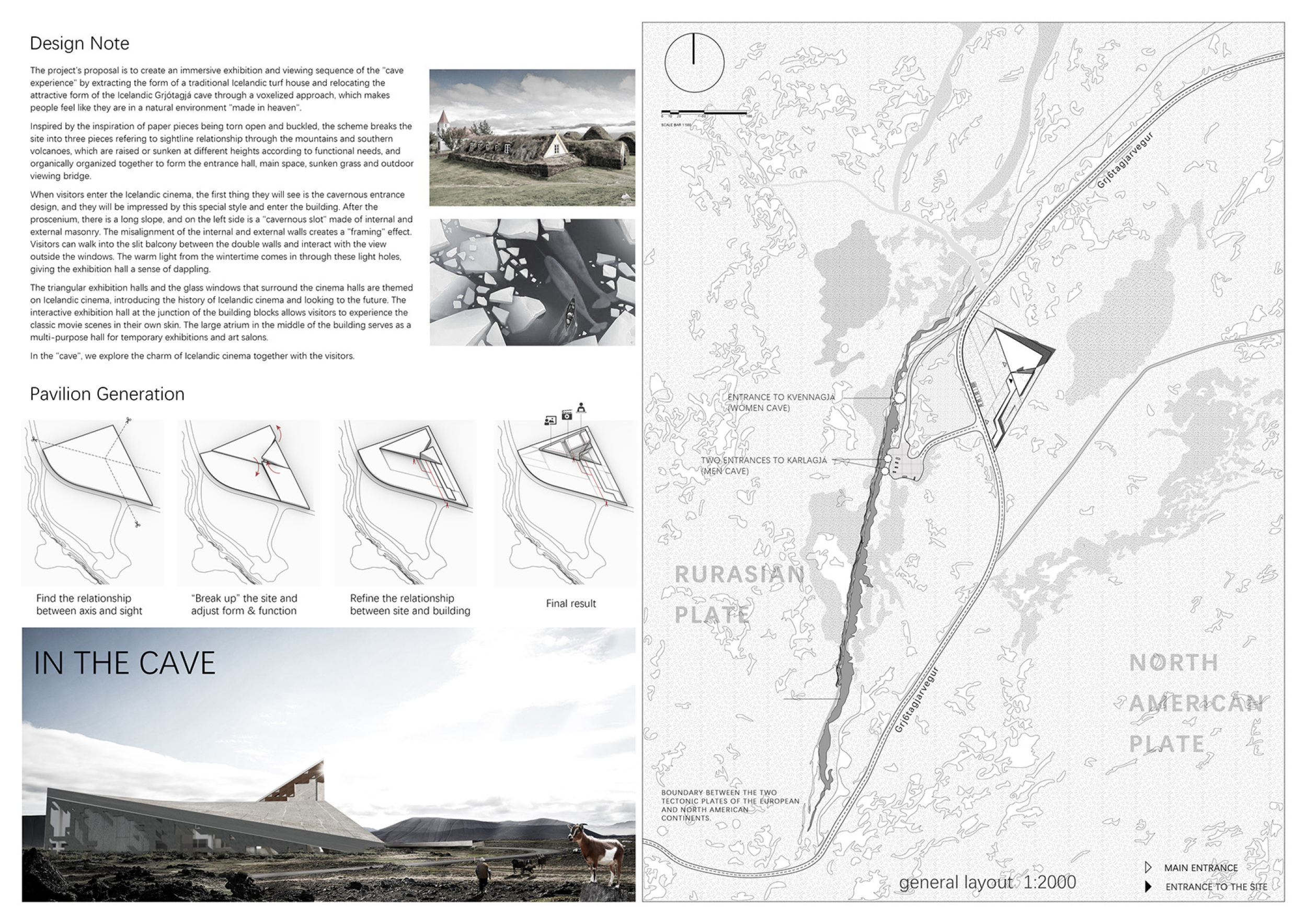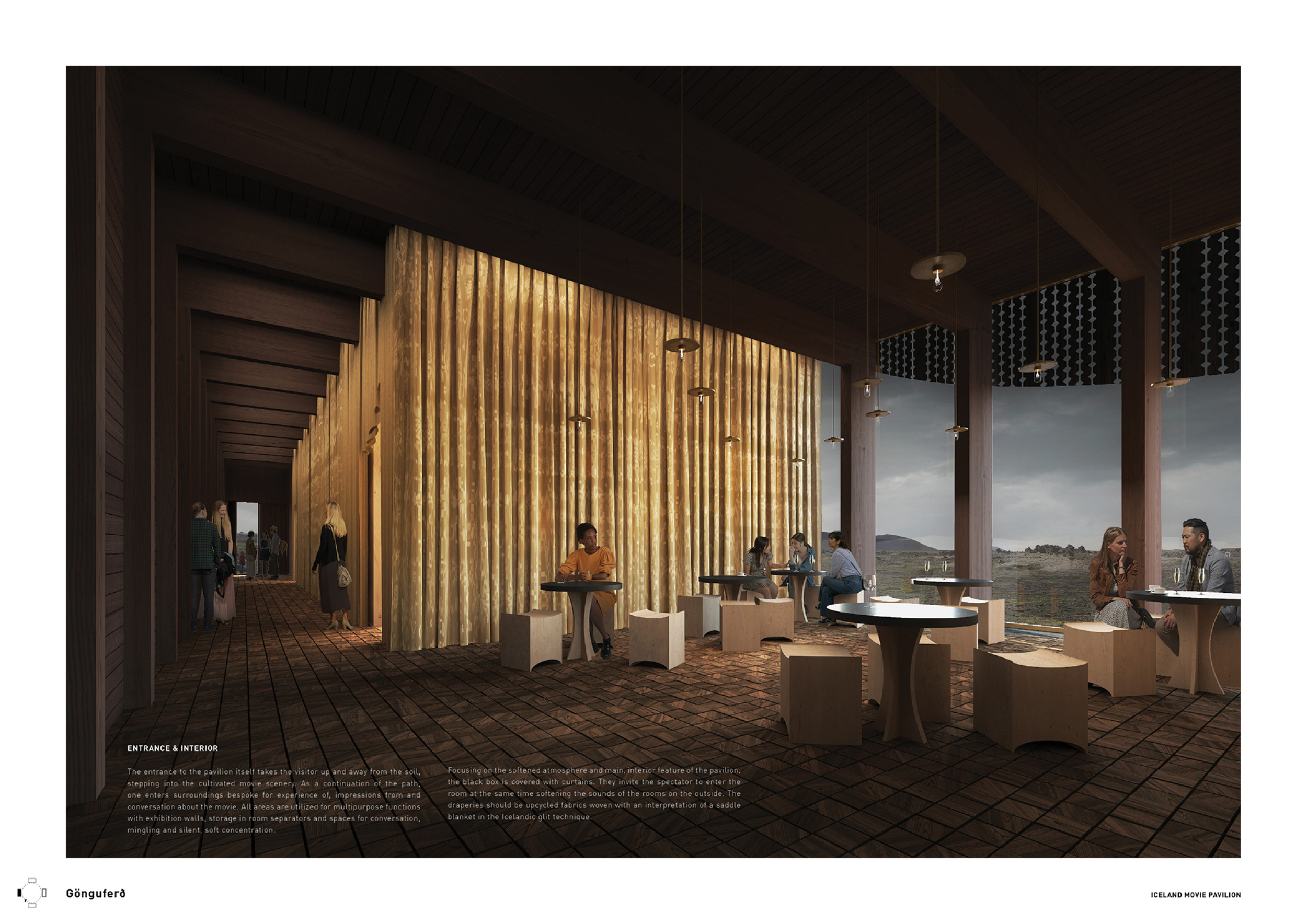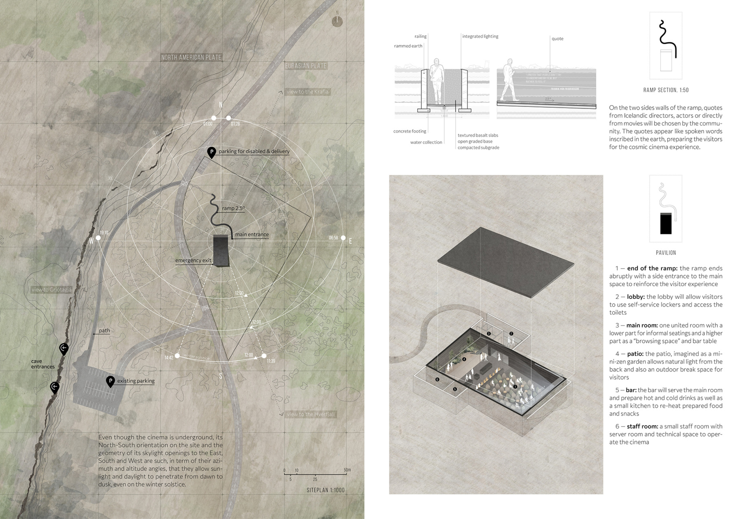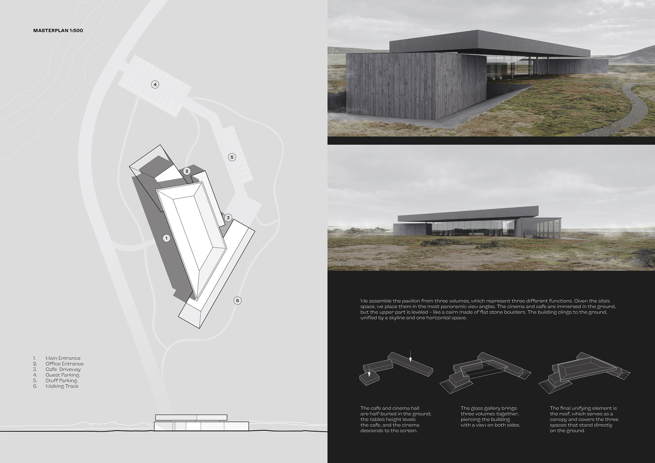 The Iceland Movie Pavilion competition sought designs for a movie pavilion in the Grjótagjá cave region located near Lake Mývatn in northern Iceland. It was asked that proposals reflect the essence of Icelandic cinema, its distinctive character and unique history, with the central focus being a small movie theater capable of hosting up to 50 visitors. The pavilion is envisioned to be a place to introduce visitors to Icelandic cinema, as well as one to offer fans a place to gather and share a passion for film.